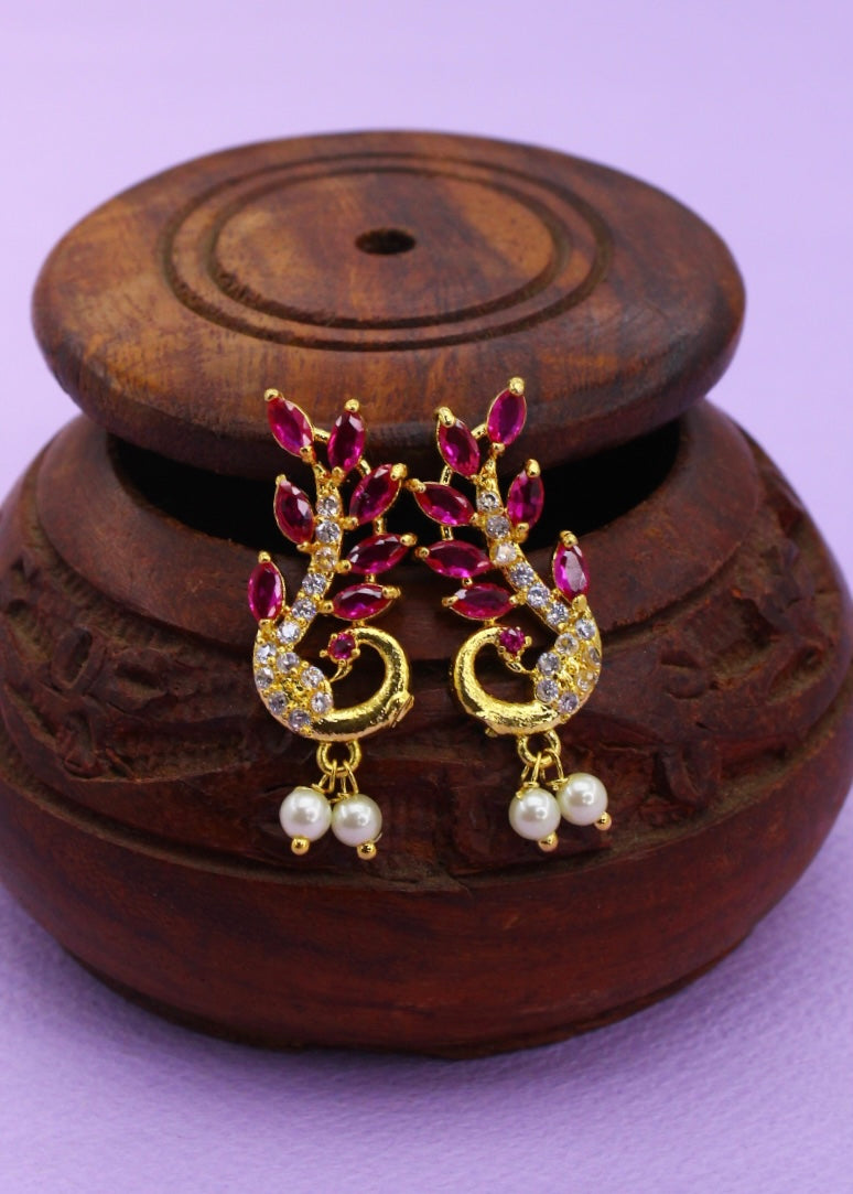 Must have in your accessory collection this pair of Peacock design pearl adorable earrings from Sonchafa Jewellery. They are embedded with shiny pink, white stones and pearl beads. These are crafted from golden finish metal and long lasting. These earrings are skin-friendly and ensures high durability.