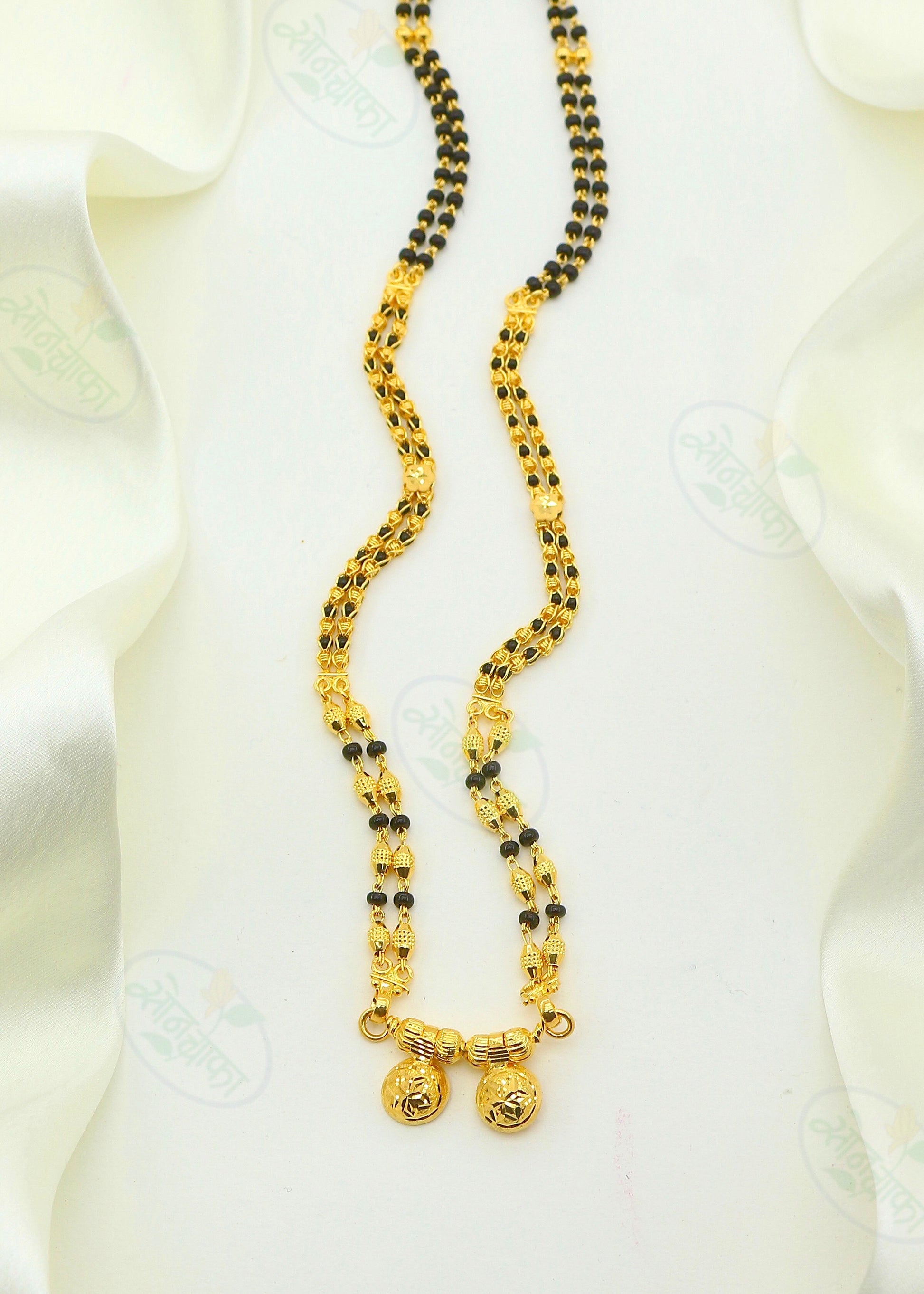 Gold plated adorable wati pendant mangalsutra set from Sonchafa Jewellery is best pick for modern married women. The pendant is studded with black beads mina work and feature detail intricate carving design.