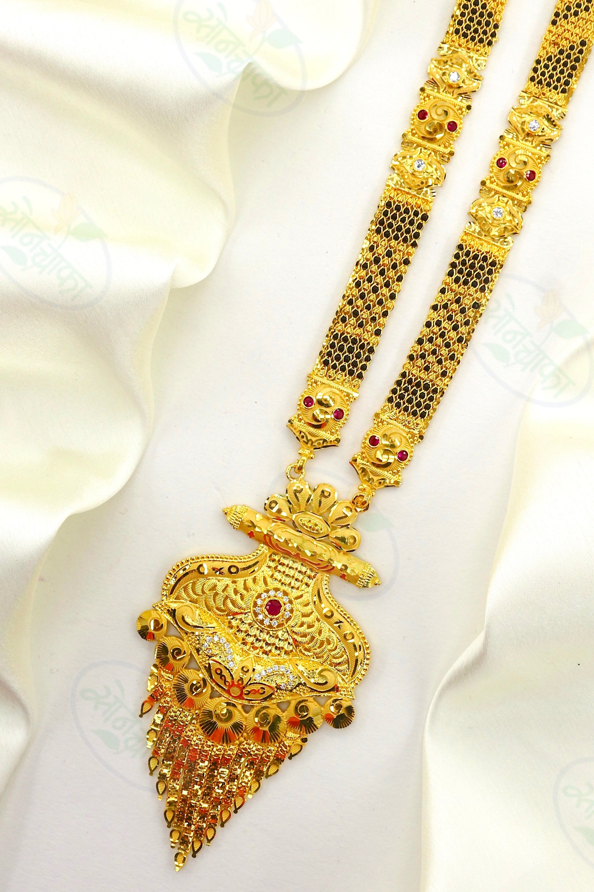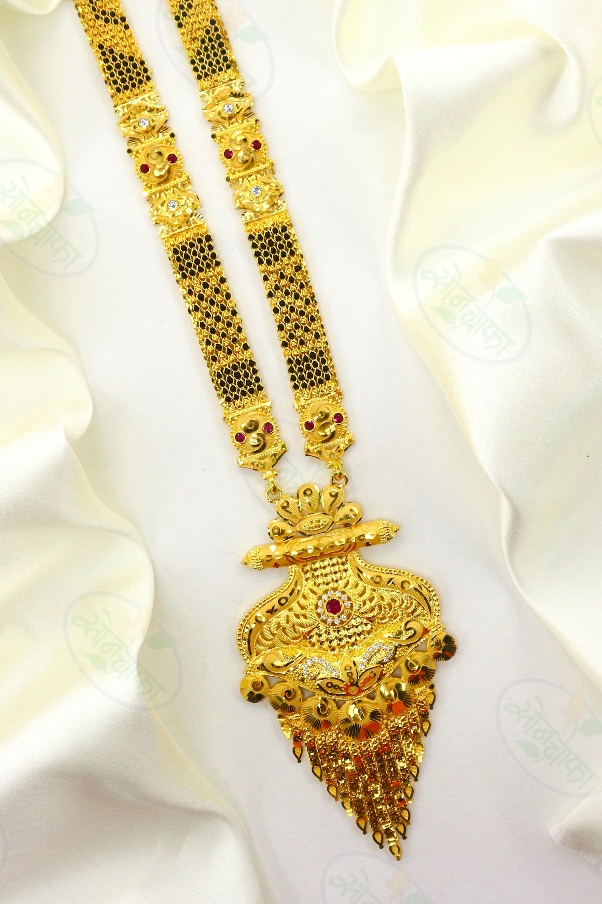 Try something new by adorning this beautiful pendant designer mangalsutra. This 1 gram gold patti mangalsutra is superior in quality. It is easy to wear and comfortable to hold all day long. It is long lasting and ensures high durability.