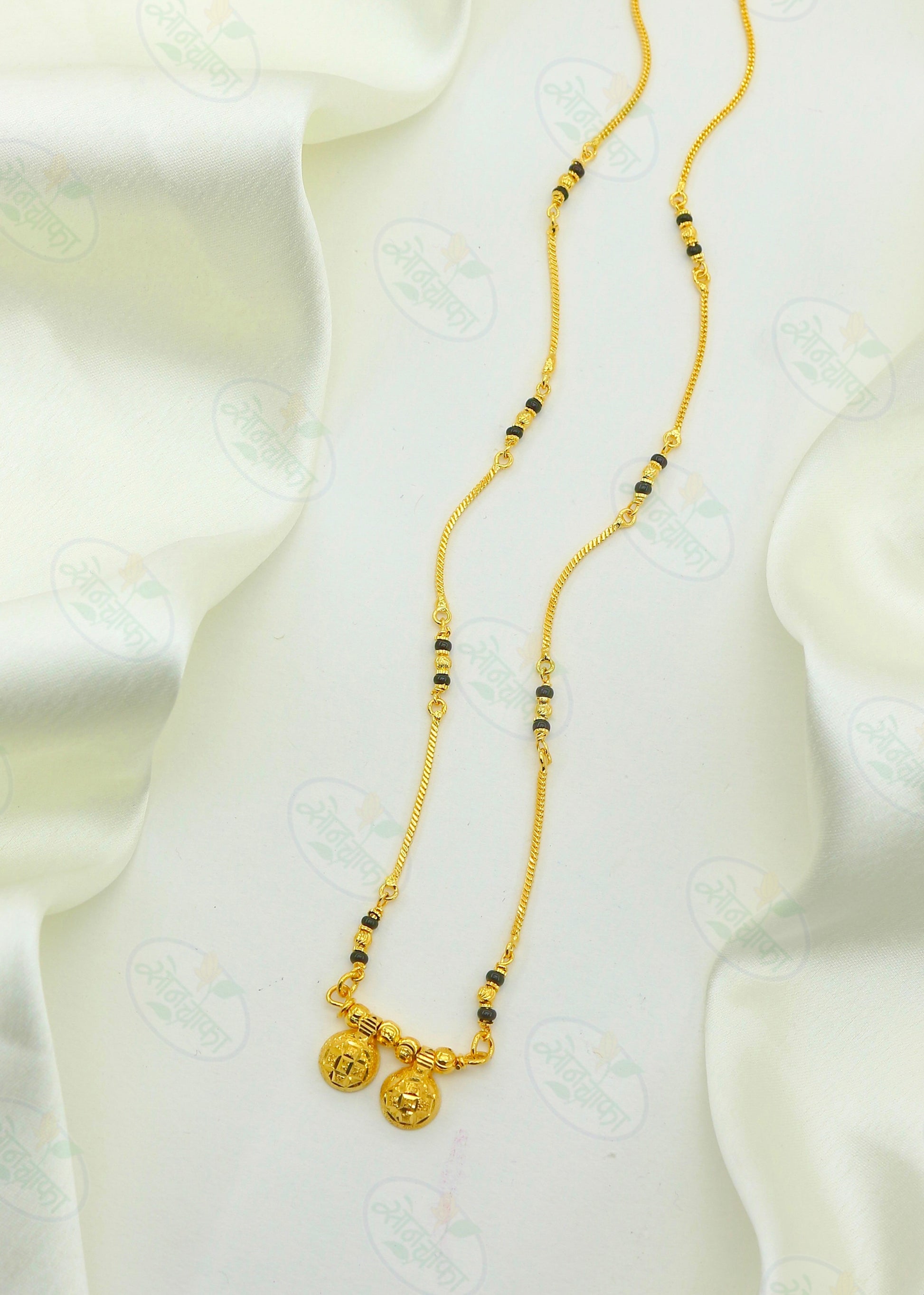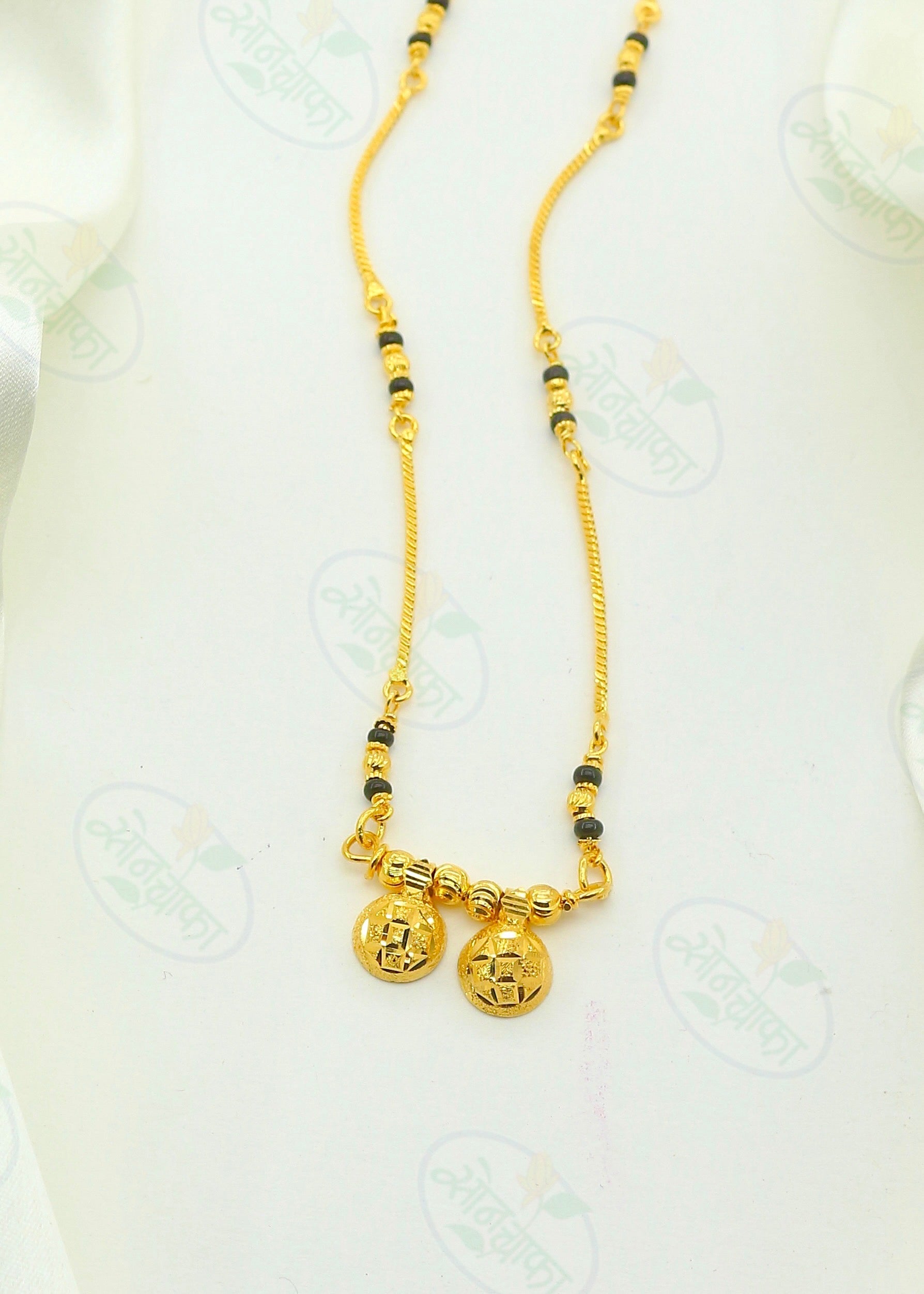 Gold plated adorable wati pendant mangalsutra set from Sonchafa Jewellery is best pick for modern married women. The pendant is studded with black beads mina work and feature detail intricate carving design.