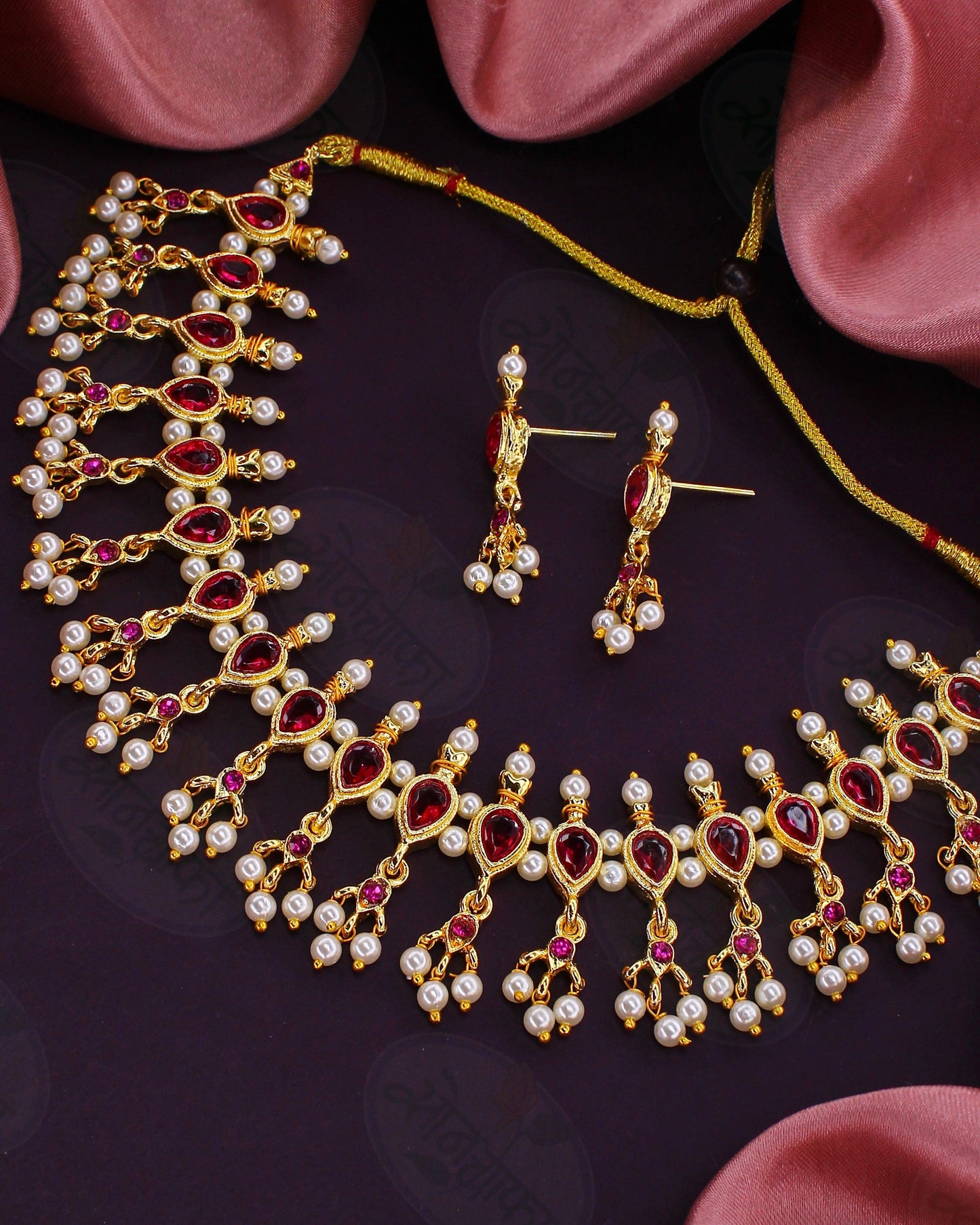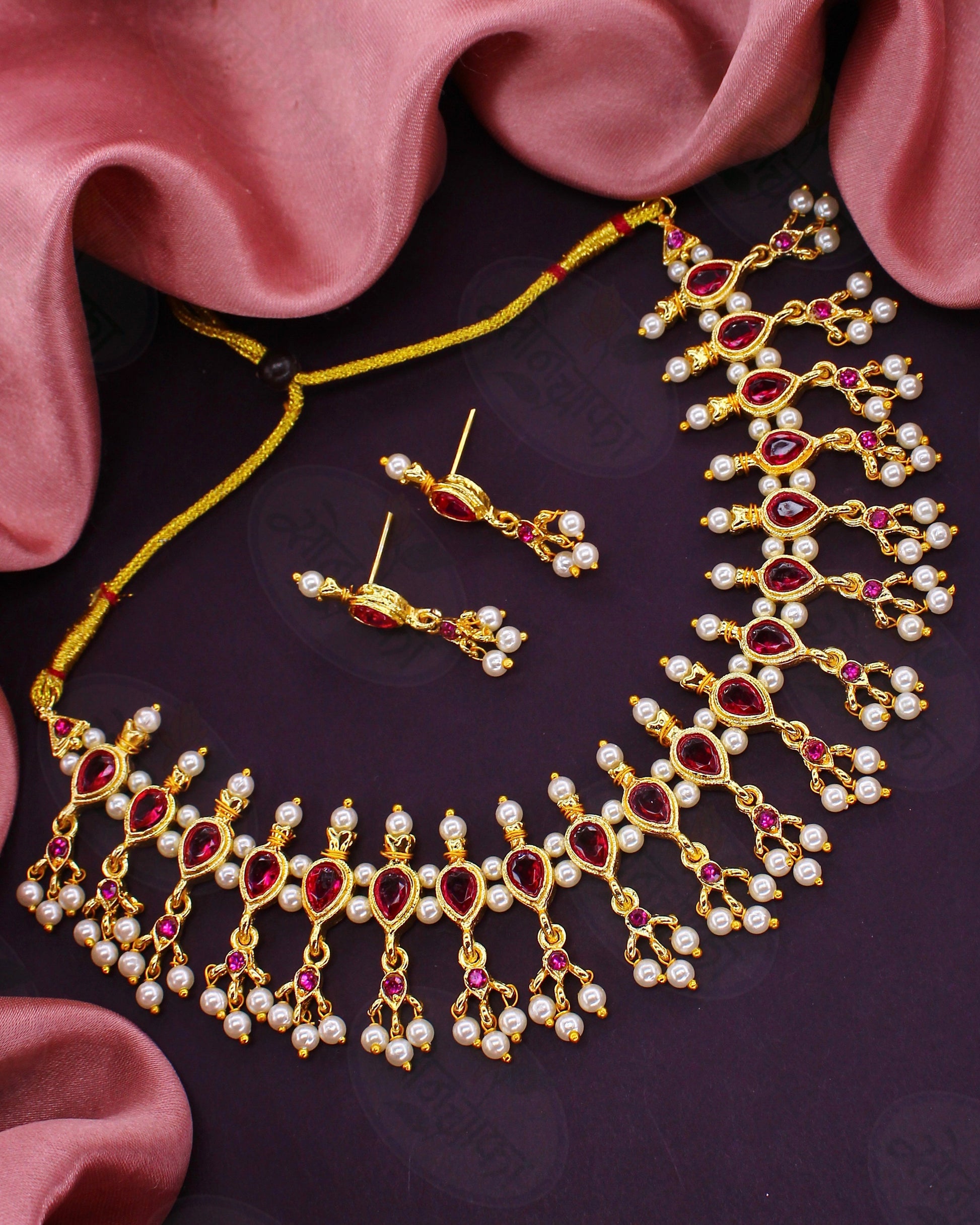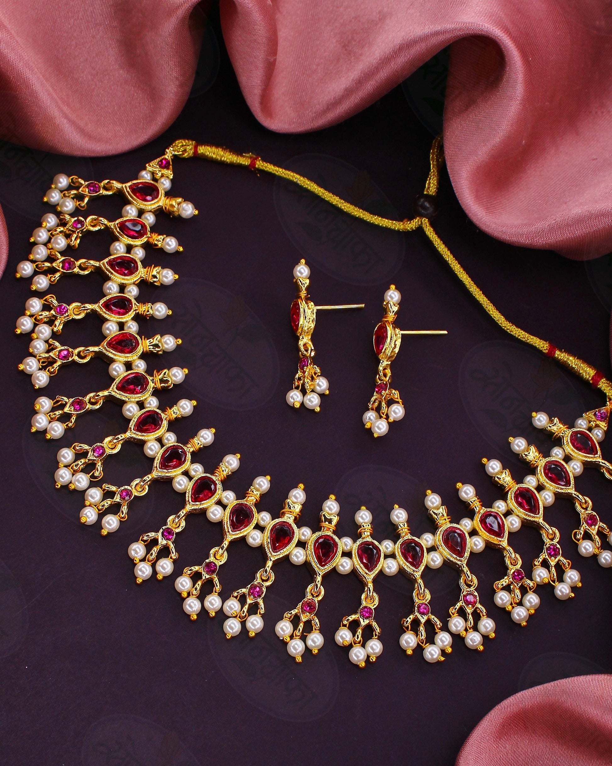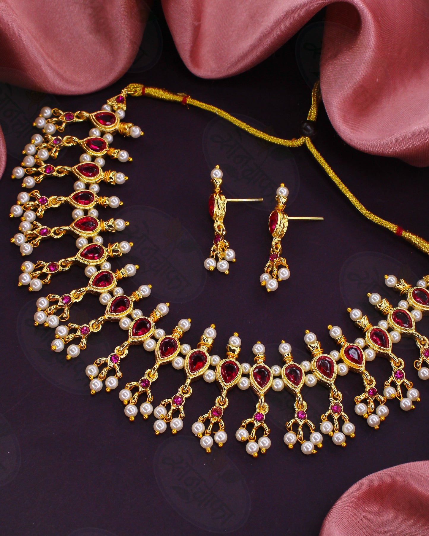 Complete your Maharashtrian look by clubbing this pink stone adorable long Moti necklace with your festive costume. The pendant is studded with sparkling multi colour stones. It is beautifully woven with pearl beads and made from golden finish metal. This traditional long necklace set is superior in quality and rust-resistant as well.