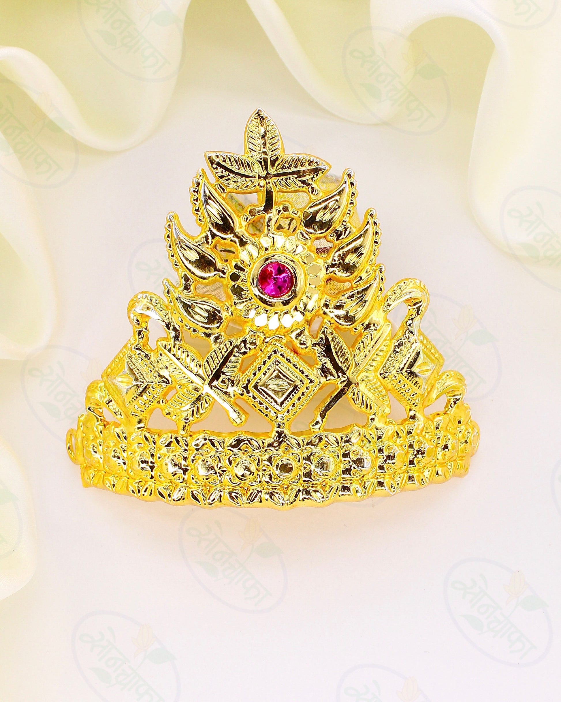 Specially designed for your ganesha this floral ganpati mukut from Sonchafa Jewellers. This piece of jewellery is very much adorable and made from golden finish metal. It is studded with glossy pink stone at middle for attractive look. It has an adjustable back dori.