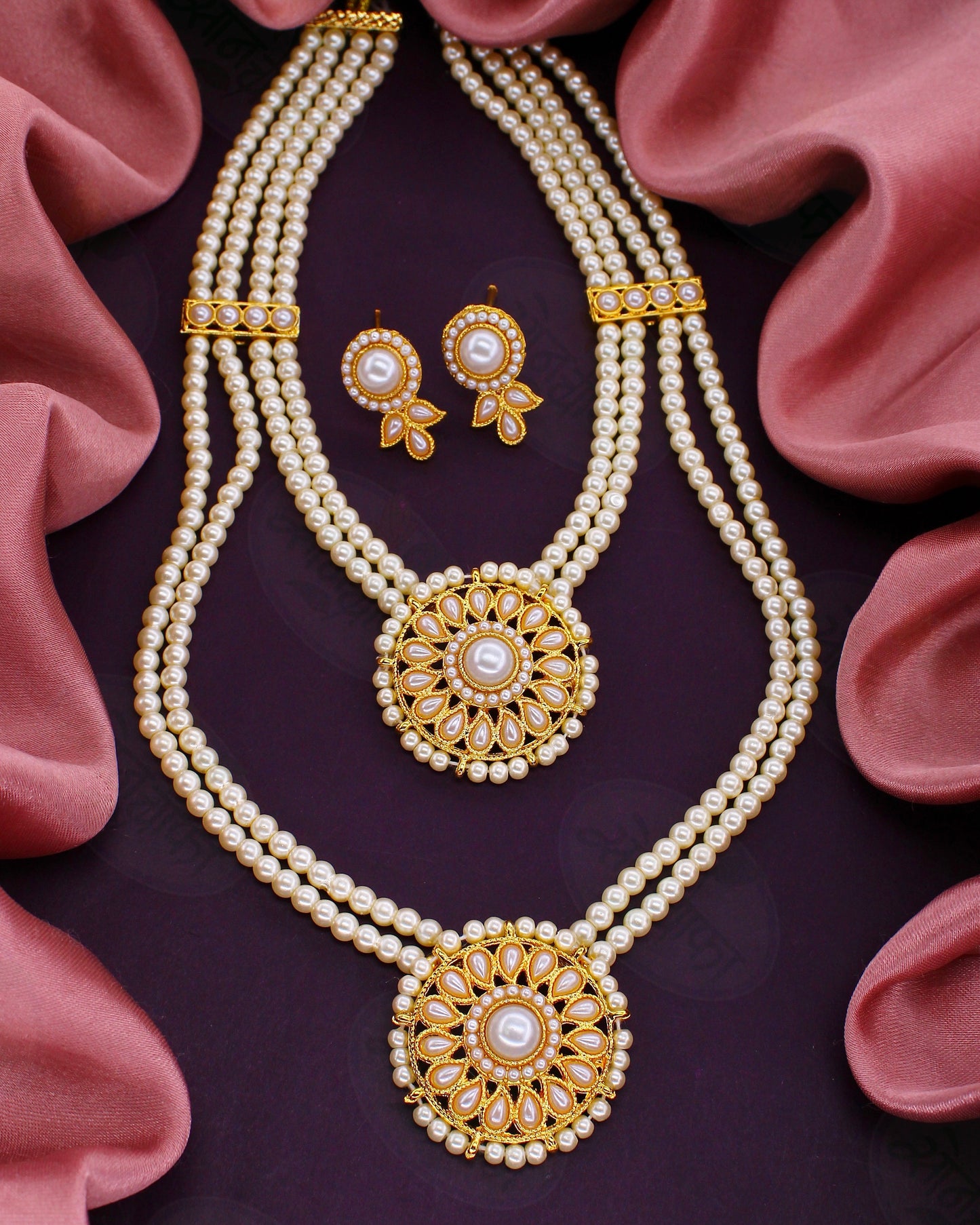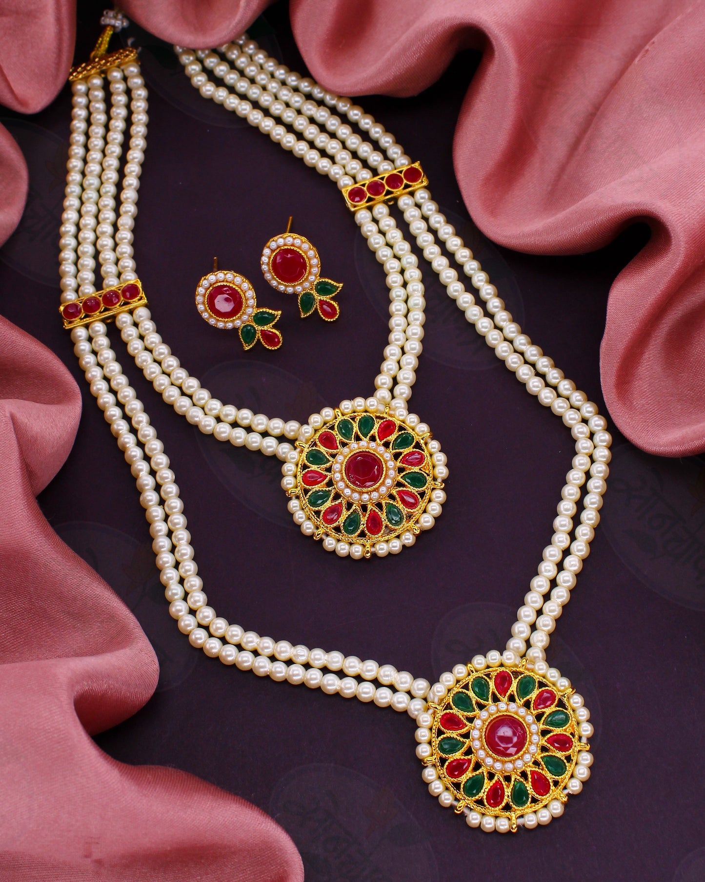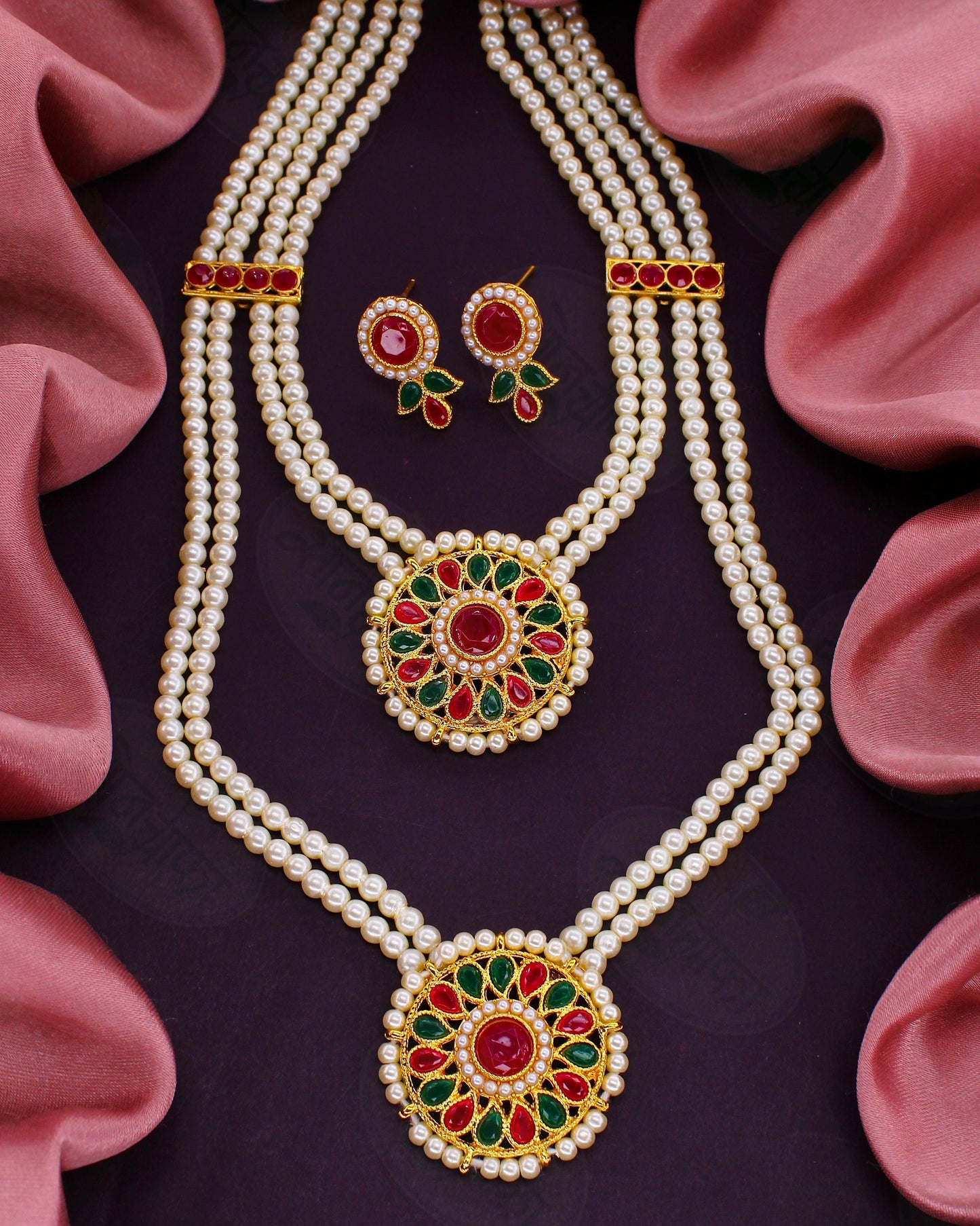 Add extra elegance to your appearance by adorning this three layer golden finish moti necklace set with your fancy attires from Sonchafa Jewellers. The design of this necklace is so wonderful and amazing that will make you look outstanding. It has pearl bead droplets for added attraction.