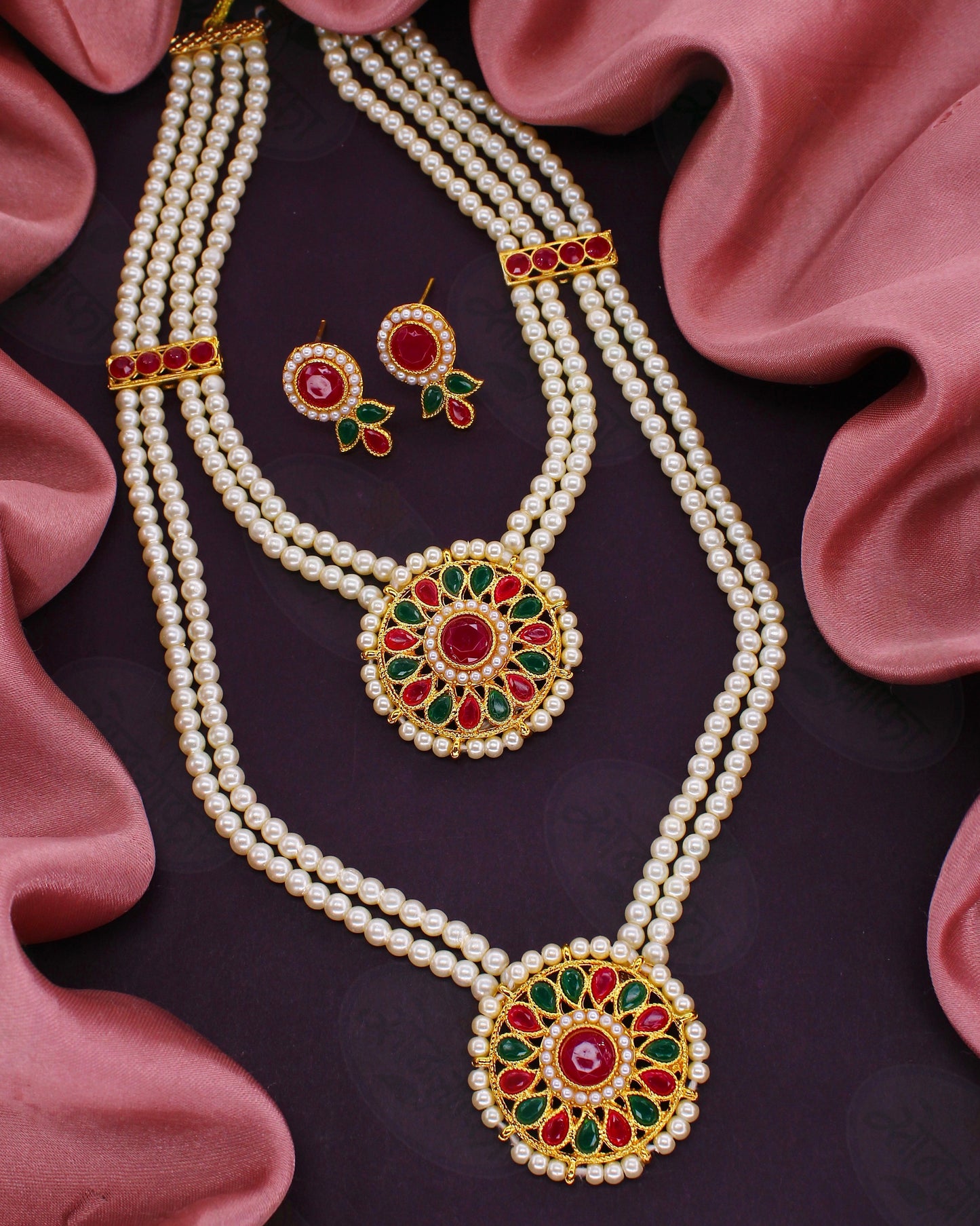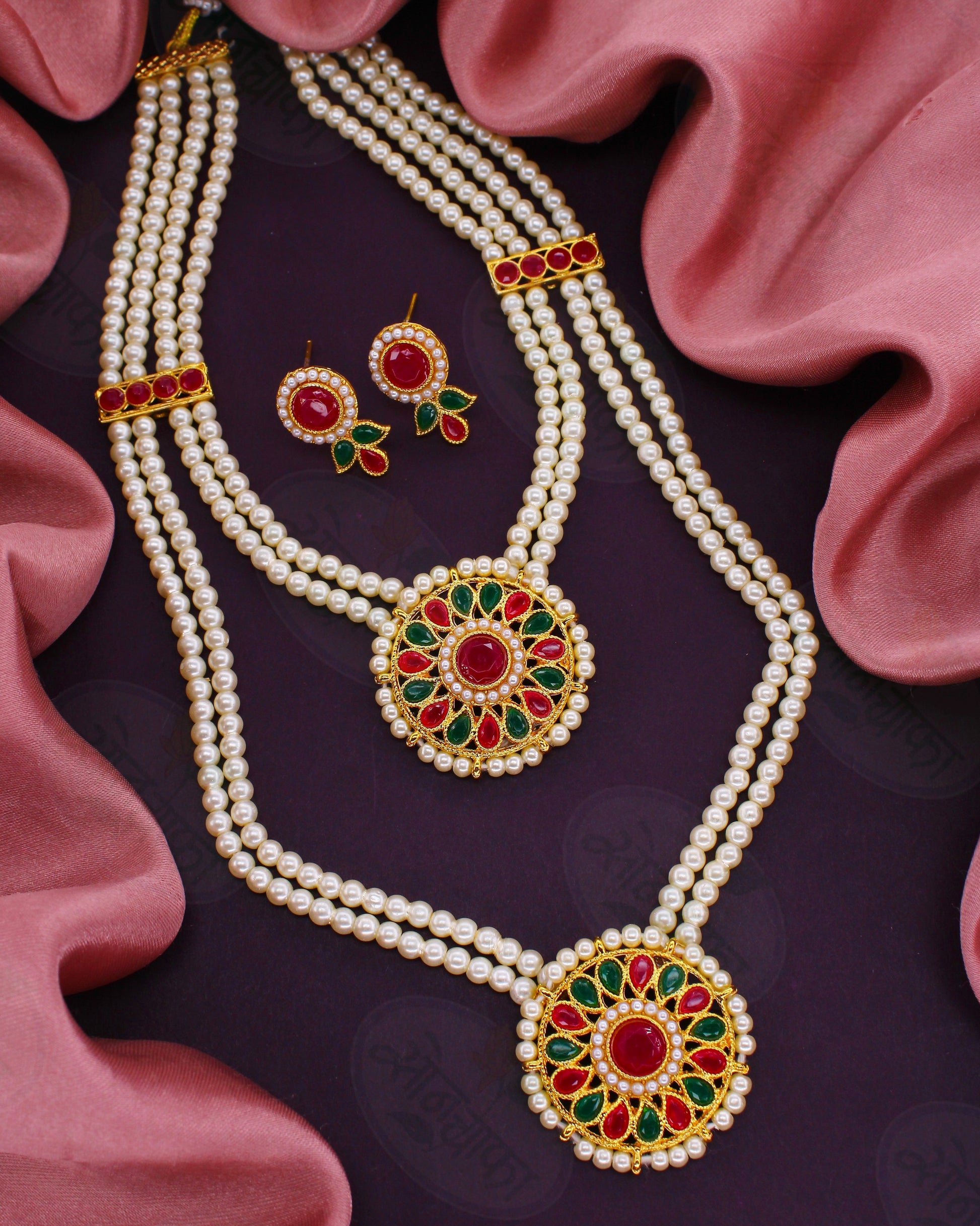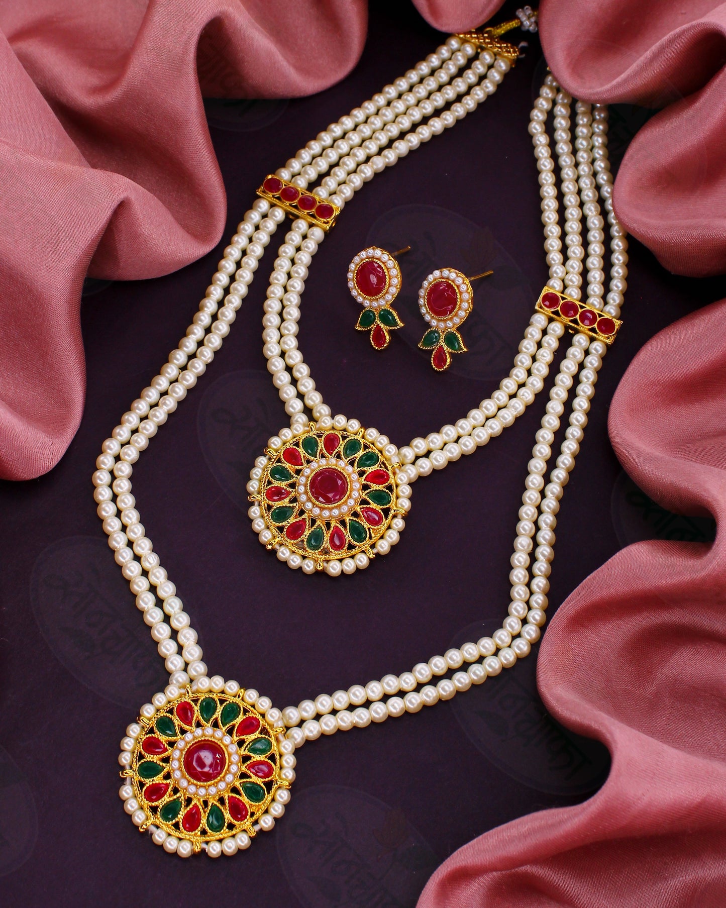 Add extra elegance to your appearance by adorning this three layer golden finish moti necklace set with your fancy attires from Sonchafa Jewellers. The design of this necklace is so wonderful and amazing that will make you look outstanding. It has pearl bead droplets for added attraction.