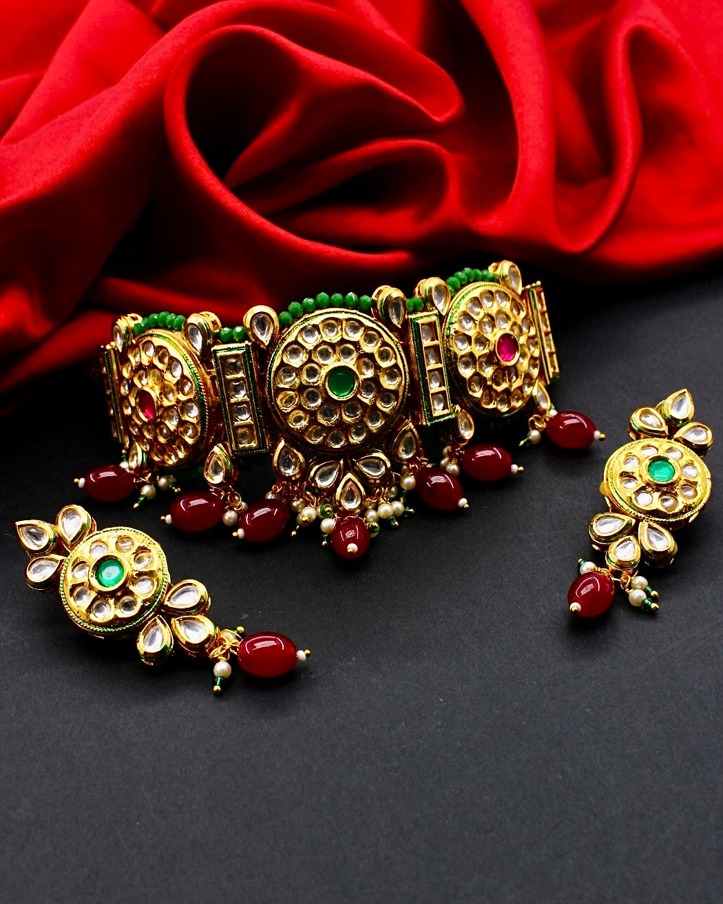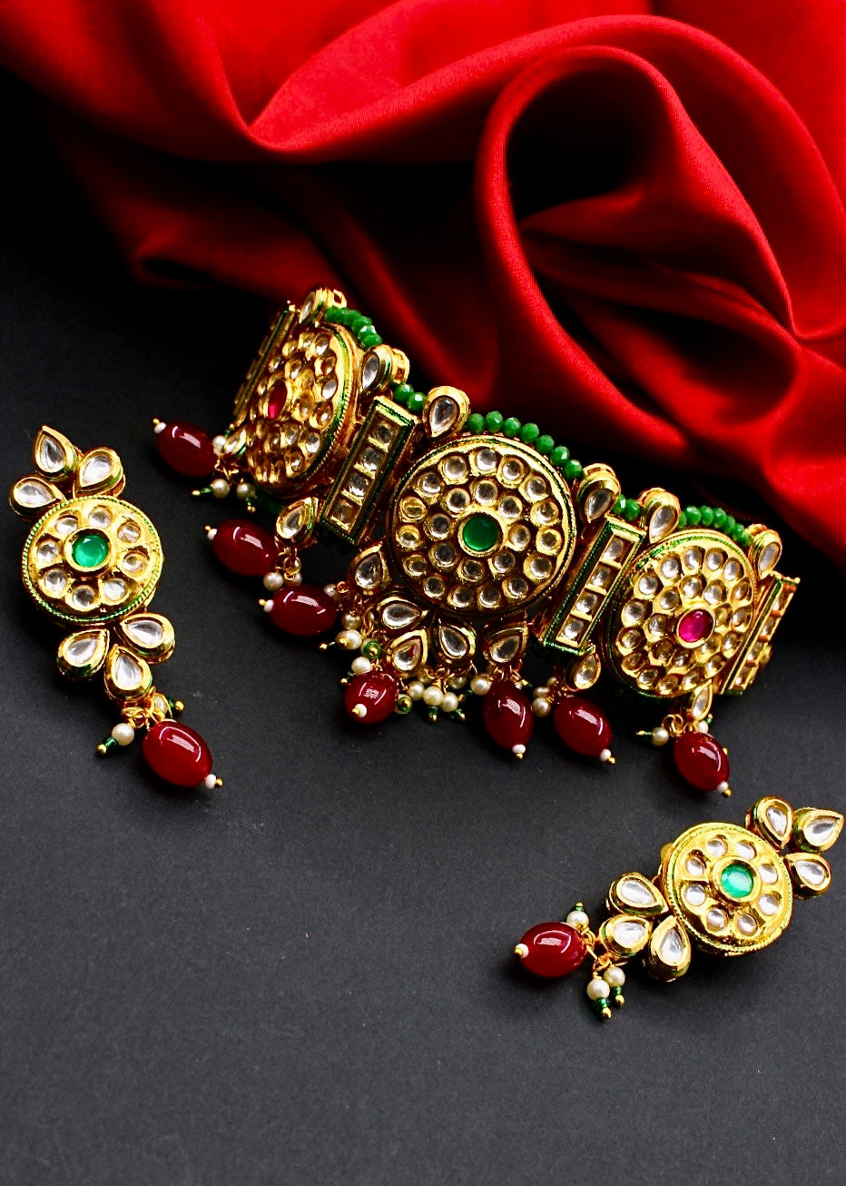 Add a Rajasthani touch to your overall appearance by clubbing this beautiful kundan necklace set. It feature flawless kundan work and made from golden finish metal. This necklace is good in quality and will be your fashion companion for many years. In addition the necklace is attached with adjustable dori, so that you can fit it properly.