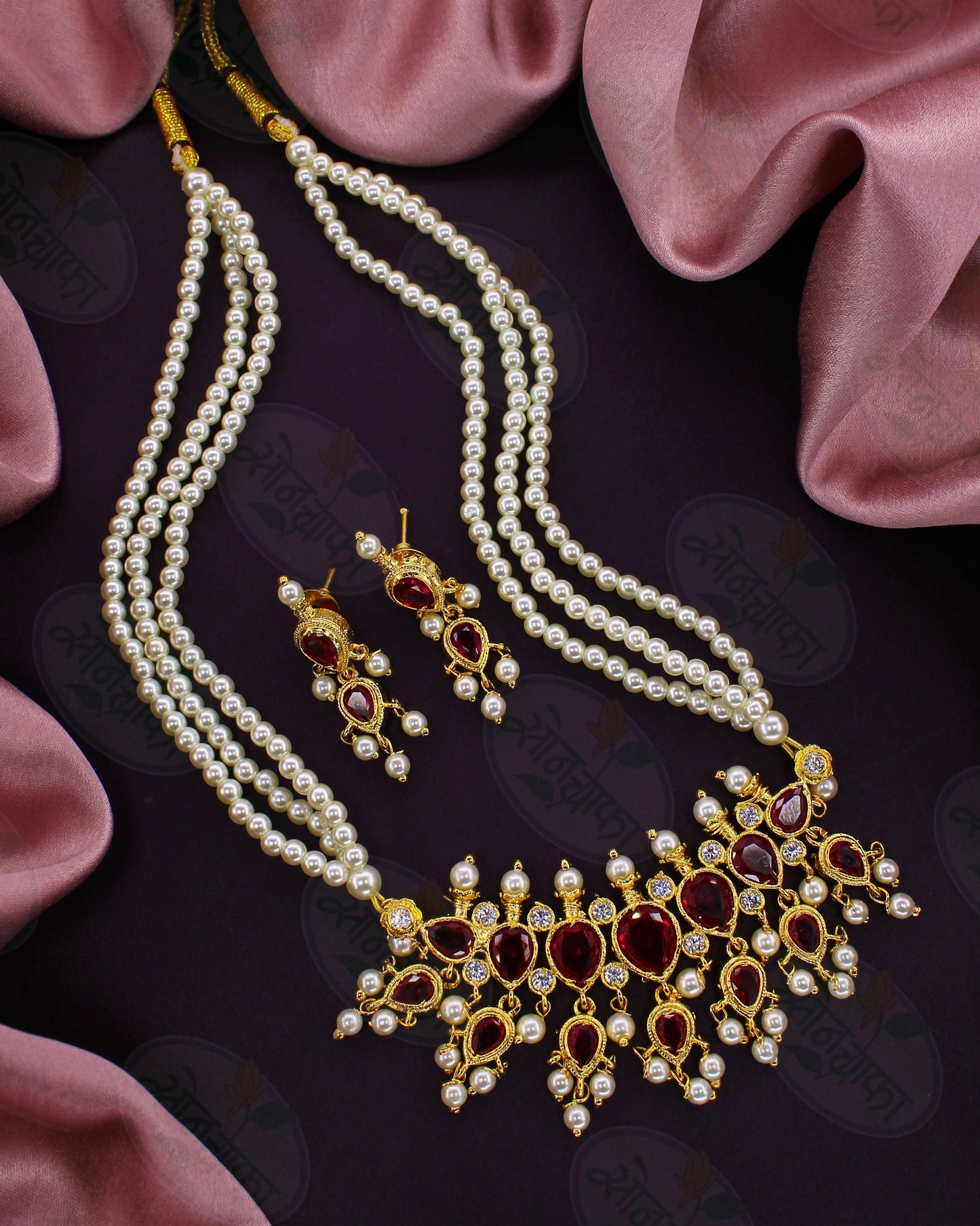 This beautiful Puneri Moti Tanmani inspired necklace for women who love to wear traditional jewellery. The pendant is studded with sparkling green -white colour stones and has white pearl droplets for added attraction. It is fashioned from golden finish metal and ensures high durability.This set is made from golden polished metal & will go well with traditional saree.