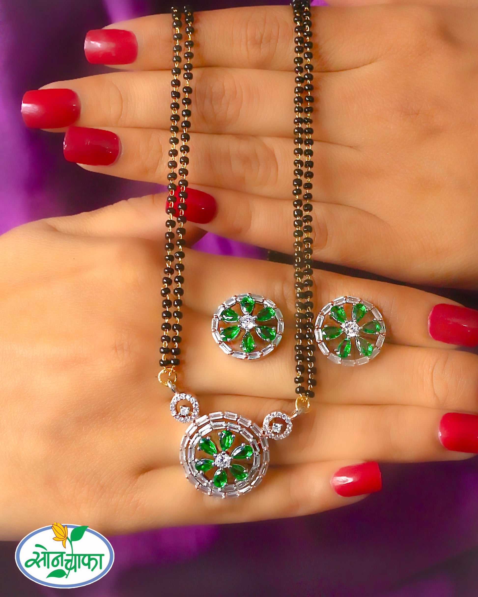 If you are married then you must pick this wonderful mangalsutra from the house of Sonchafa Jewellery. It is studded with sparkling white stones and made from rose gold finish metal. The pendant is attached to three layer of black beaded chain. It is superior in quality and will retain its shine for years to come.