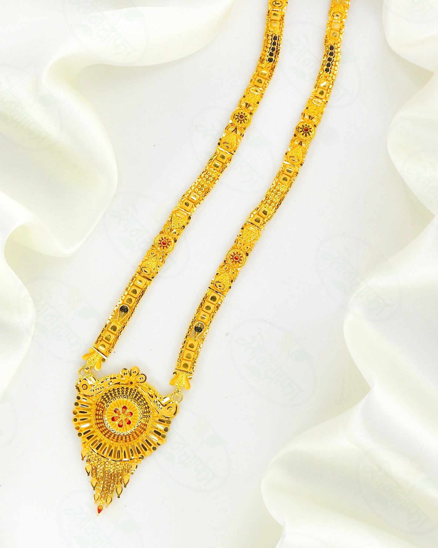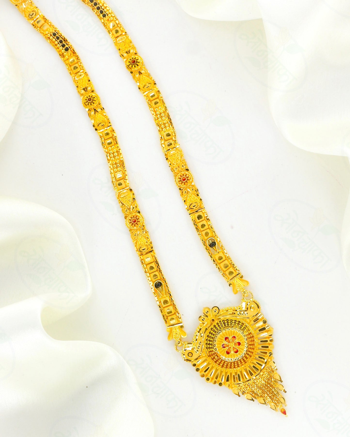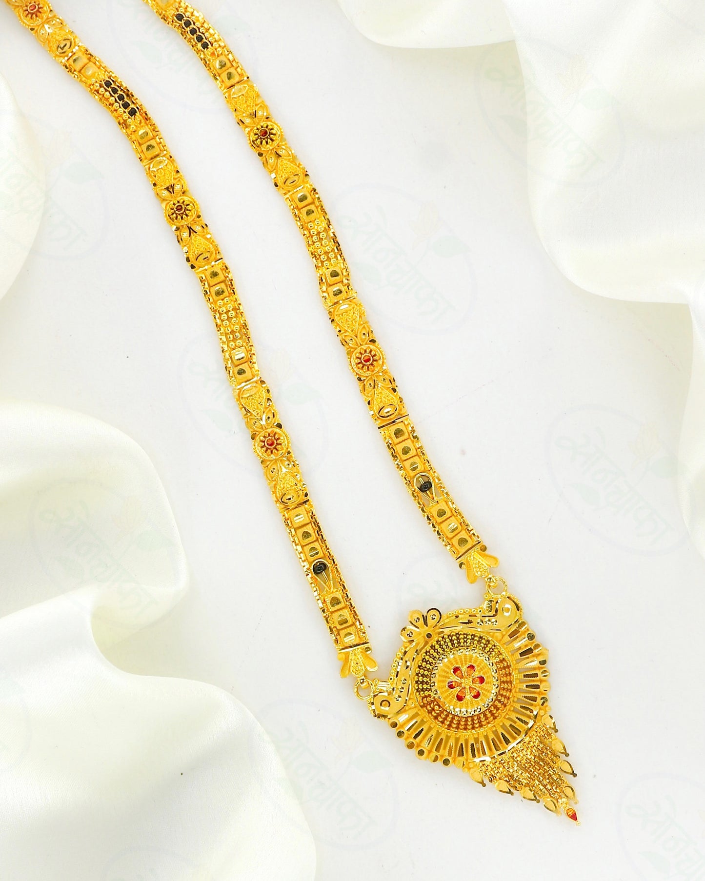 Sonchafa Jewellers presenting this appealing designer long patti mangalsutra for women. It is crafted from superior quality metal and ensures high durability. The pendent has dangled golden chains for more attraction. It is perfect for your classy look. So, grab this mangalsutra and turn many heads towards you.