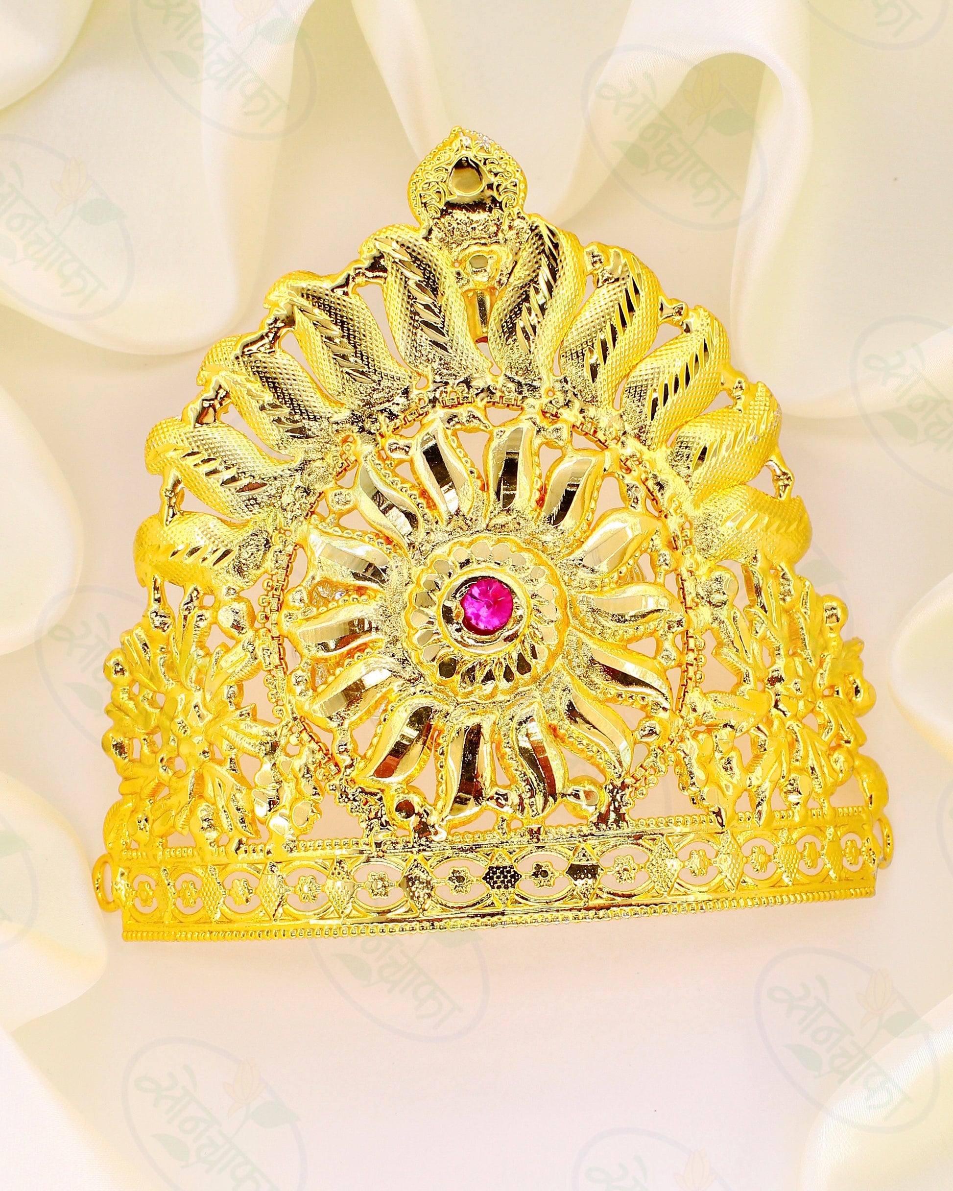 Specially designed for your ganesha this floral ganpati mukut from Sonchafa Jewellers. This piece of jewellery is very much adorable and made from golden finish metal. It is studded with glossy pink stone at middle for attractive look. It has an adjustable back dori.