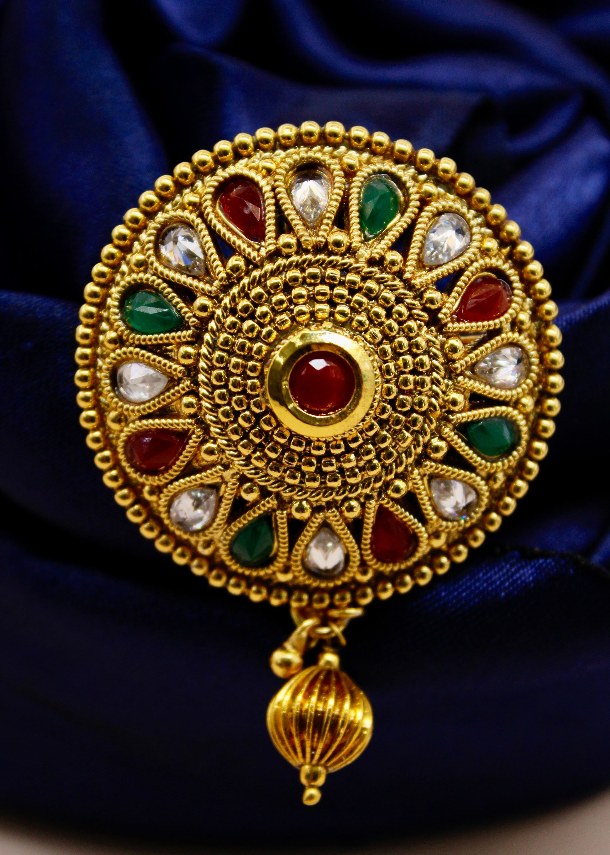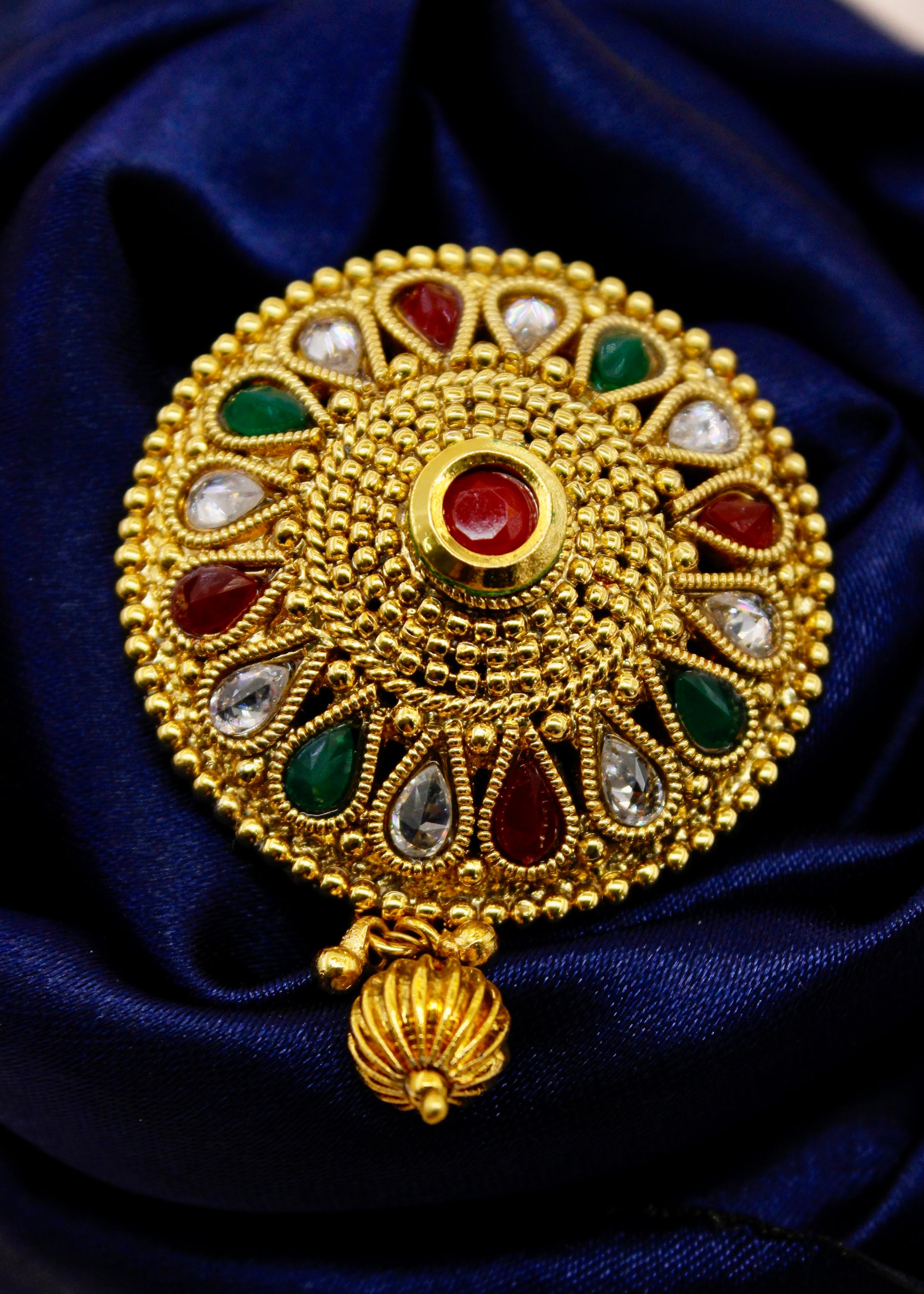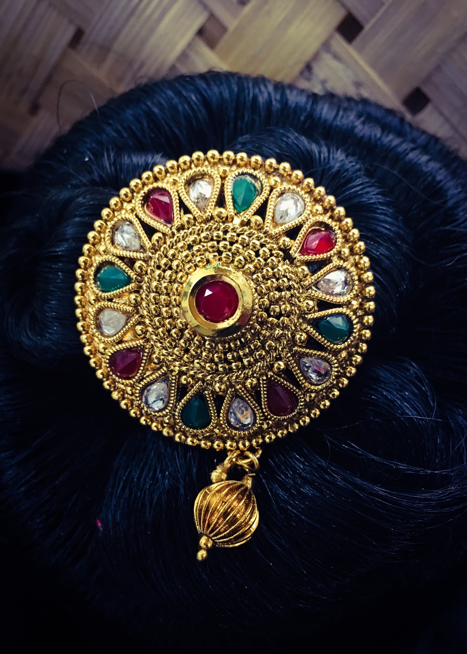 Excellently designed this round shape multi colour beautiful hair brooch is best to team with traditional apparel. It is embedded with sparkling pink, green, white colour stones and made from golden finish metal. This bun pin will surely beautify your hair style.