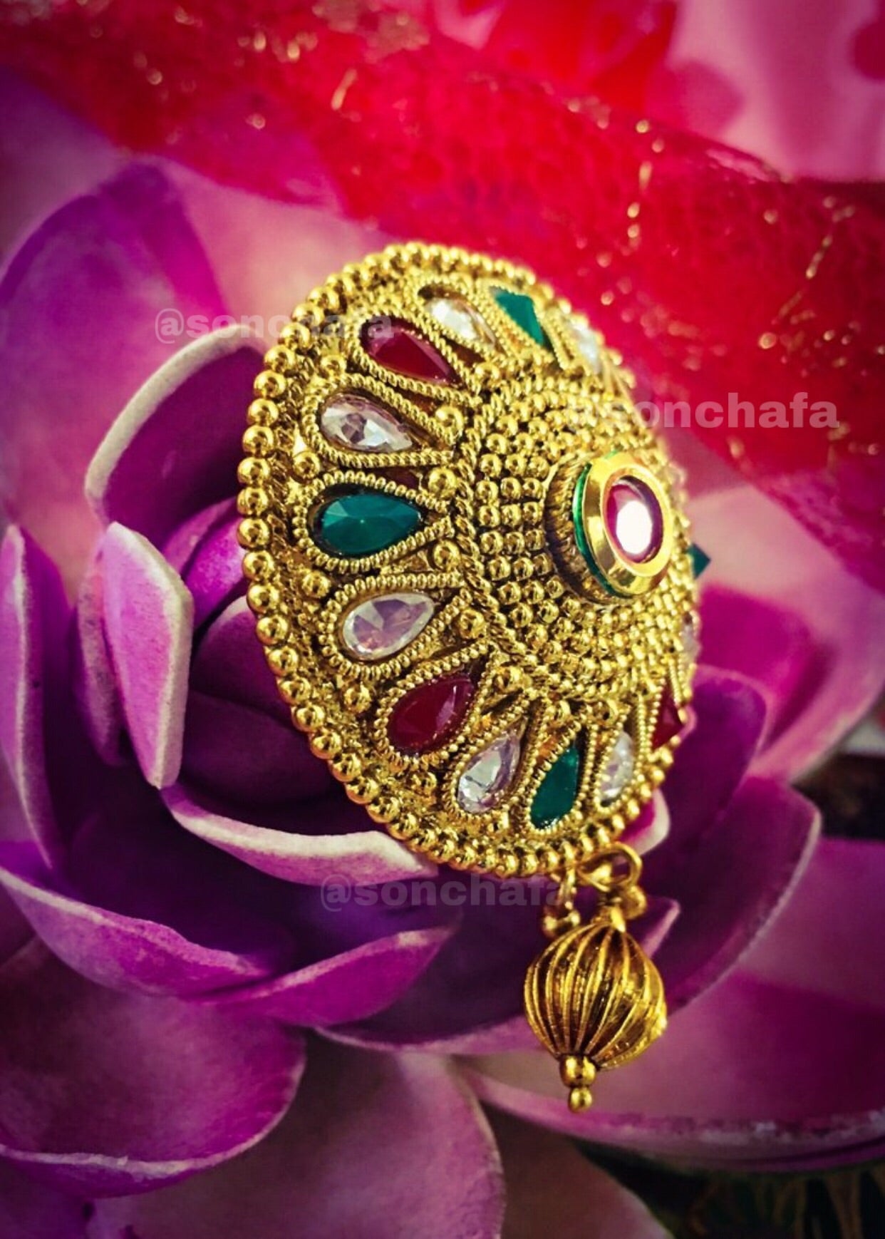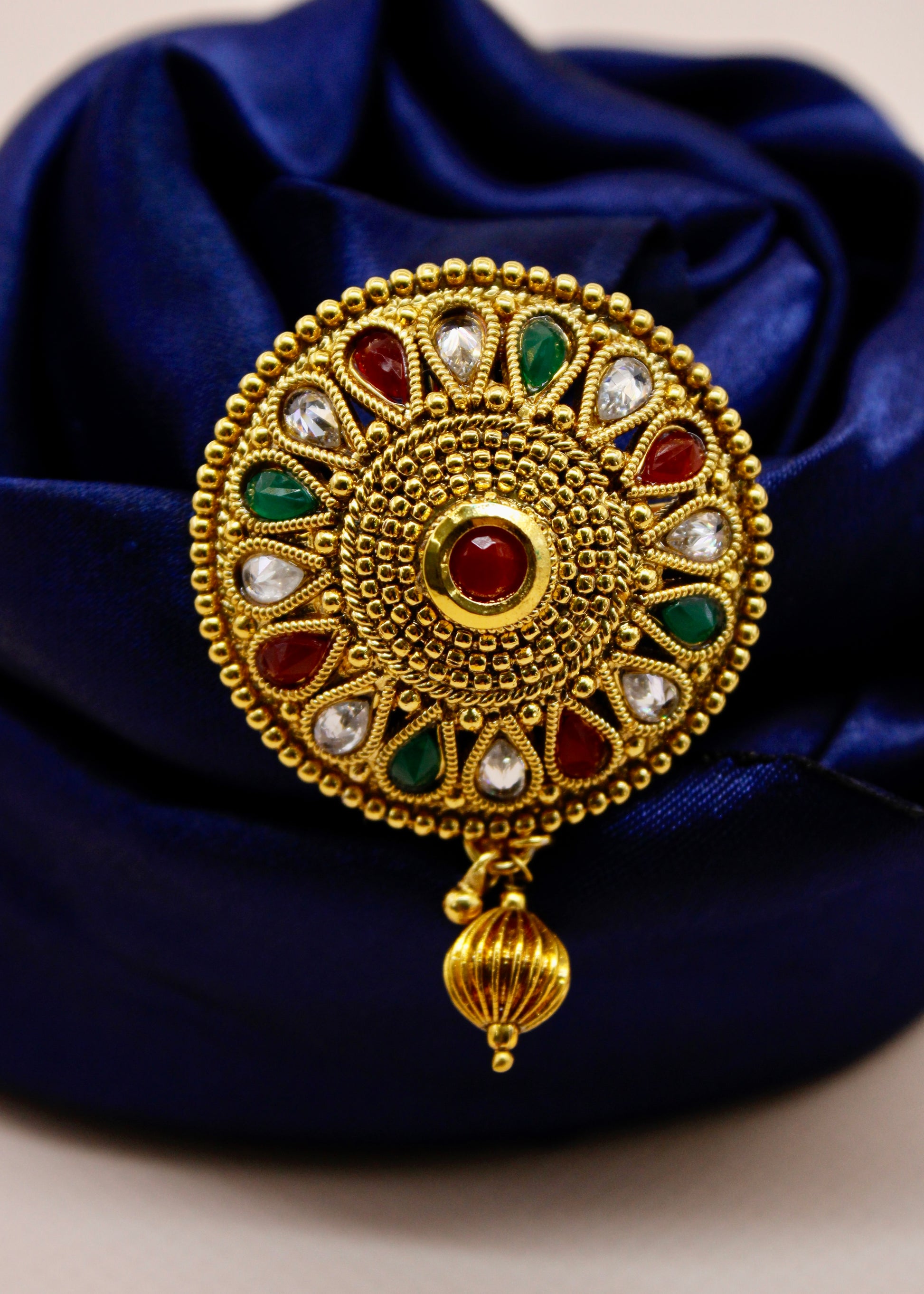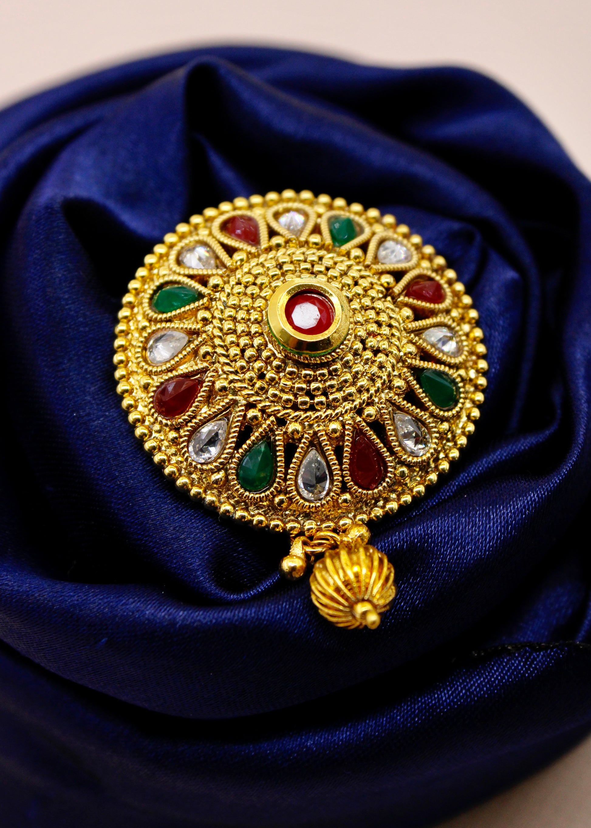 Excellently designed this round shape multi colour beautiful hair brooch is best to team with traditional apparel. It is embedded with sparkling pink, green, white colour stones and made from golden finish metal. This bun pin will surely beautify your hair style.