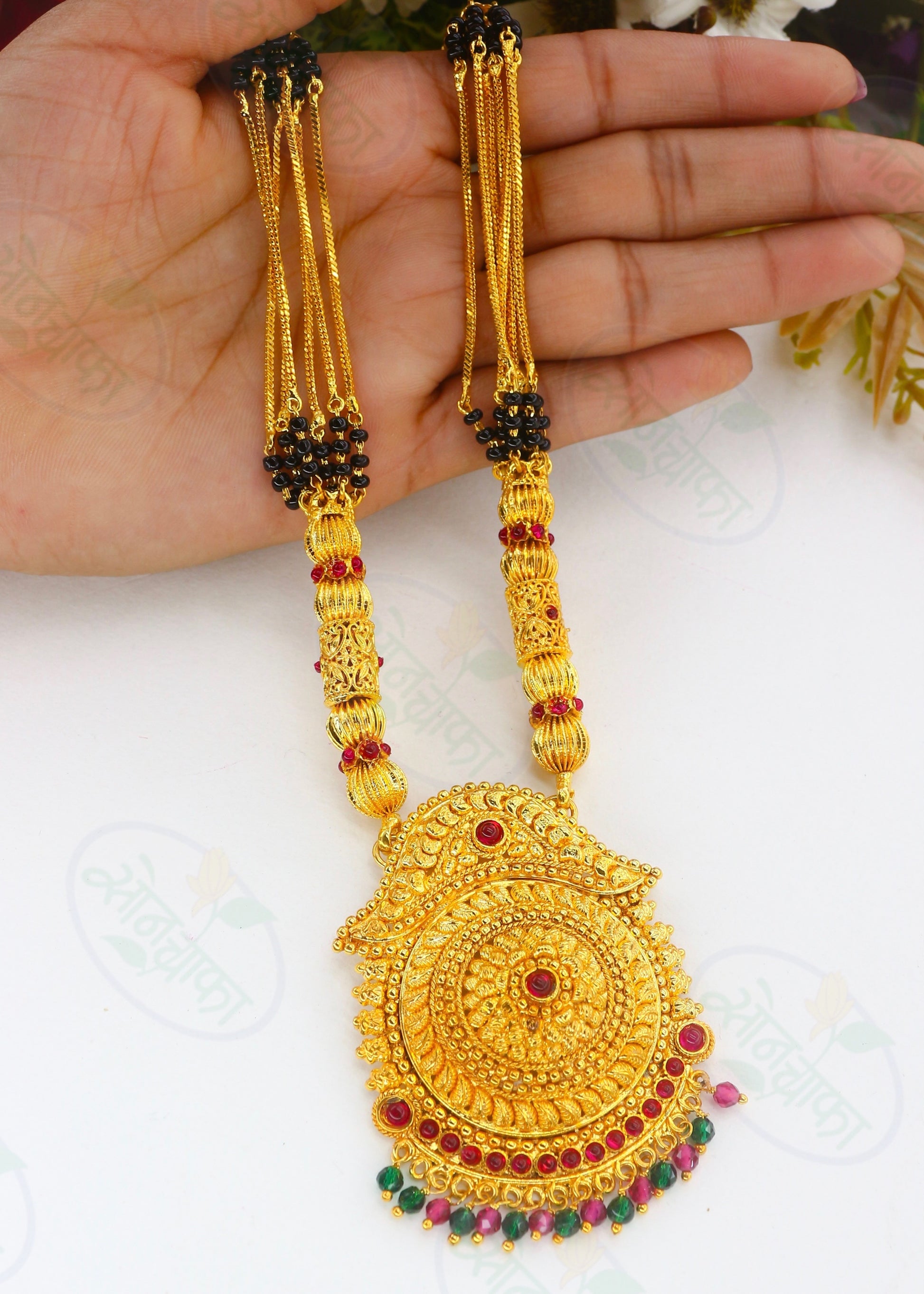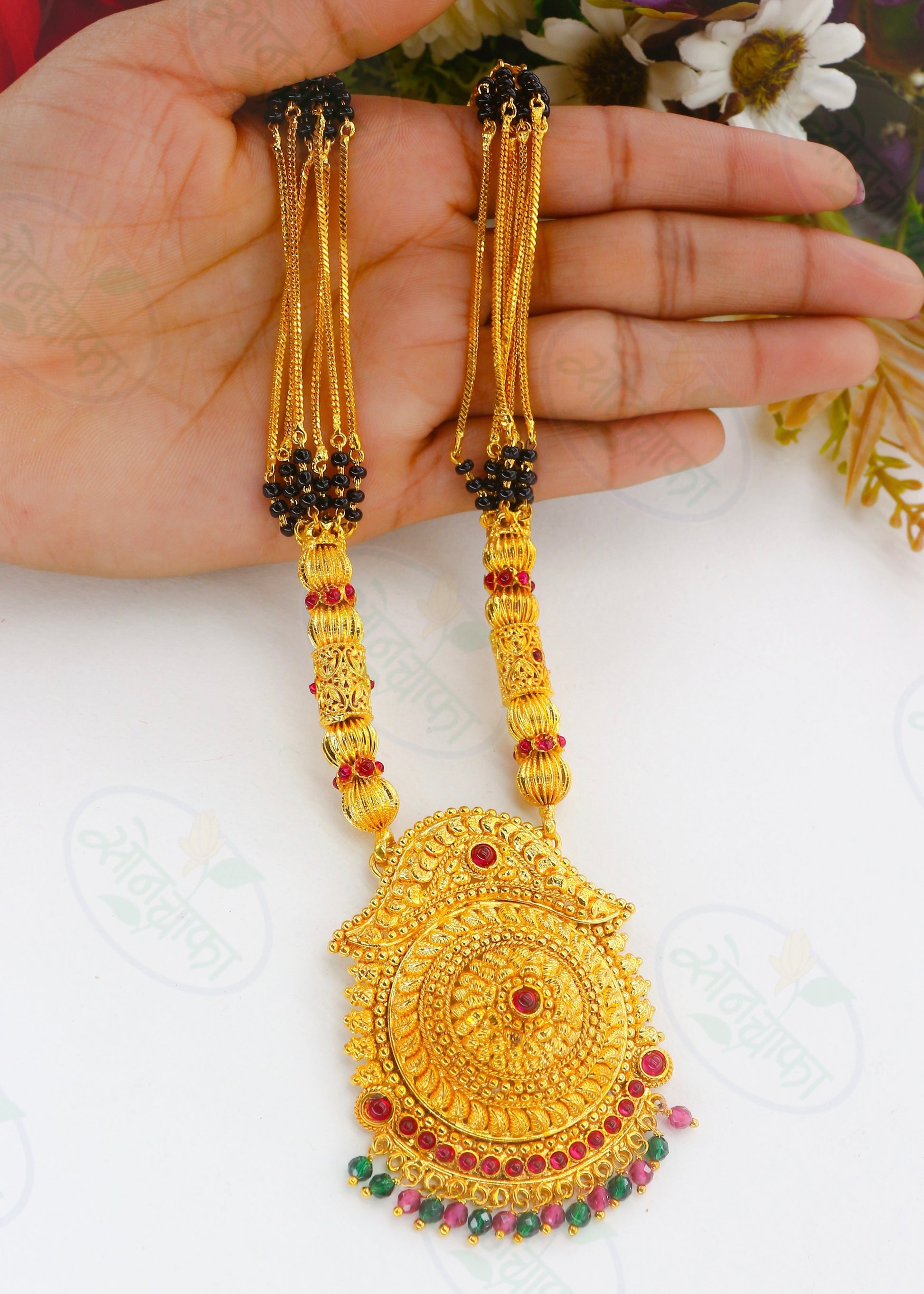 Sonchafa Jewellery brings this appealing mangalsutra for women who love to wear traditional jewellery. It is studded with shiny pink stones and fashioned from highly durable matte gold finish metal. The pendant feature attractive leaf with floral design on metal surface along with dangled golden beads.