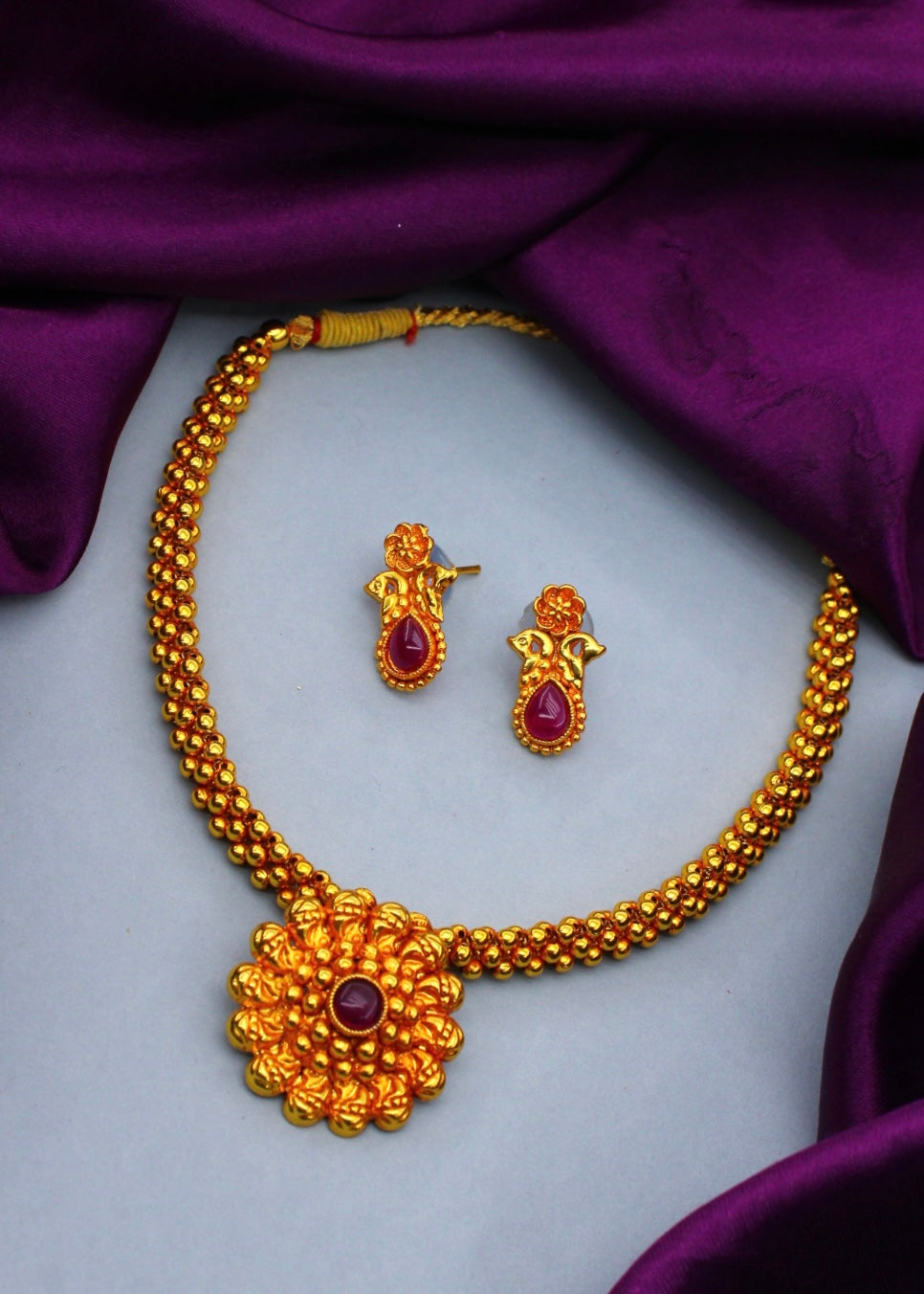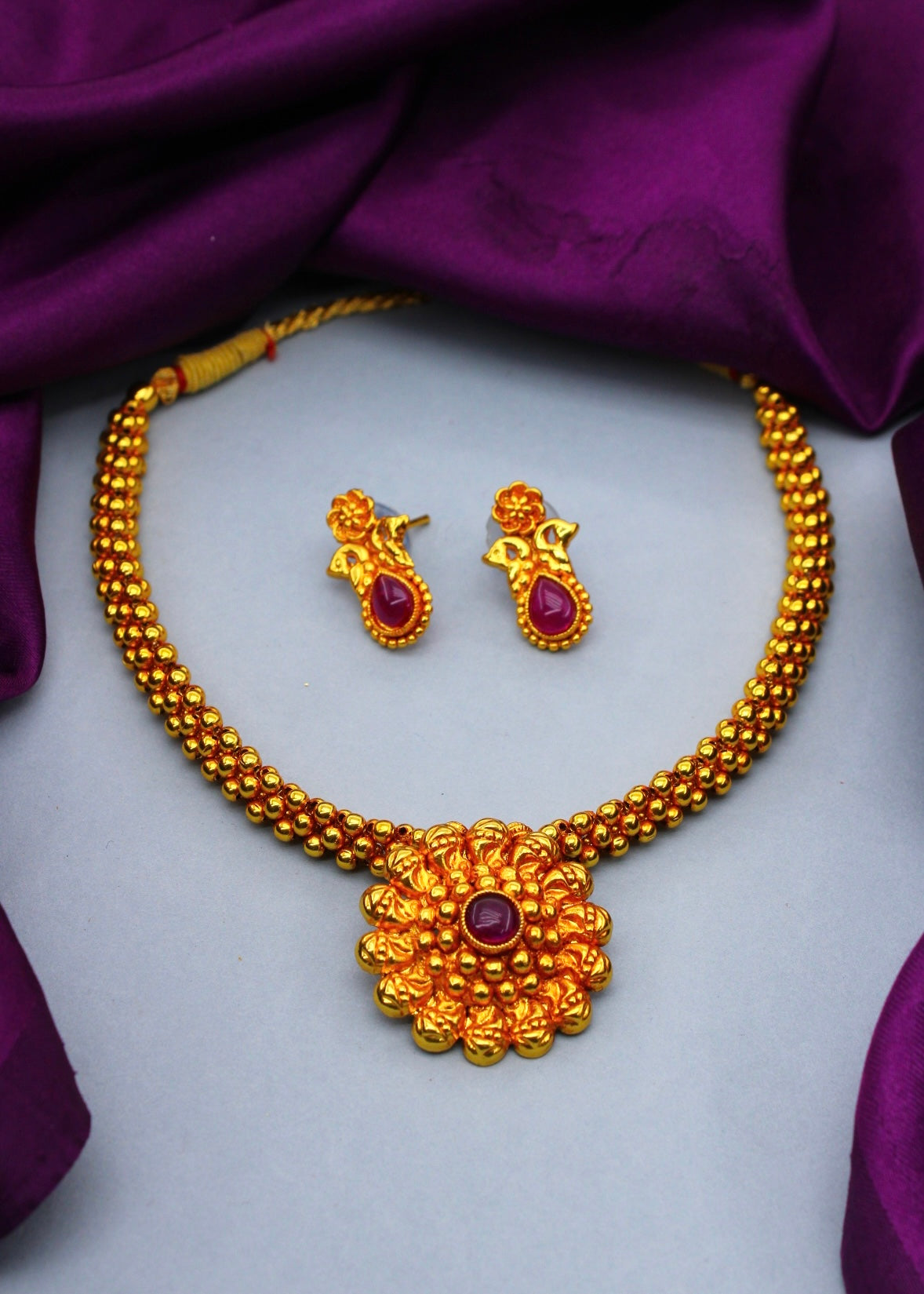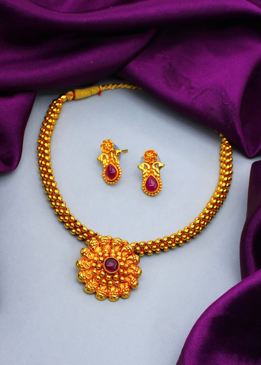 Complete your traditional look by clubbing this pink colour classy malhar necklace with your festive costume. The pendant of this necklace is encrusted with ruby stone and woven with golden beads. This appealing necklace is superior in quality and skin-friendly. It will surely complete your traditional look.