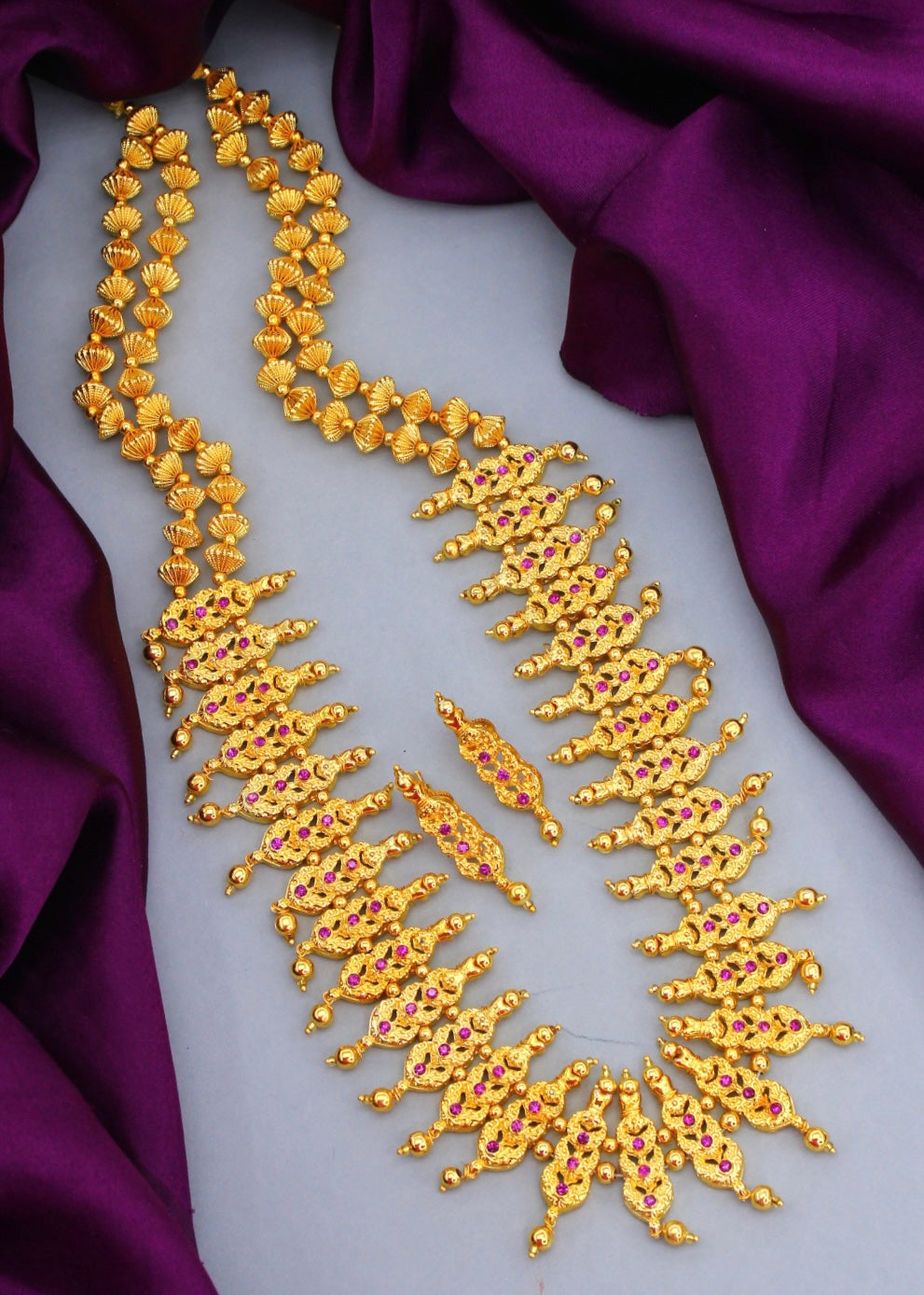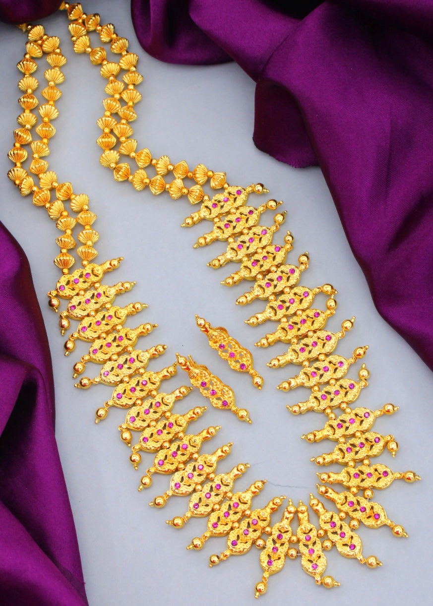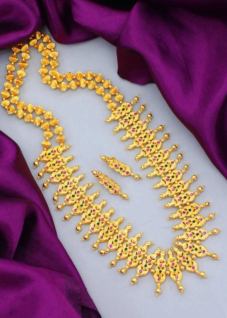 Make a very pretty addition to your jewellery collection by adding this bridal designer necklace set from Sonchafa Jewellery. It is beautifully studded with pink ,green stone and made from golden finish metal. In addition this necklace is style with attractive golden beads for more stylish look. This necklace is long lasting and highly durable.