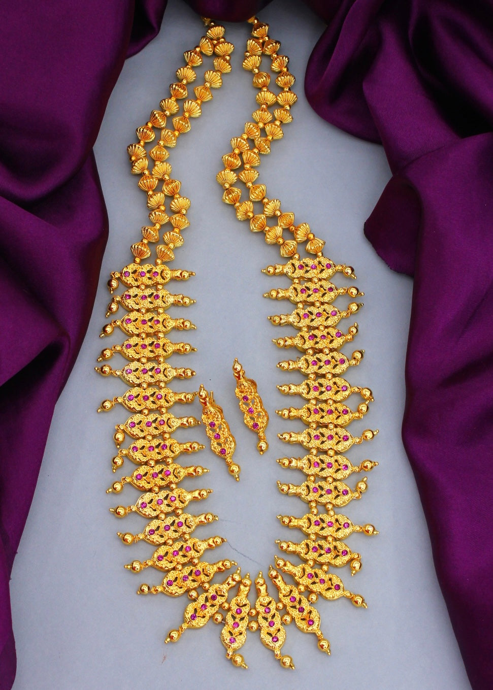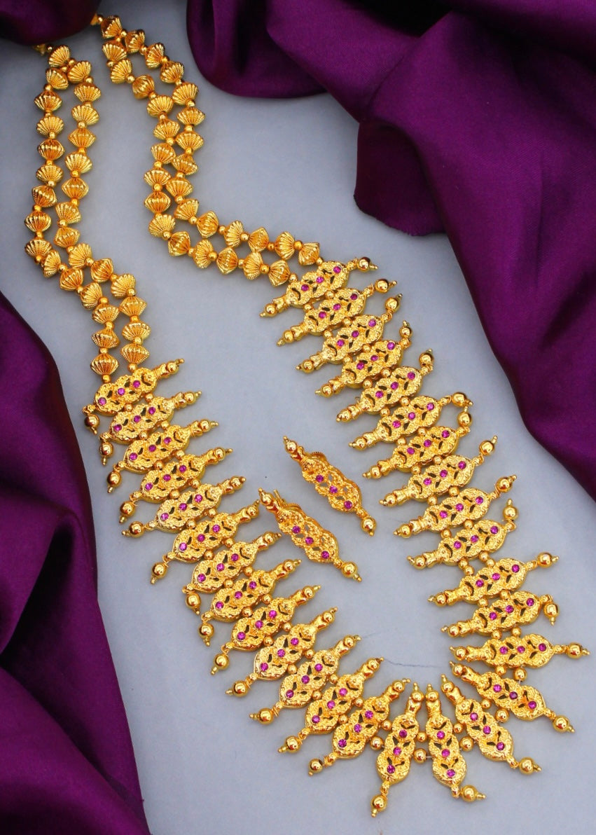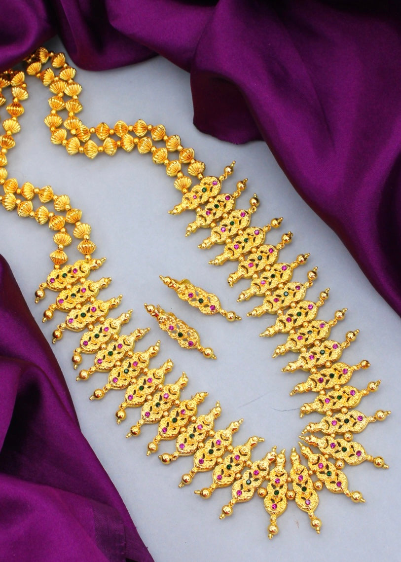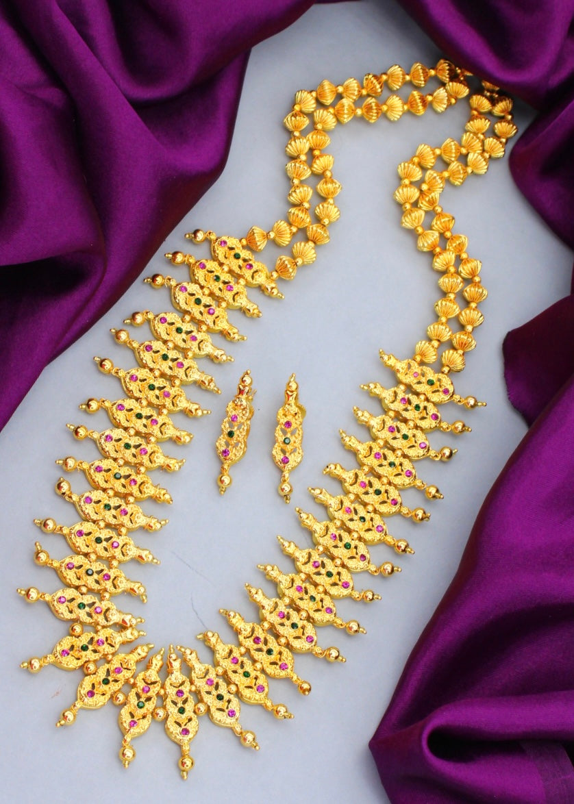 Make a very pretty addition to your jewellery collection by adding this bridal designer necklace set from Sonchafa Jewellery. It is beautifully studded with pink ,green stone and made from golden finish metal. In addition this necklace is style with attractive golden beads for more stylish look. This necklace is long lasting and highly durable.