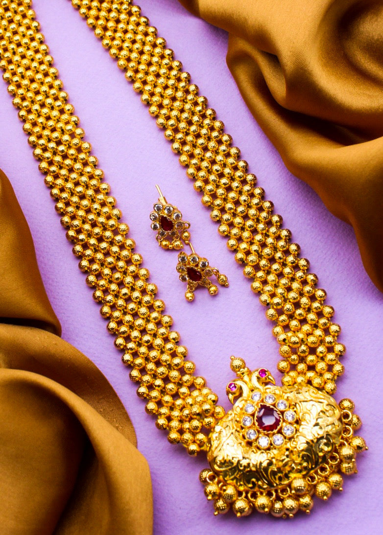 Get this amazing golden finish long Necklace from Sonchafa Jewellery which is perfect combination of class and elegance. It is woven will Golden beads. This peacock designer necklace is easy to wear as it comes with adjustable dori.