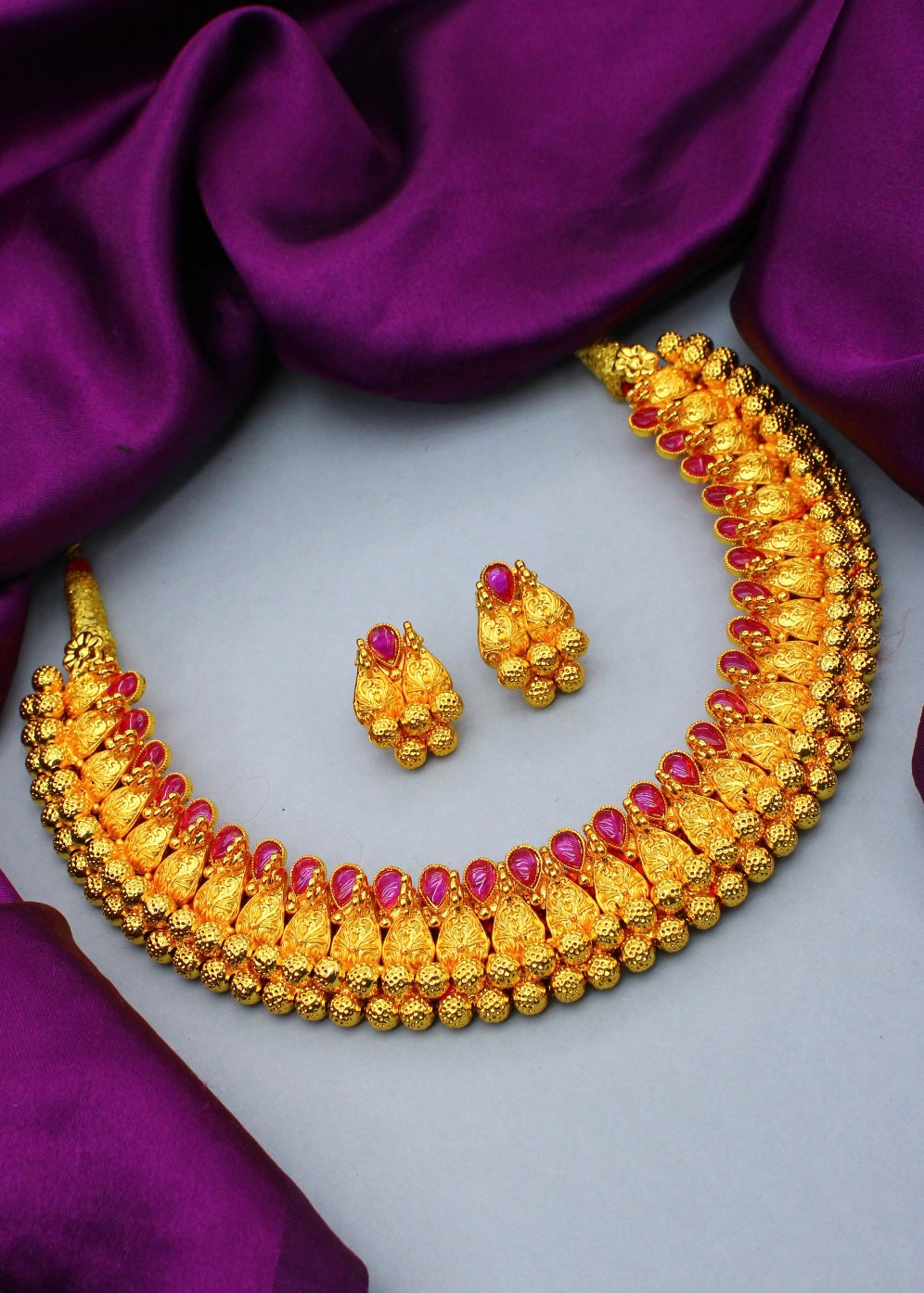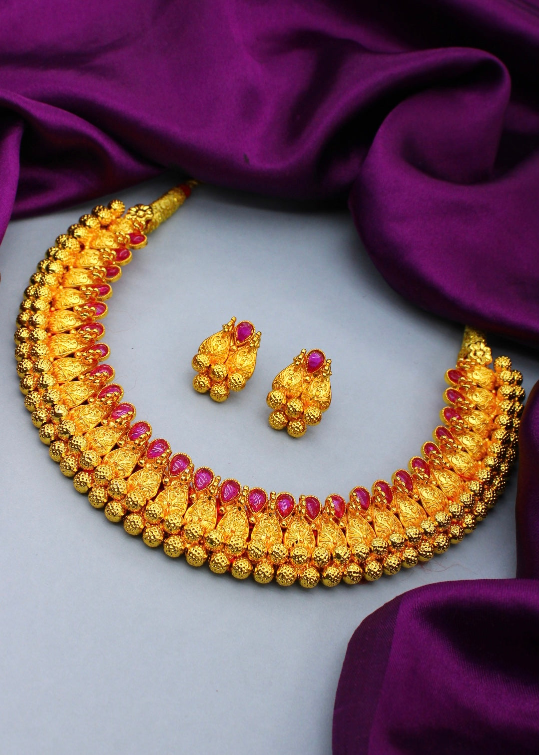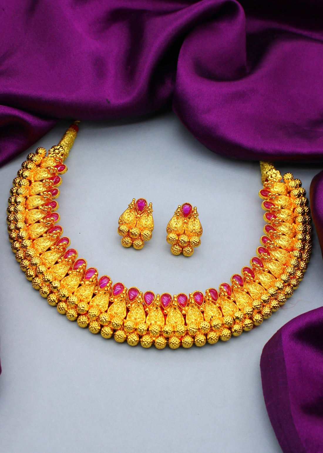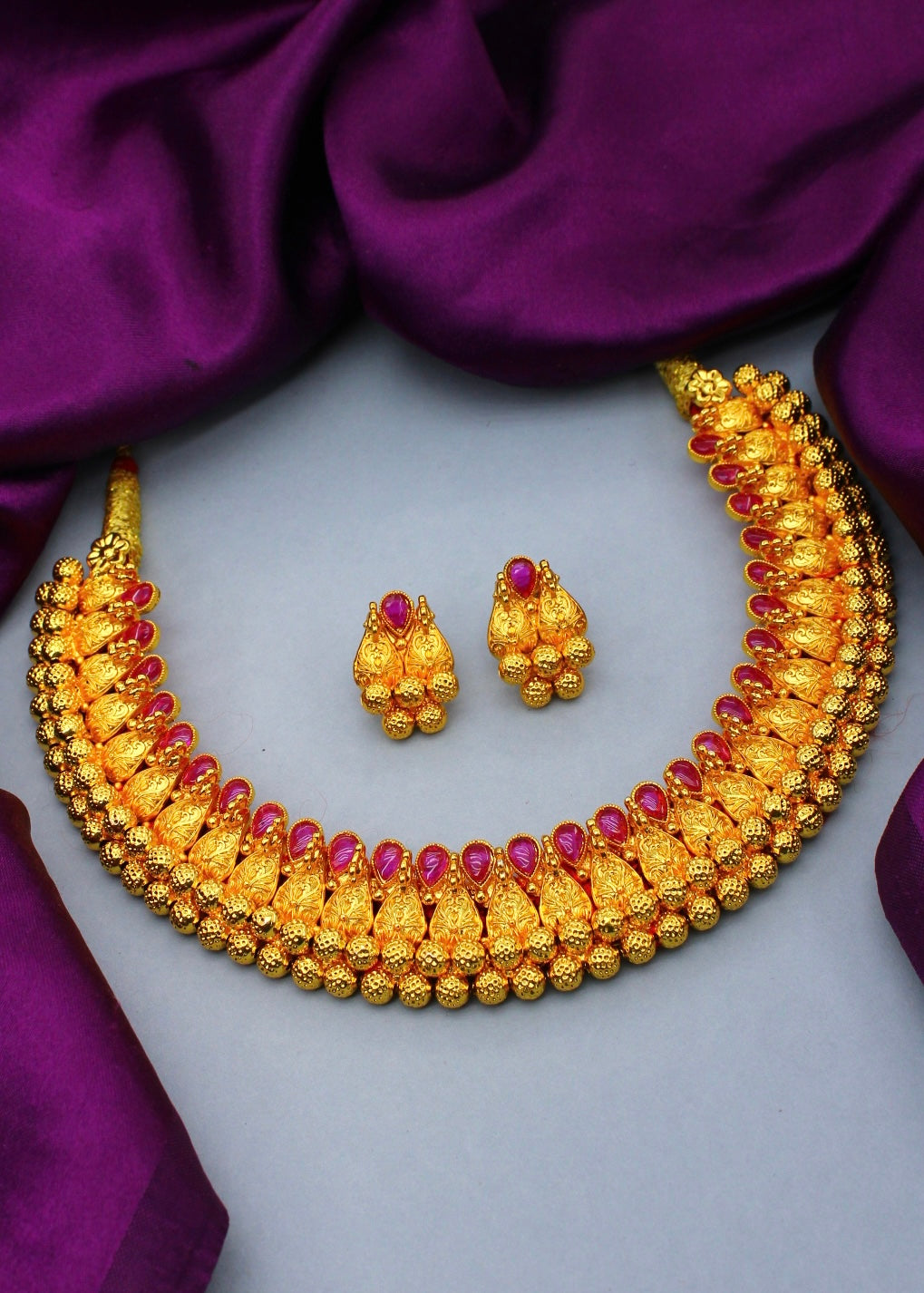 This Beautifully crafted necklace from Sonchafa Jewellery will help to complete your Maharashtrian look. The design of this necklace is so attractive that will make you look outstanding. It is wonderfully woven with golden beads & studded with pink stones for added attraction. Its superior quality will be your fashion companion for many years.