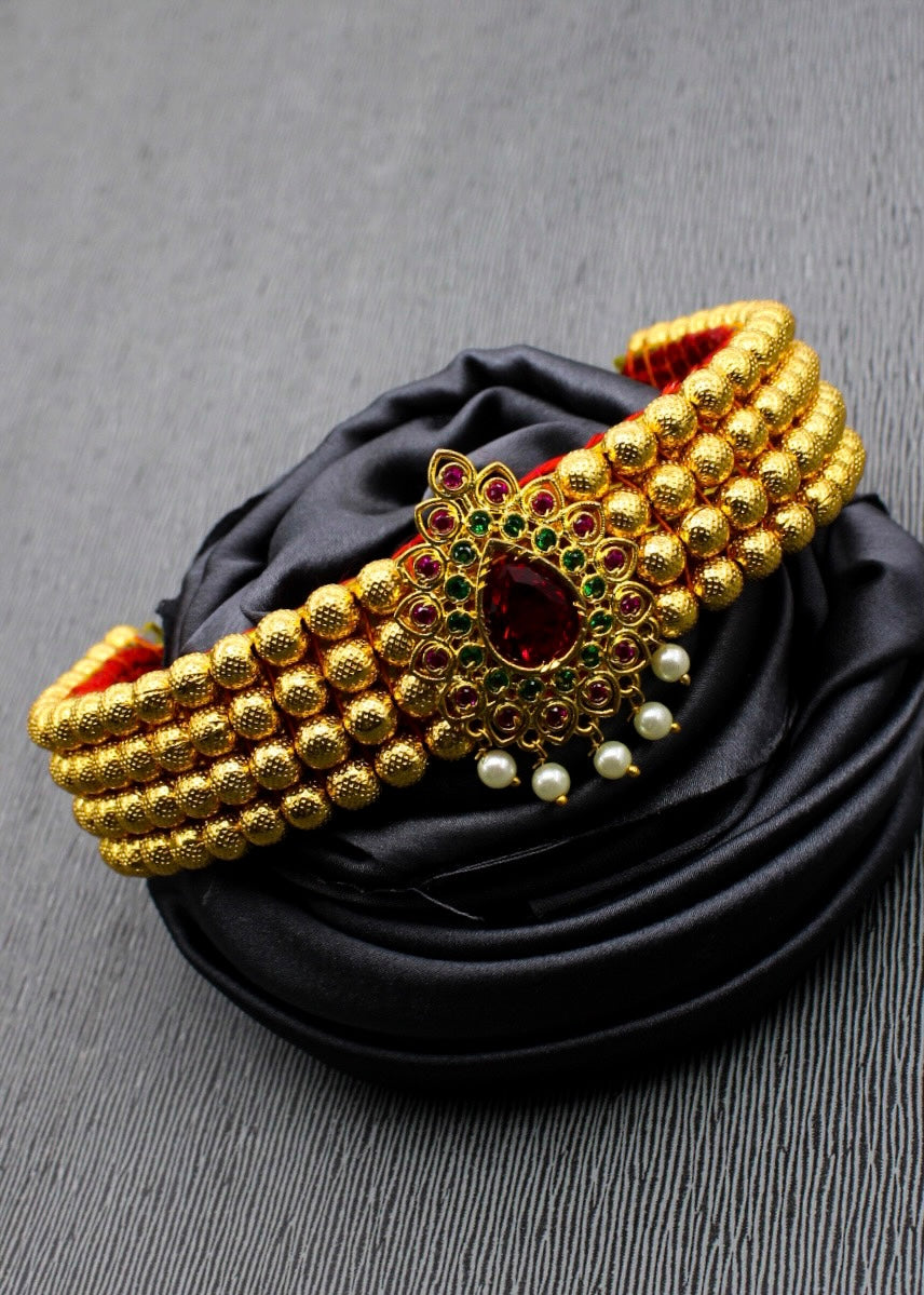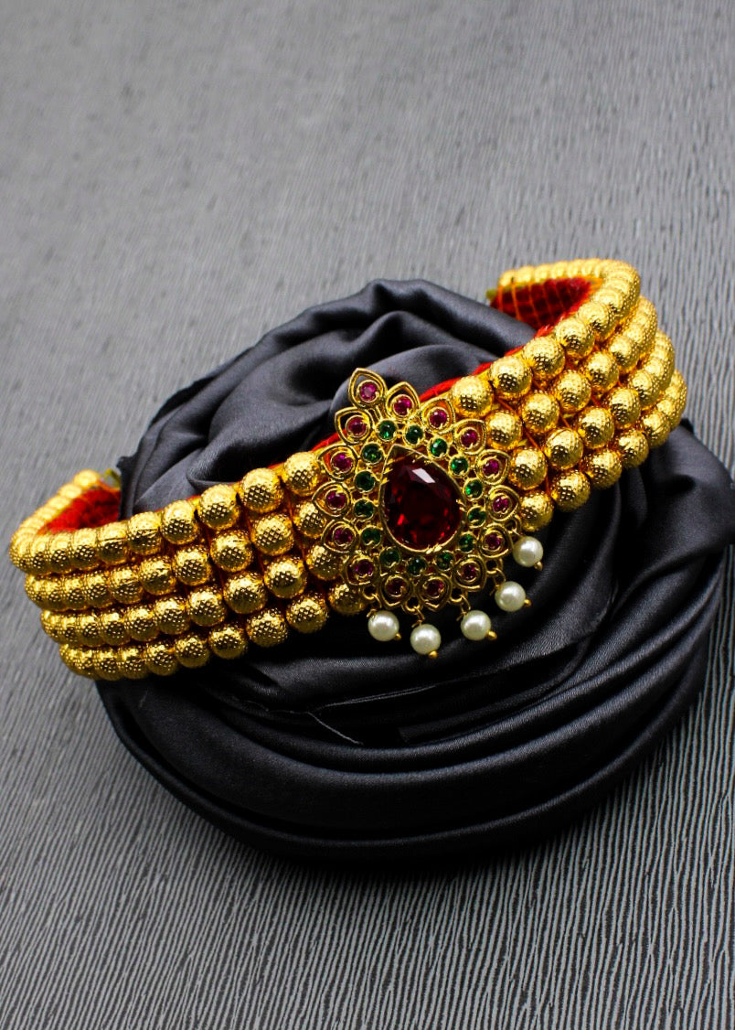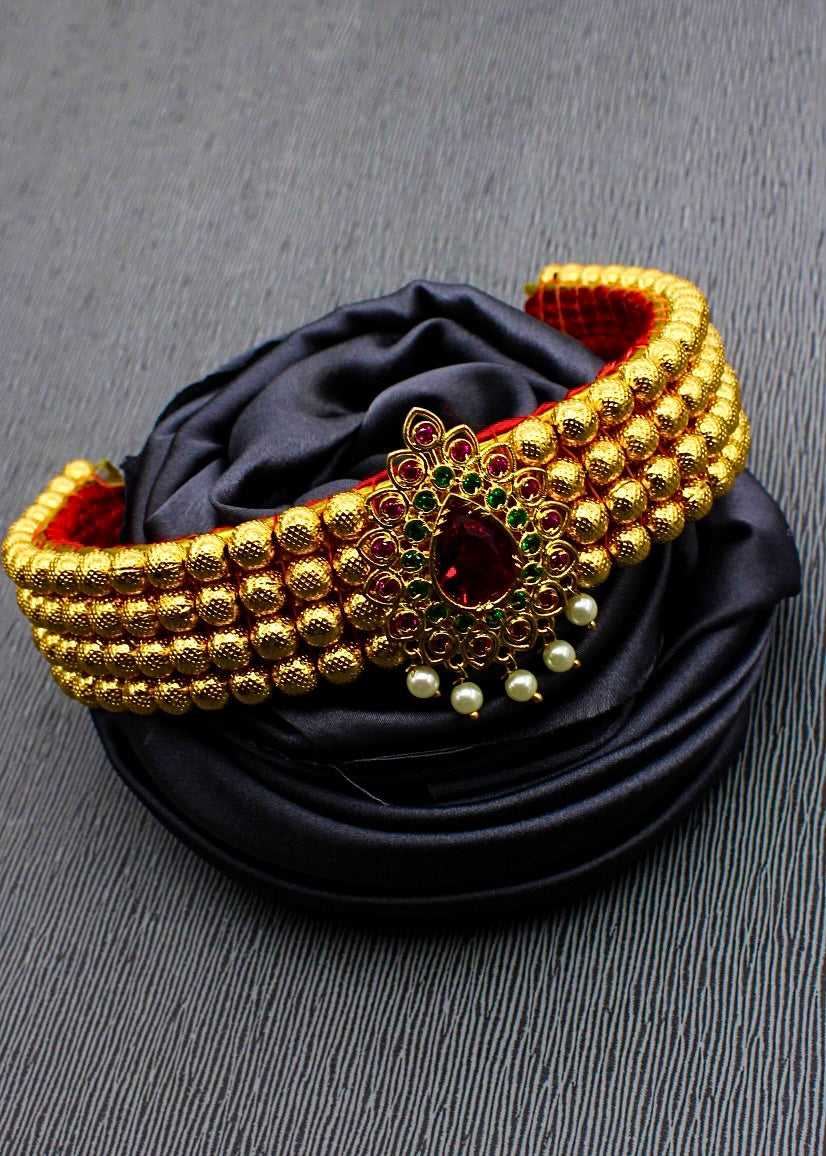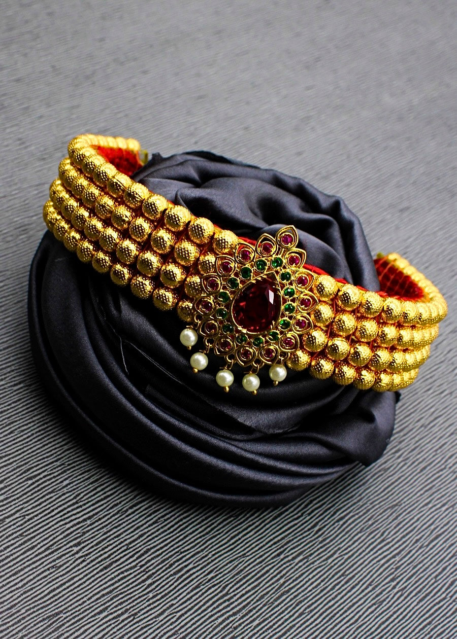 Must have in your jewellery collection this golden finish wonderful vajratik necklace from Sonchafa Jewellery. It is embedded with pink stones and crafted from golden finished metal. This appealing necklace is superior in quality and skin-friendly as well.
