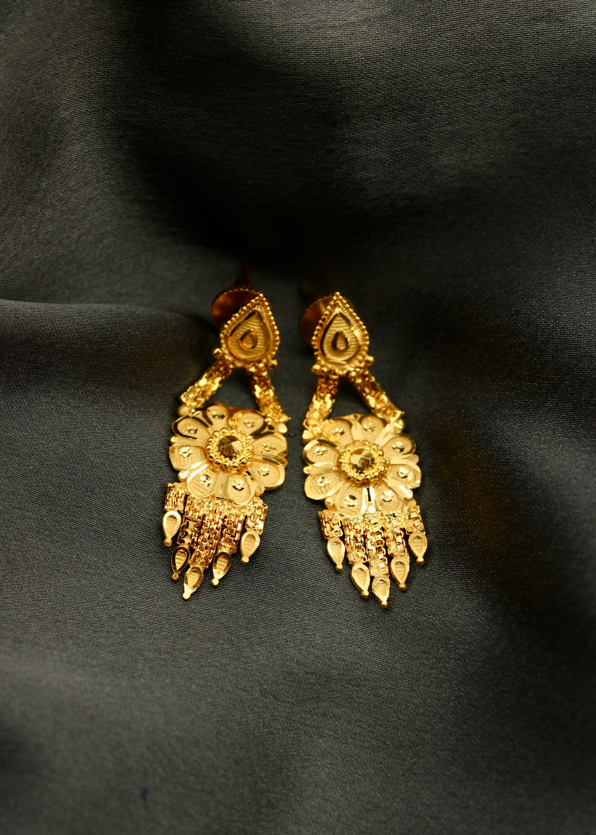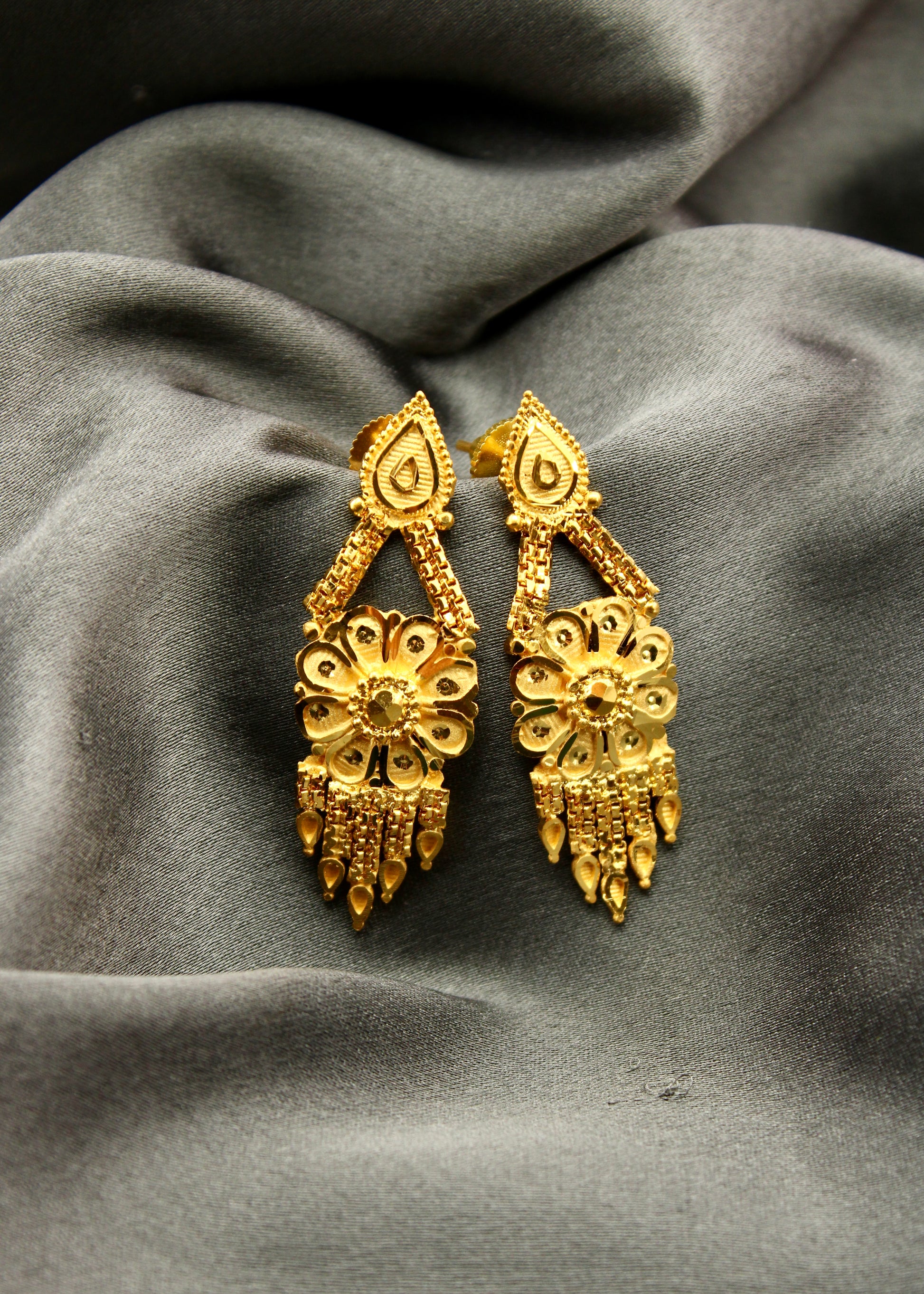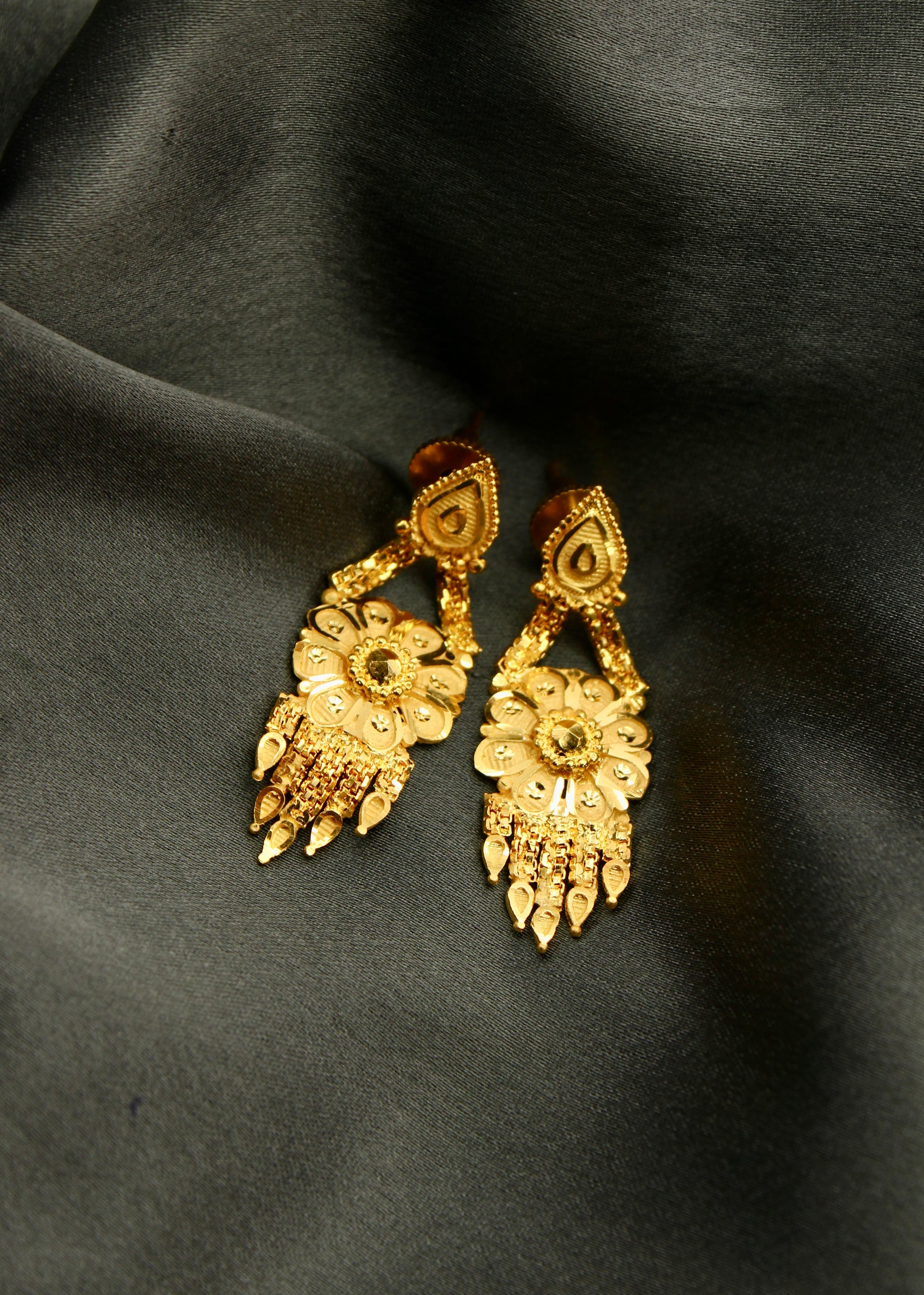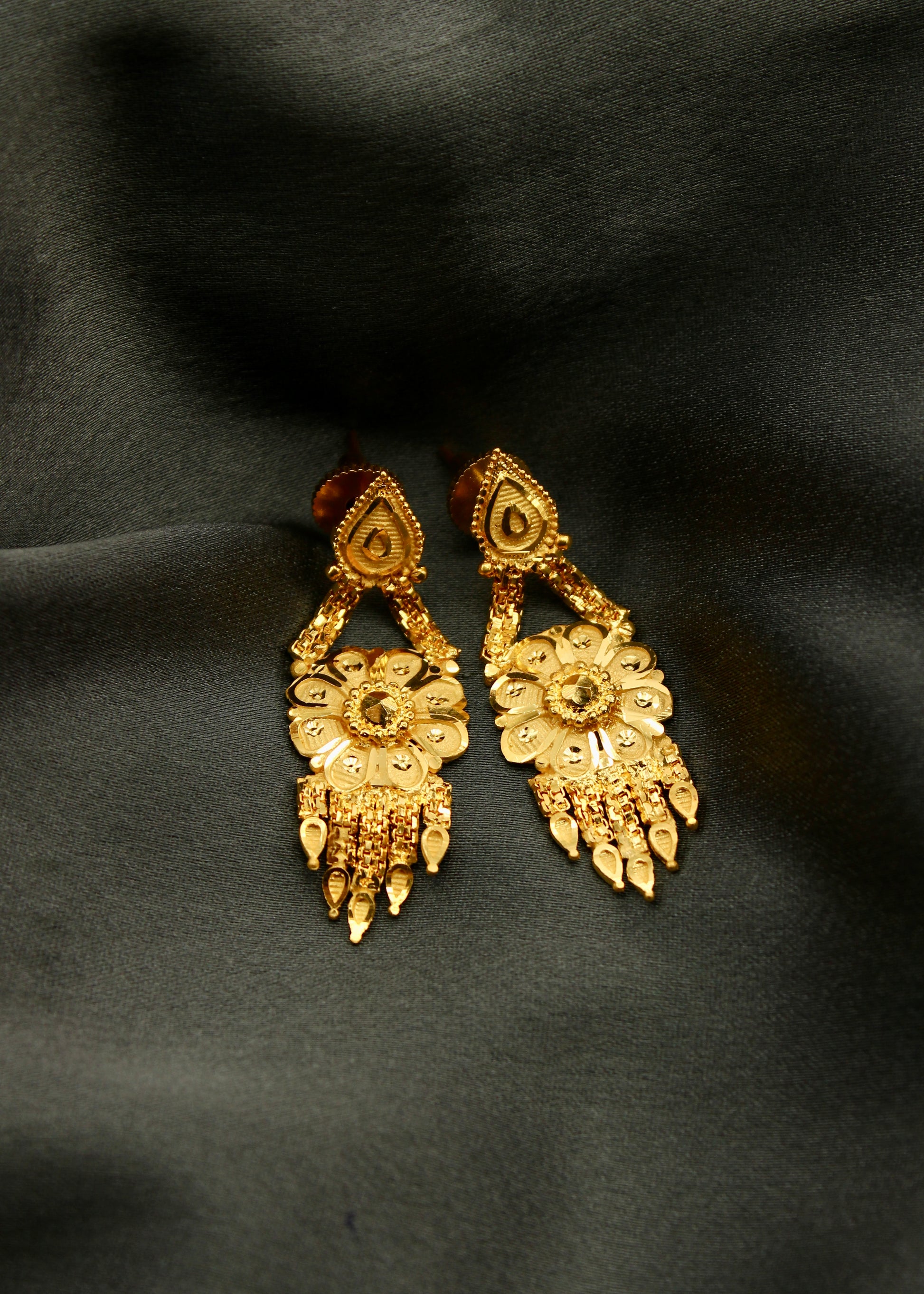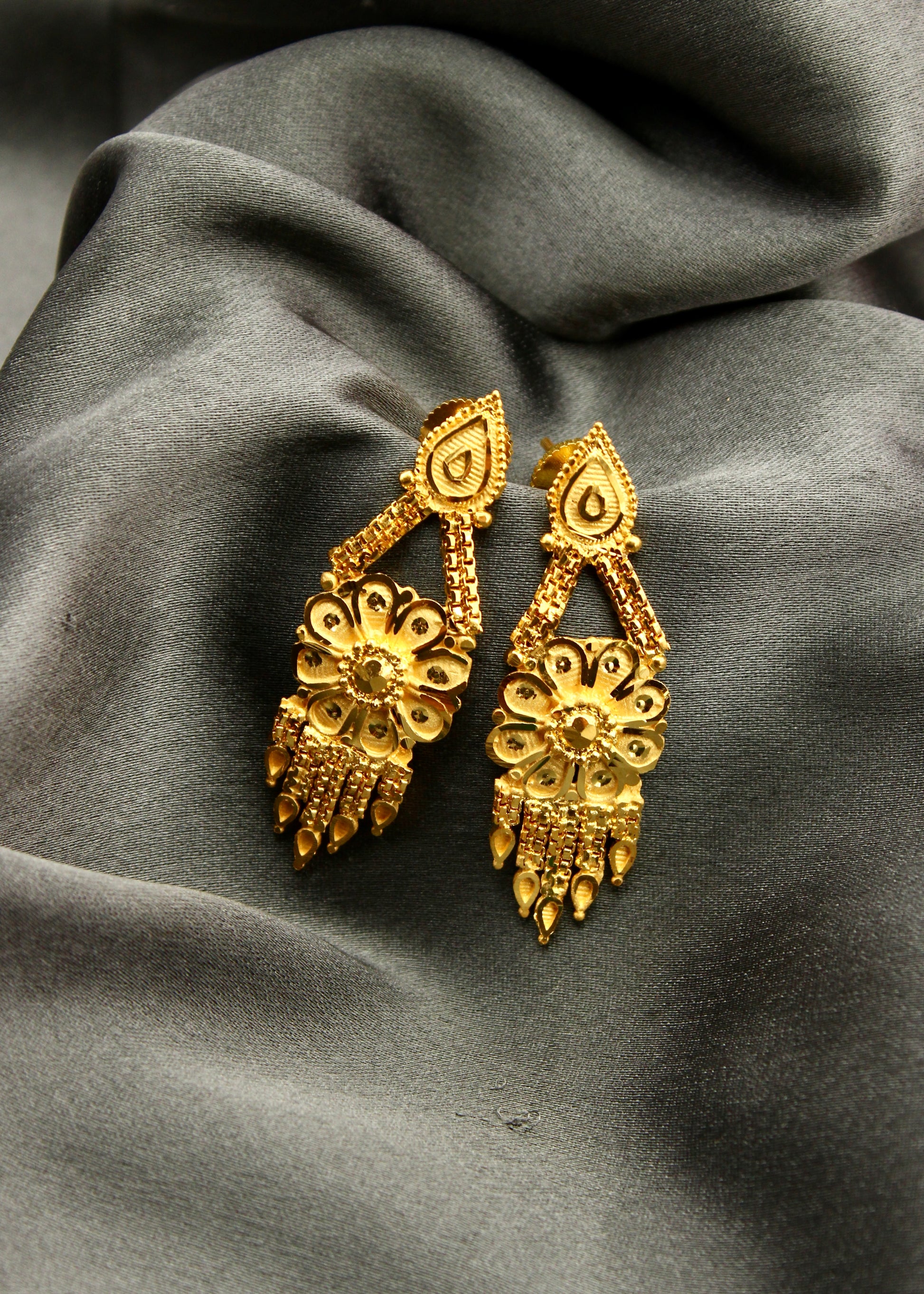 Earrings are must have ornament in the collection of women jewellery. Sonchafa Jewellery offers this 1 gram gold plated pair of floral designer earrings for you in classic look. They are studded with shimmering golden beads. These stylish earrings have golden chain droplet for added attraction.