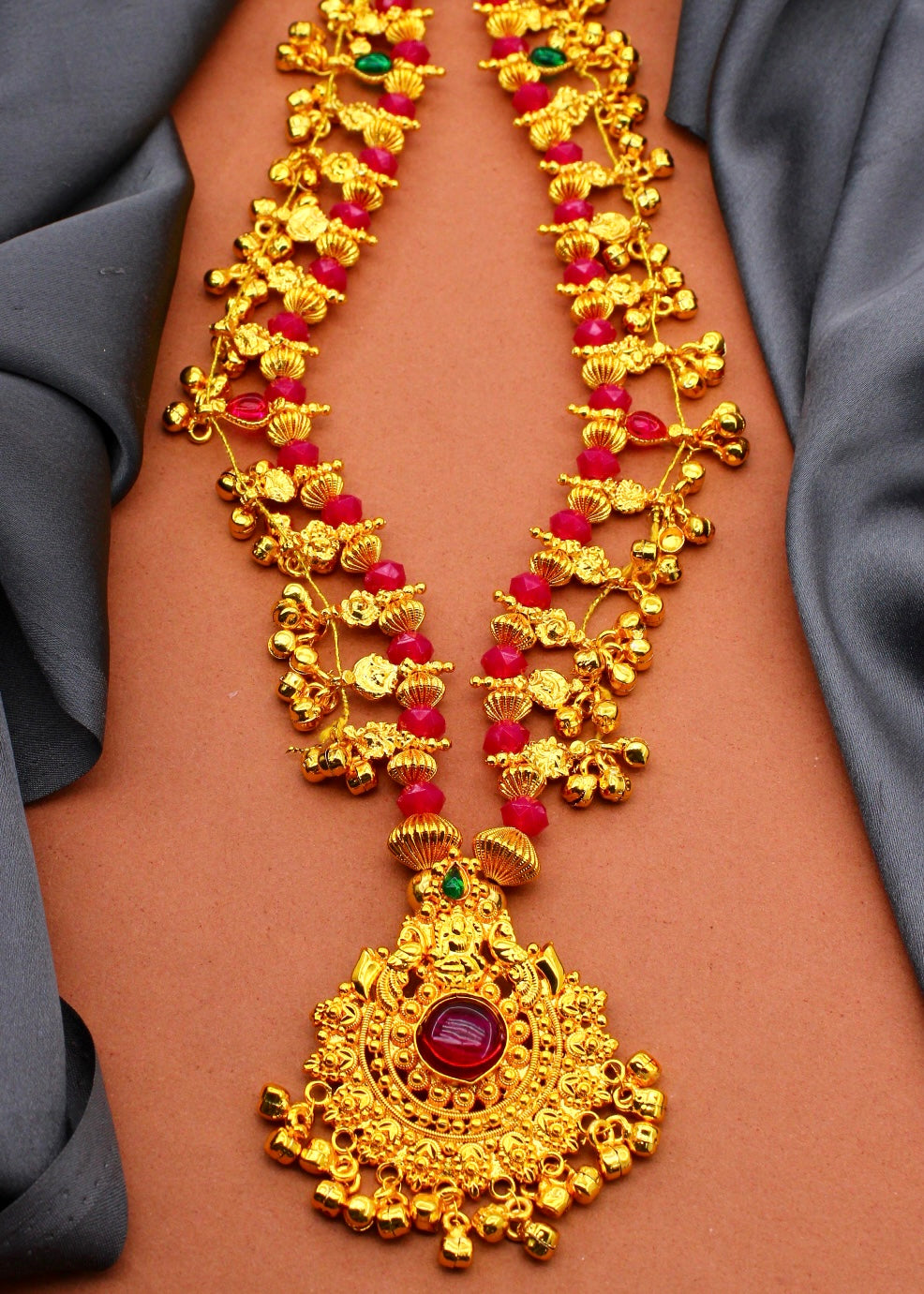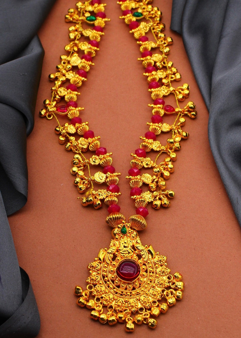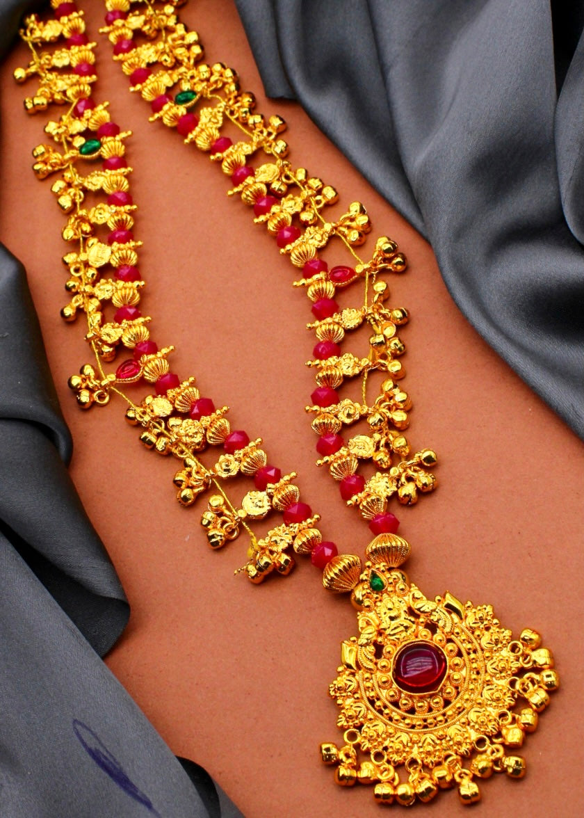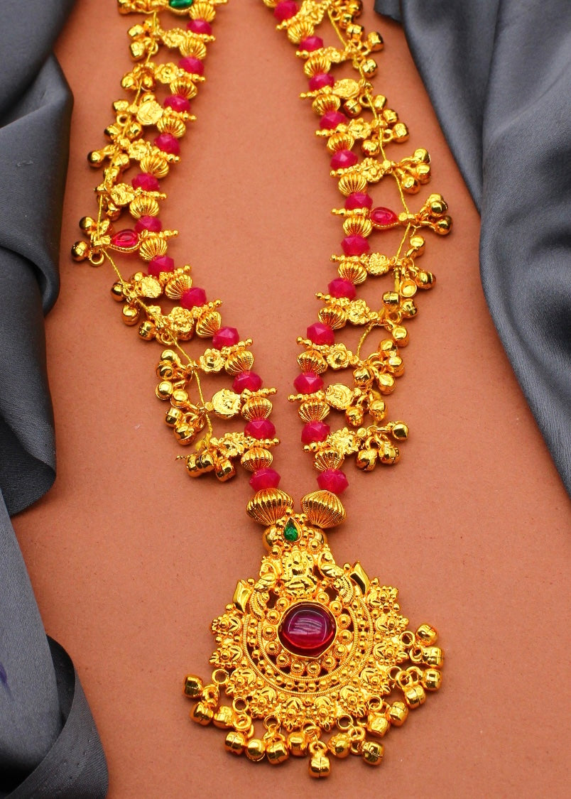 This is truly an unique designer Mornakshi Kolhapuri saaj necklace from Sonchafa Jewellery. This necklace has a Peacock design pendant along with pink stone &Golden Beads. This necklace is crafted from golden finish metal. This Kolhapuri saaj is light weight and thus can be easily wear with your outfit.