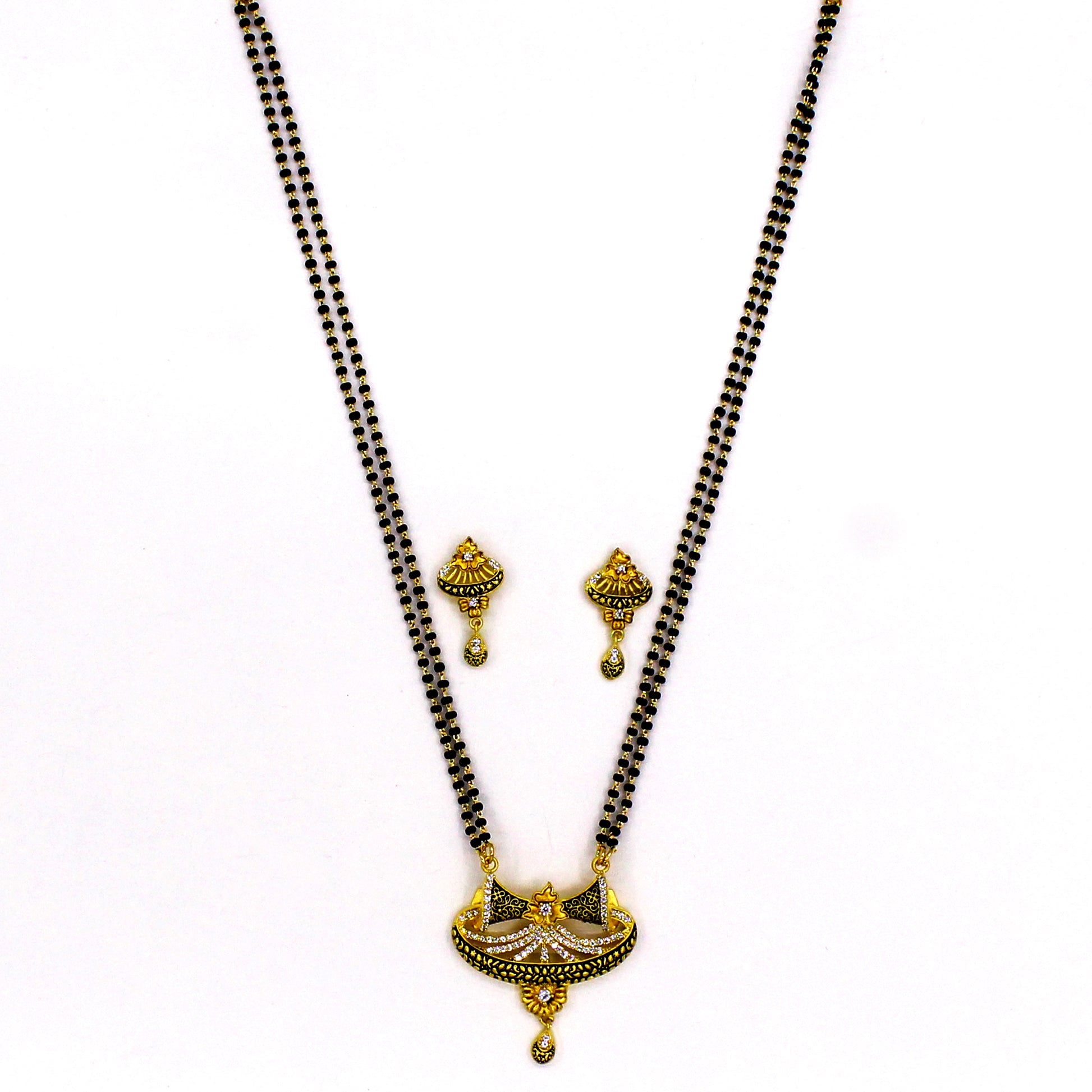 A must-have in married women's accessory collection, this pretty mangalsutra from the house of Sonchafa Jewellery. This designer mangalsutra set is encrusted with Dia diamonds and Matt finish polished copper. It will surely fetch you lots of compliments for your amazing choice. This set consists of pendent with 9 inches golden polished mangalsutra chain and pair of matching earrings.