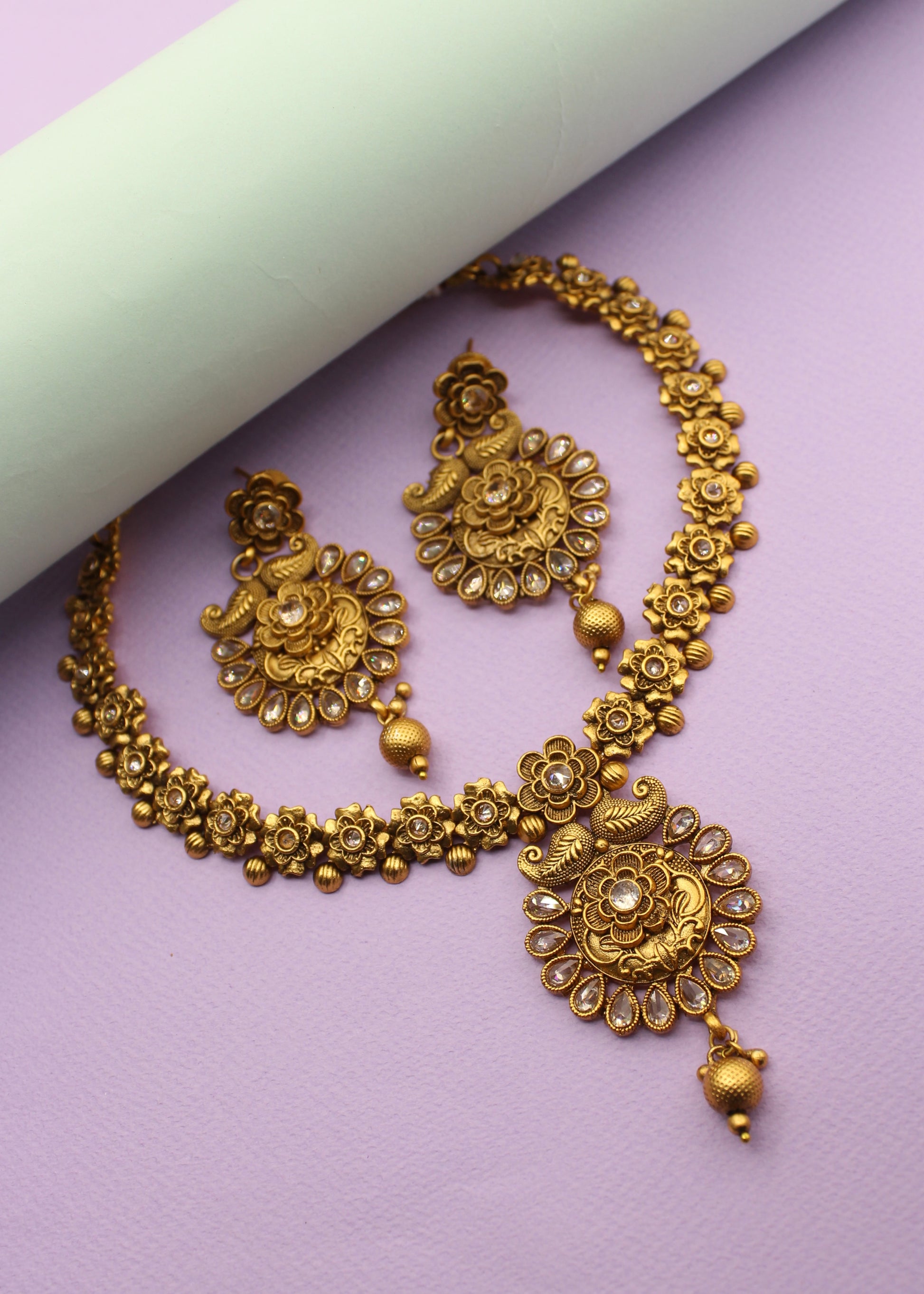 This super elegant floral designer necklace set is perfect for special occasions only from Sonchafa Jewellers. It is crafted from antique gold finish metal and studded with pink, green, white stone and has flawless floral design. It is long lasting and skin-friendly as well.