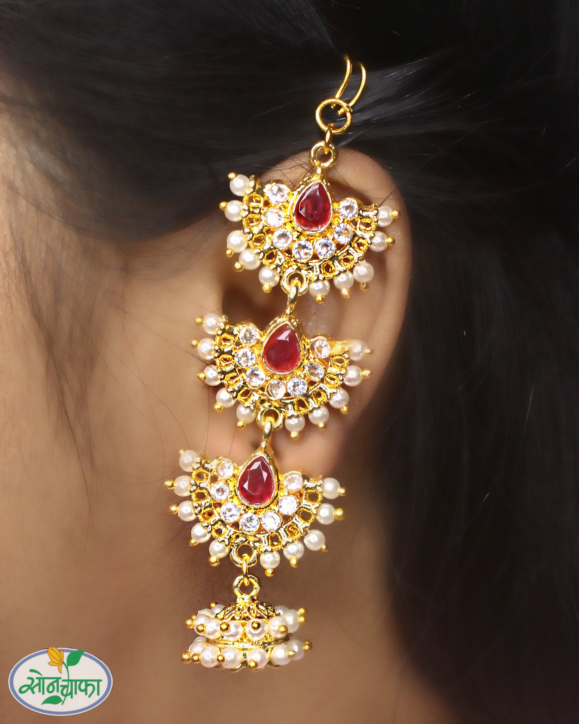 This adorable pair of ear-kanchain from Sonchafa Jewellery. These are decked with pink, white stones and crafted from golden finished metal. These kanchain are good in quality and high durability.
