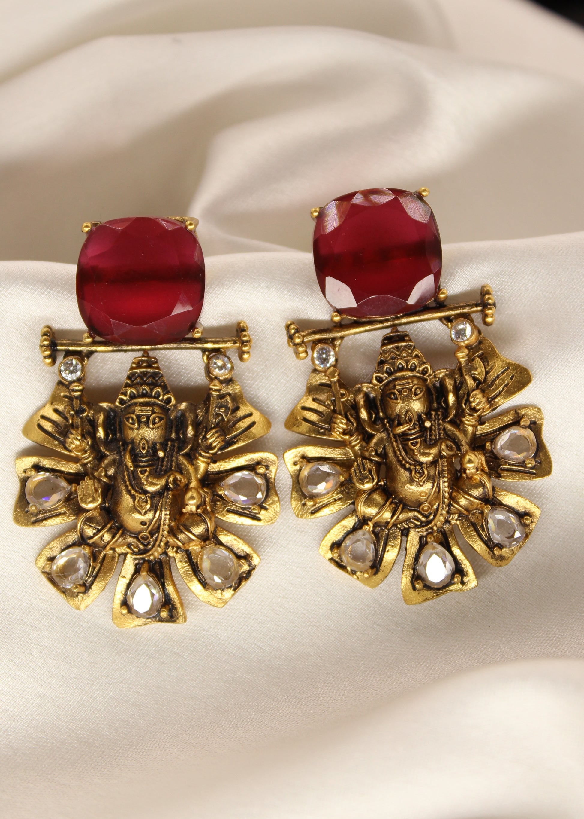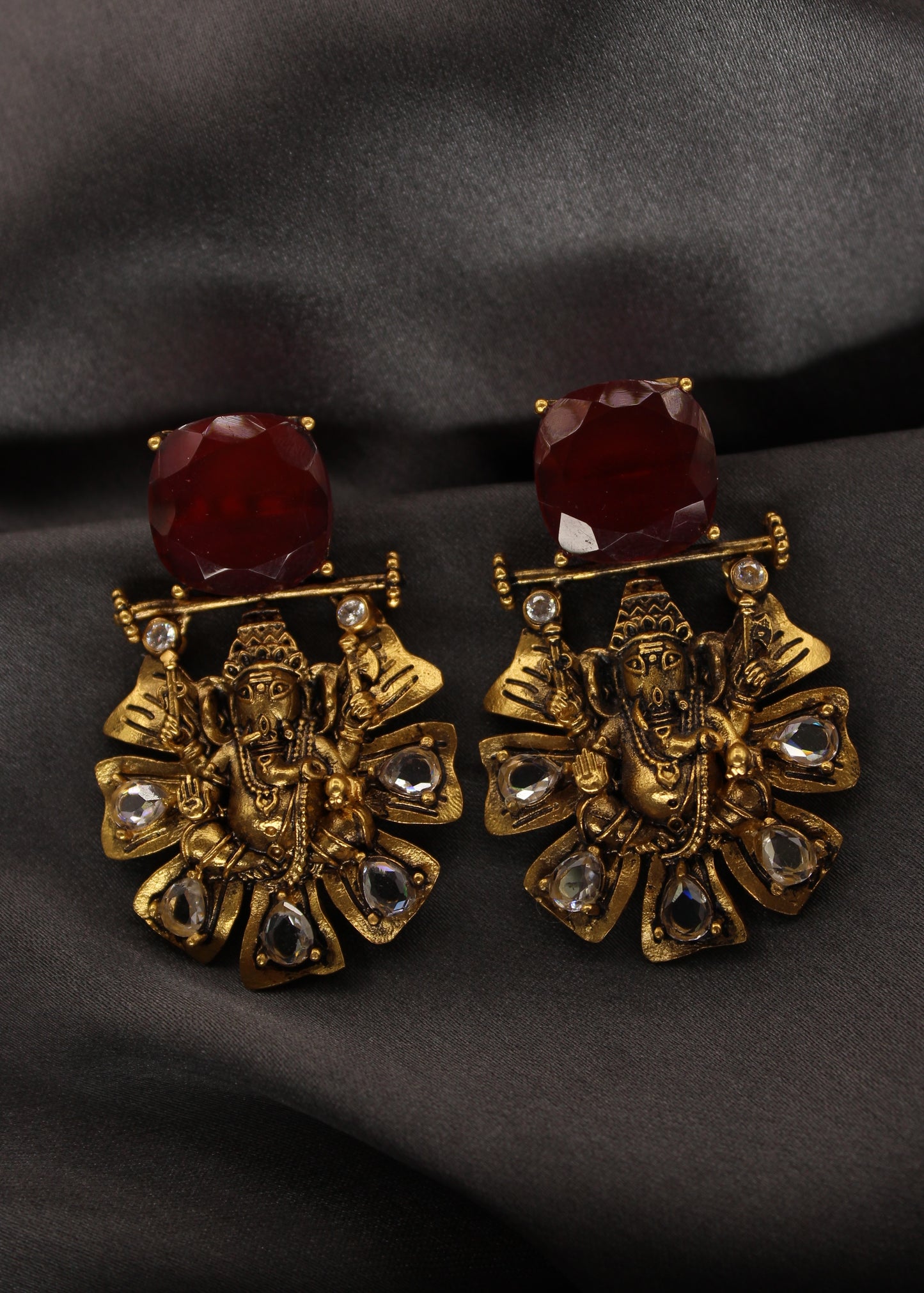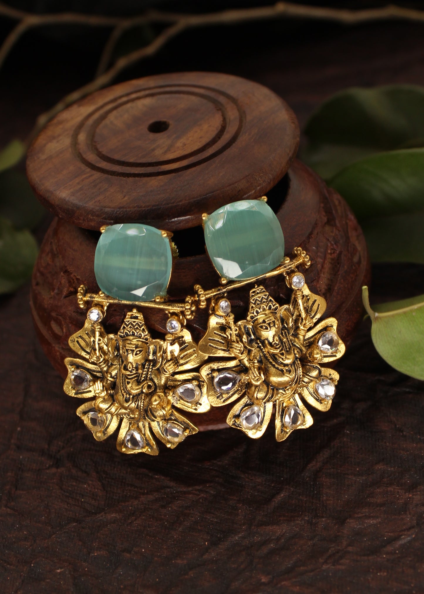 beautiful lord ganesh, wonderful pair of white stones is best to team with matching ethnic saree. They feature wonderful intricate design and made from golden finish metal. These earrings are good in quality and will be your fashion companion for many years.