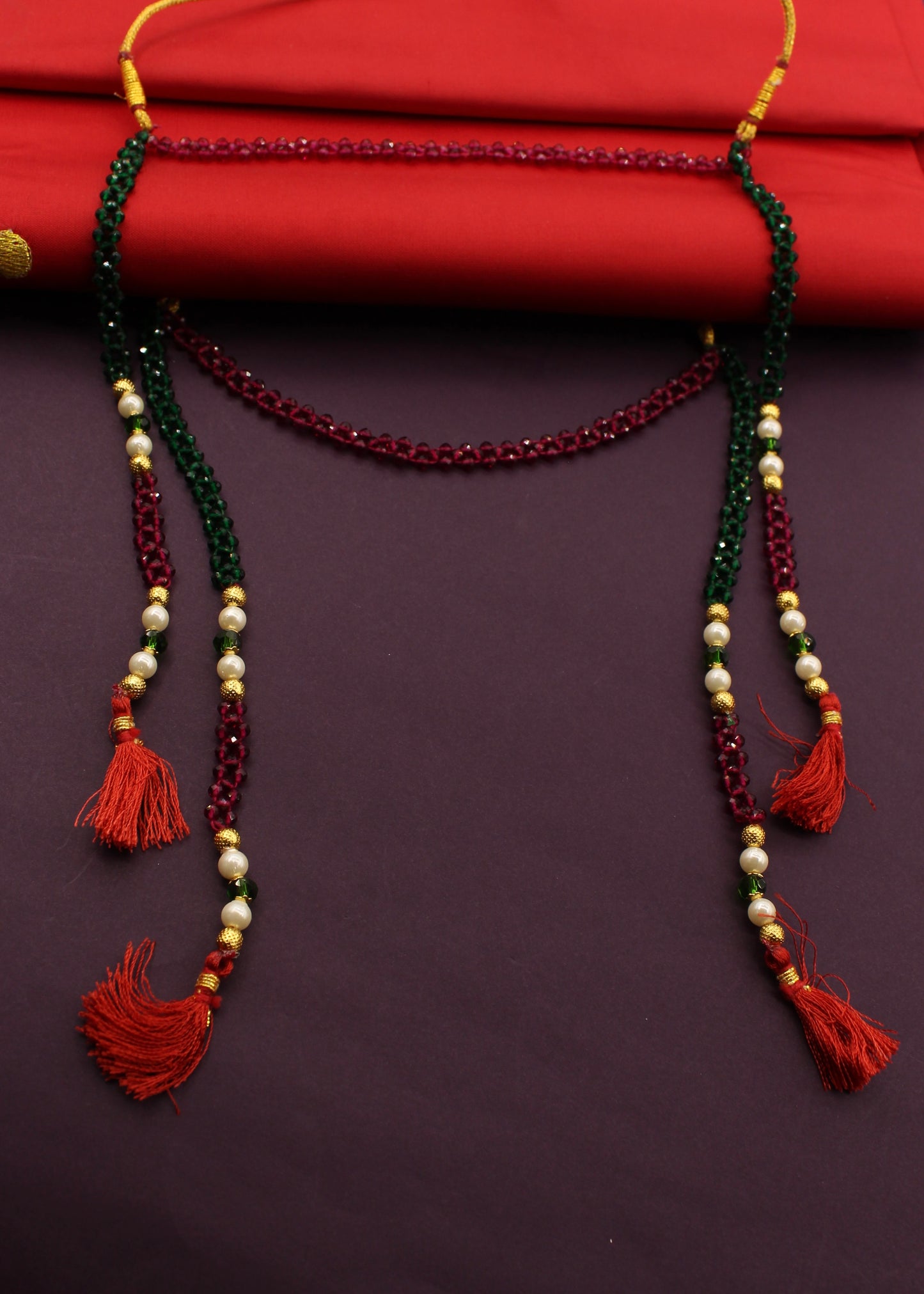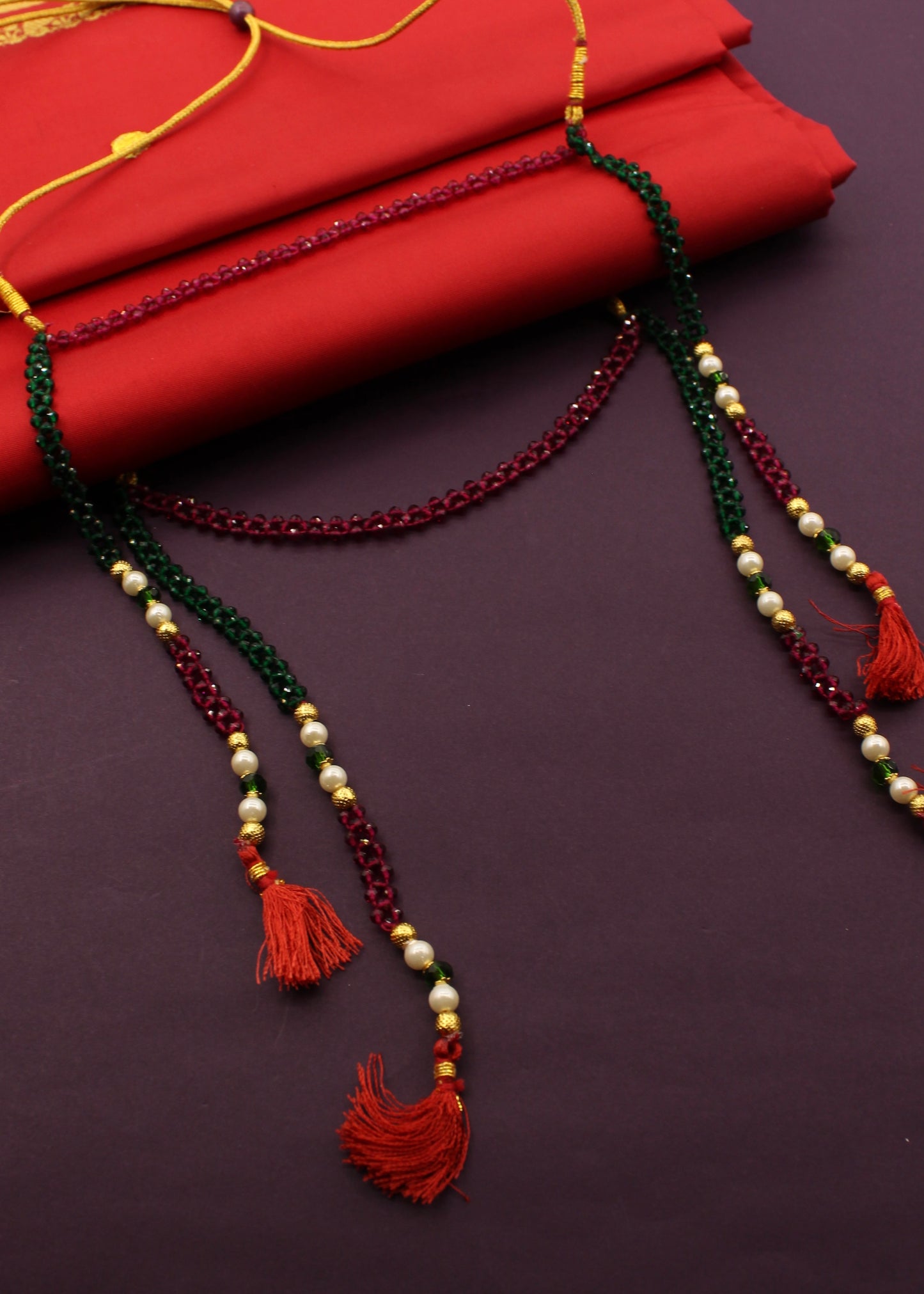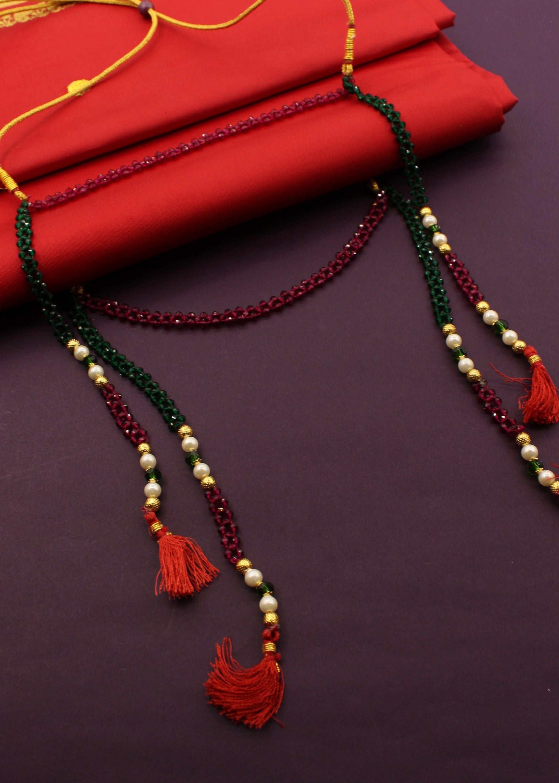 Have looking pearl jewellery online for perfect match your trendy look from Sonchafa Jewellery. This mundavalya styled with studded crystal beads along with carving beautiful design on metal surface & made from golden finish metal.