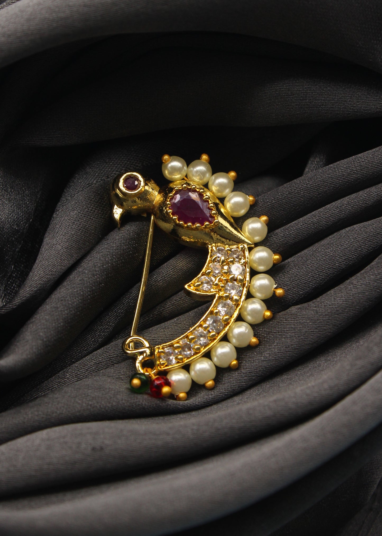 Amazing Peacock designer golden finish pink, white colour pearl nath for women traditional from Sonchafa Jewellery. It is made up of golden finish metal and it will surely give you attractive look.