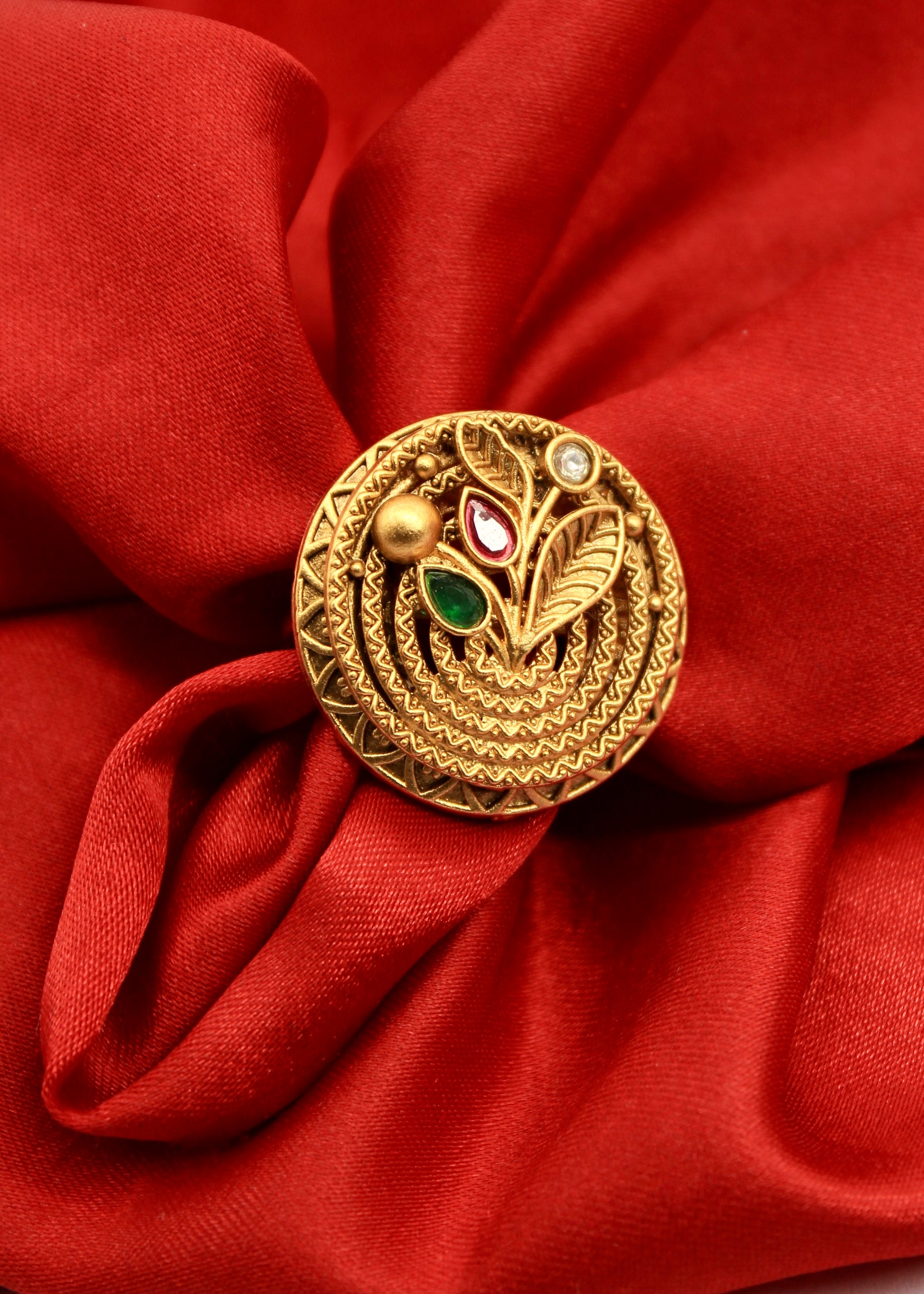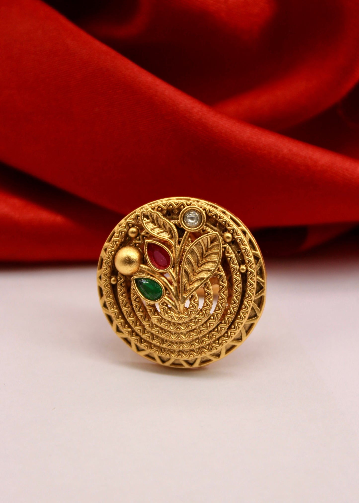 Creatively designed this leaf designer finger ring from Sonchafa Jewellery will never fail to complete your traditional look. Decorated with stunning pink, green, white stones and feature flawless work. Crafted from antique golden finish this finger ring is fine in quality and long lasting.