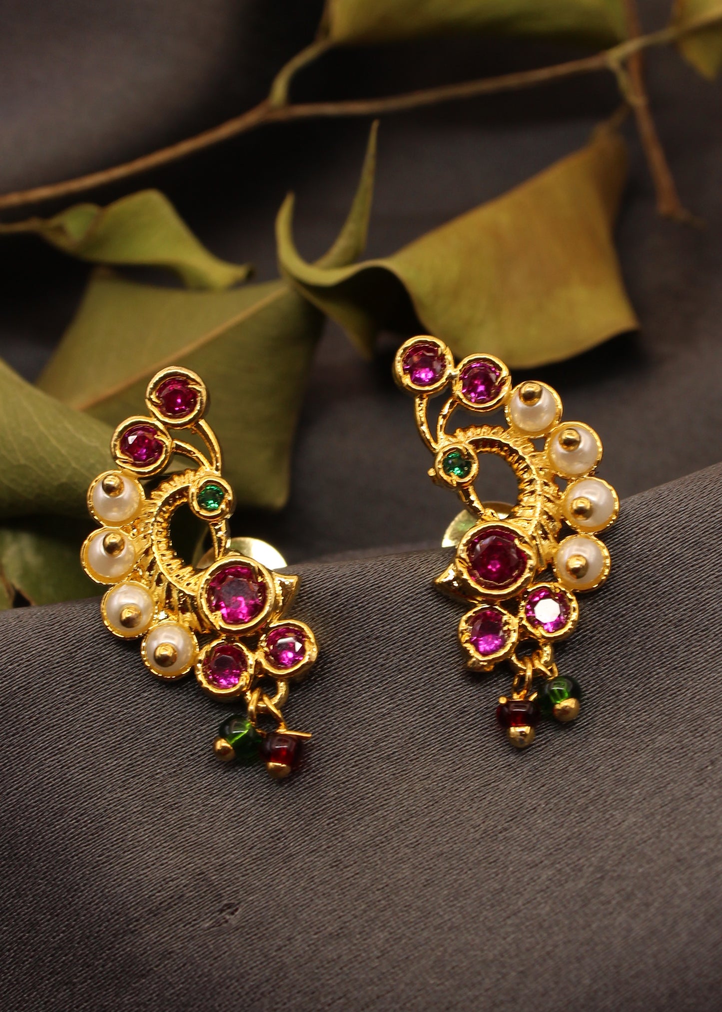 Beautifully designed, these golden traditional earrings from Sonchafa Jewellery certainly deserve a place in your jewellery box. Studded with white pearls, these cuffs will surely fetch you lots of compliments. They are crafted from golden polished copper.