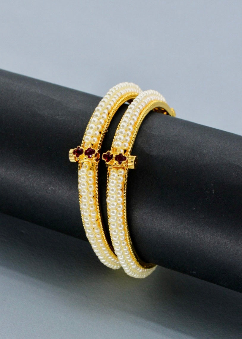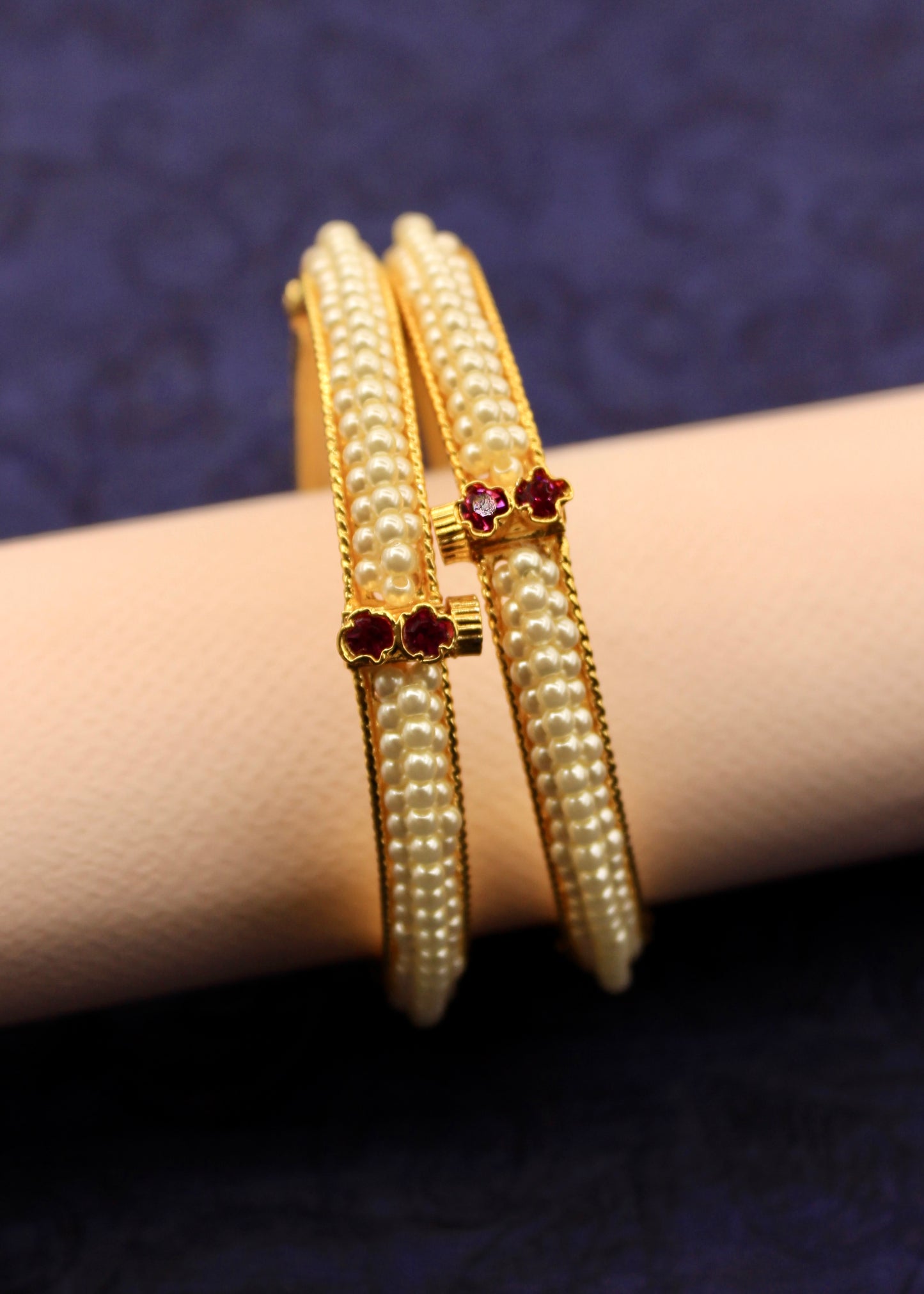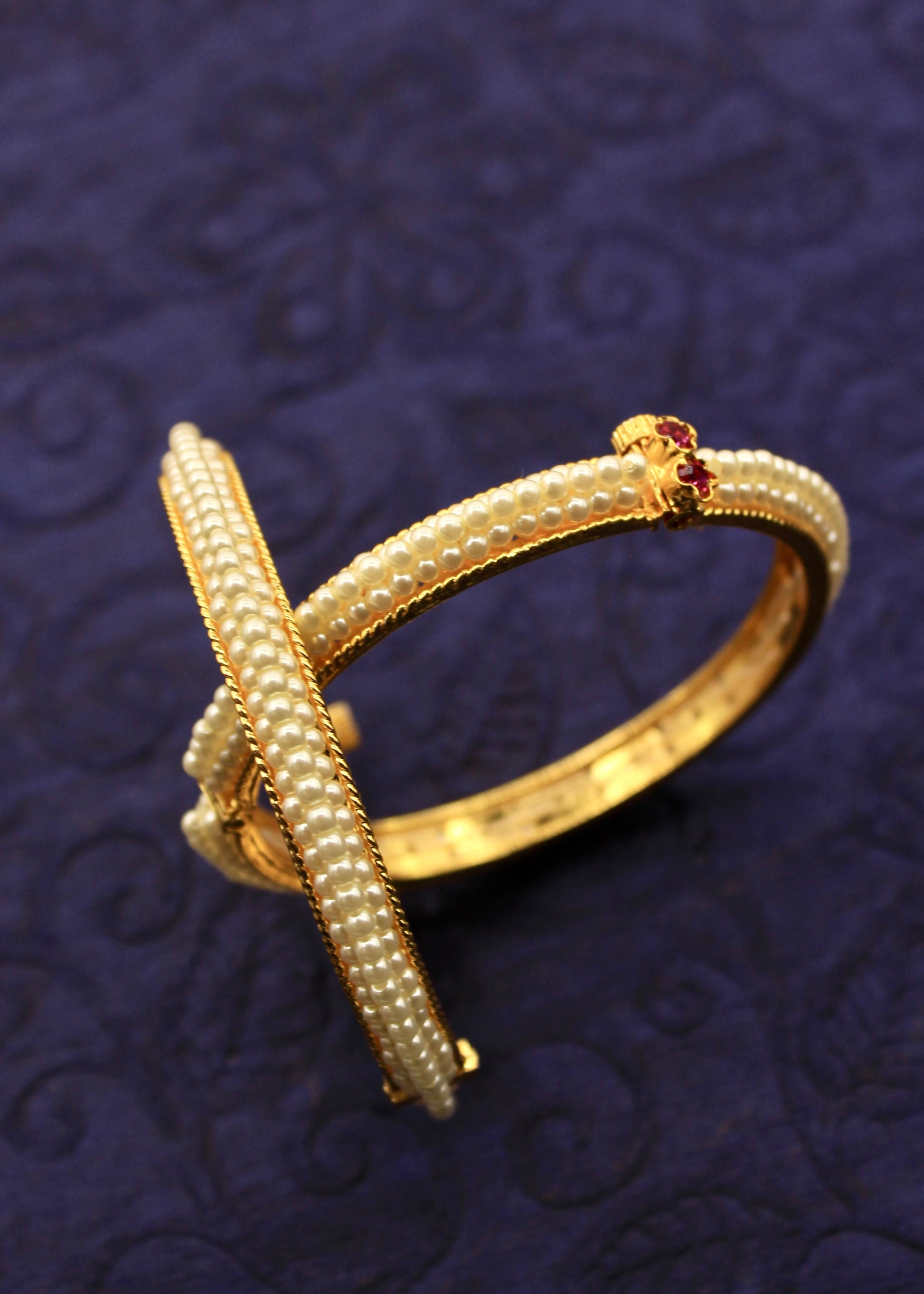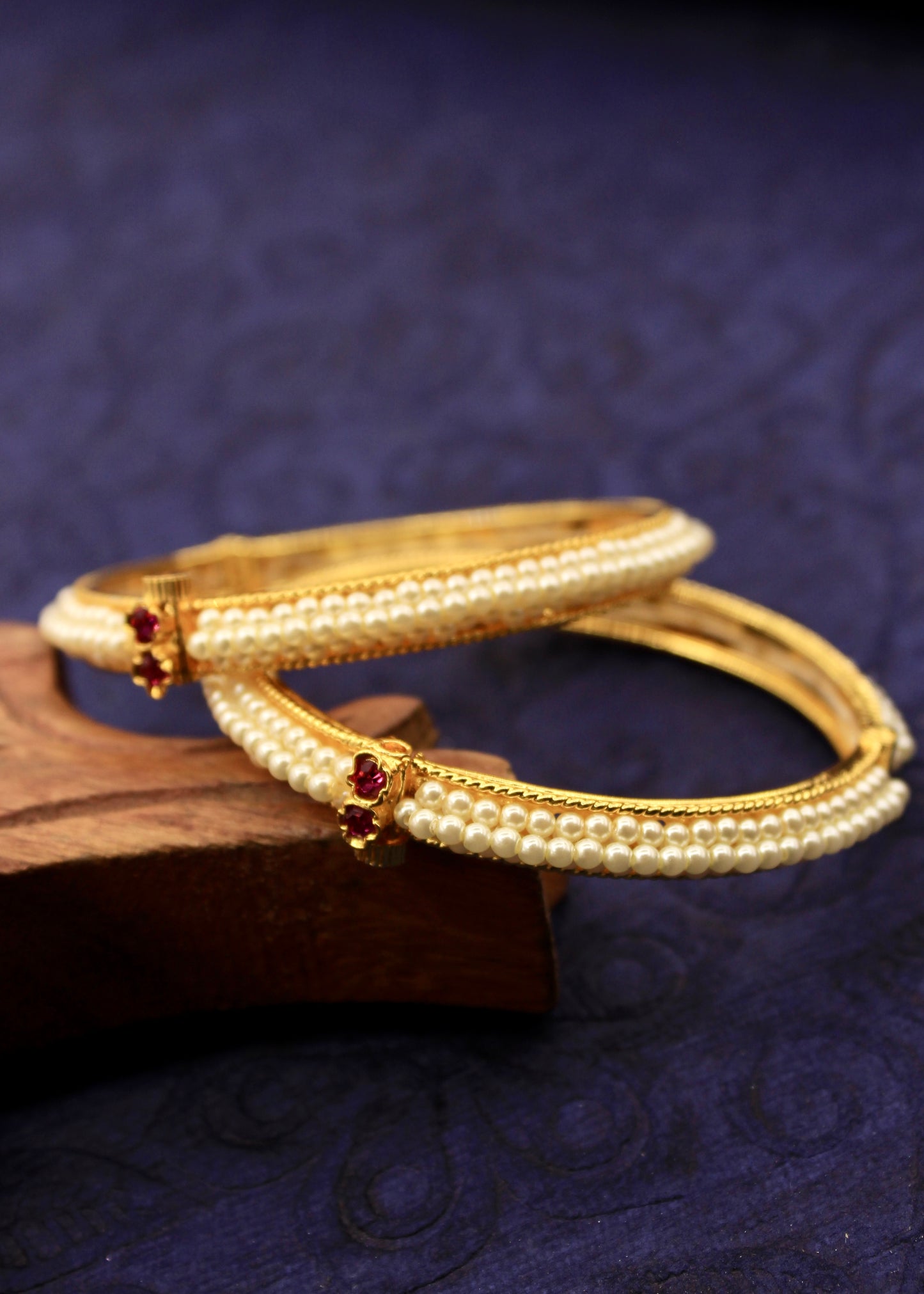 Make a unique addition to your accessory collection by adding this appealing pair of moti bangles from Sonchafa Jewellery. These are embedded with sparkling pink stones and wonderfully woven with attractive moti. These bangles are made from golden finish metal and ensures high durability.