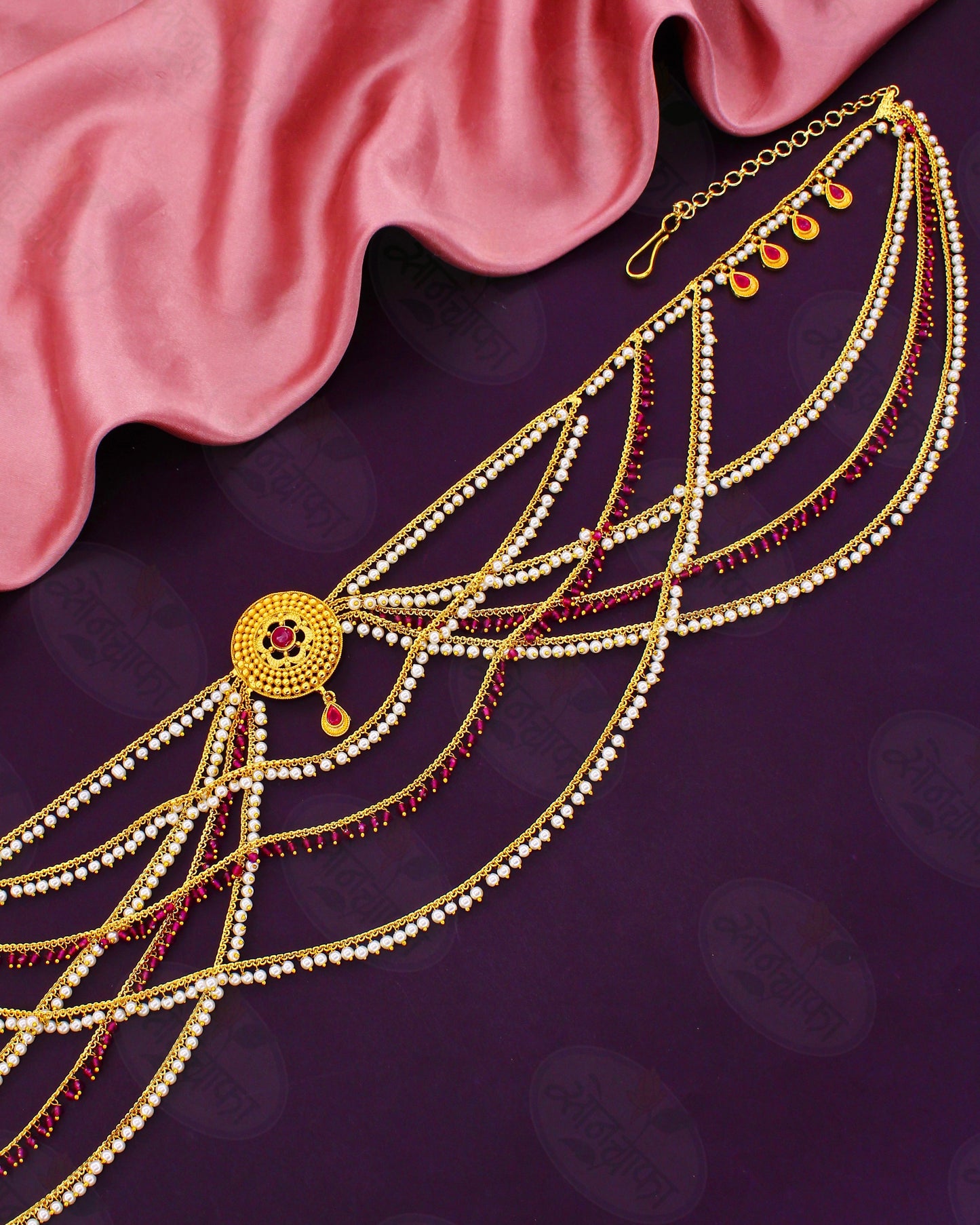 Attractive designer mekhala from Sonchafa Jewellery will help you to complete your traditional look. They are embedded with sparkling pink , white colour stones and made from golden finish metal. These mekhala have maroon bead droplets for added attraction. They are easy to wear .P