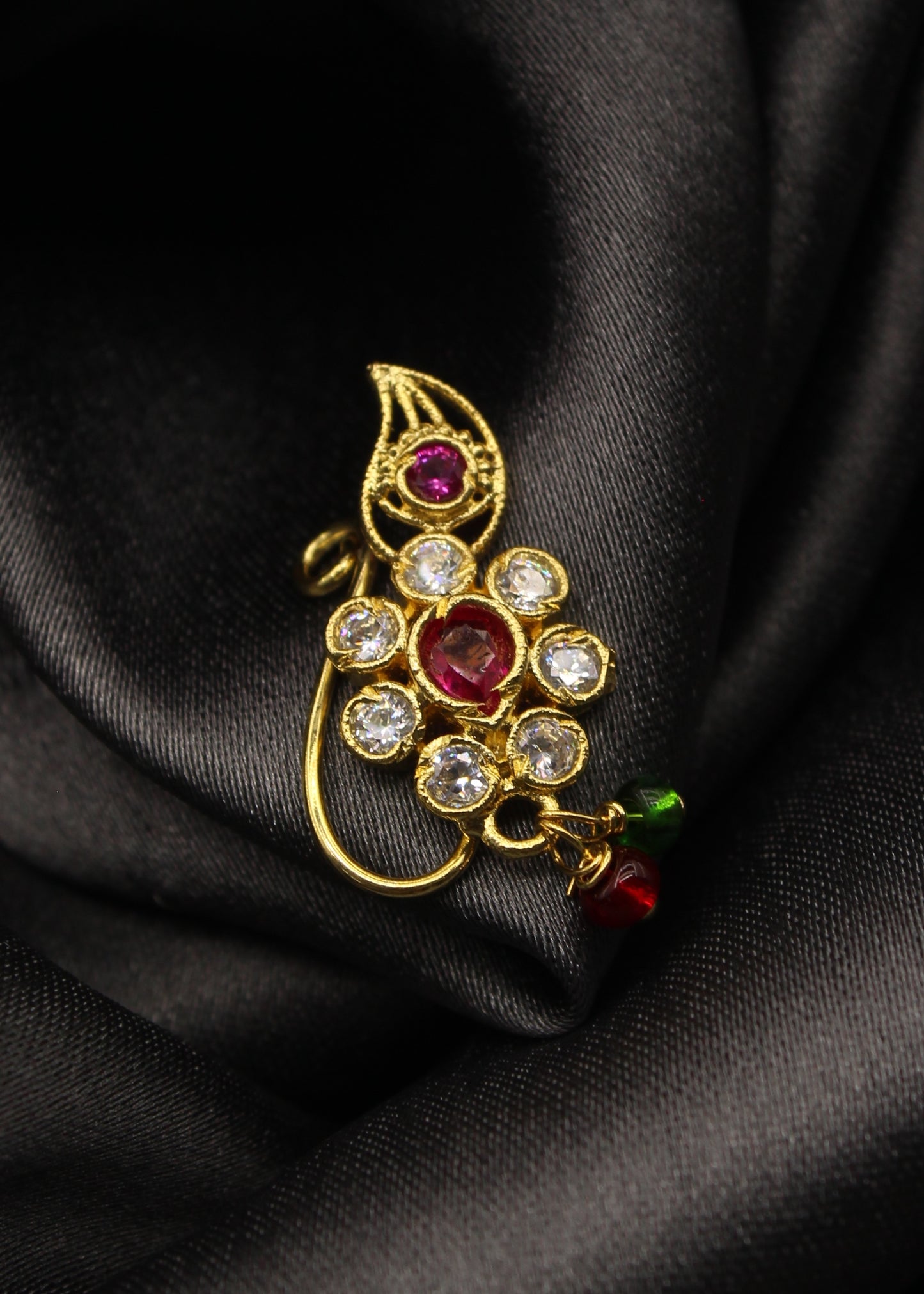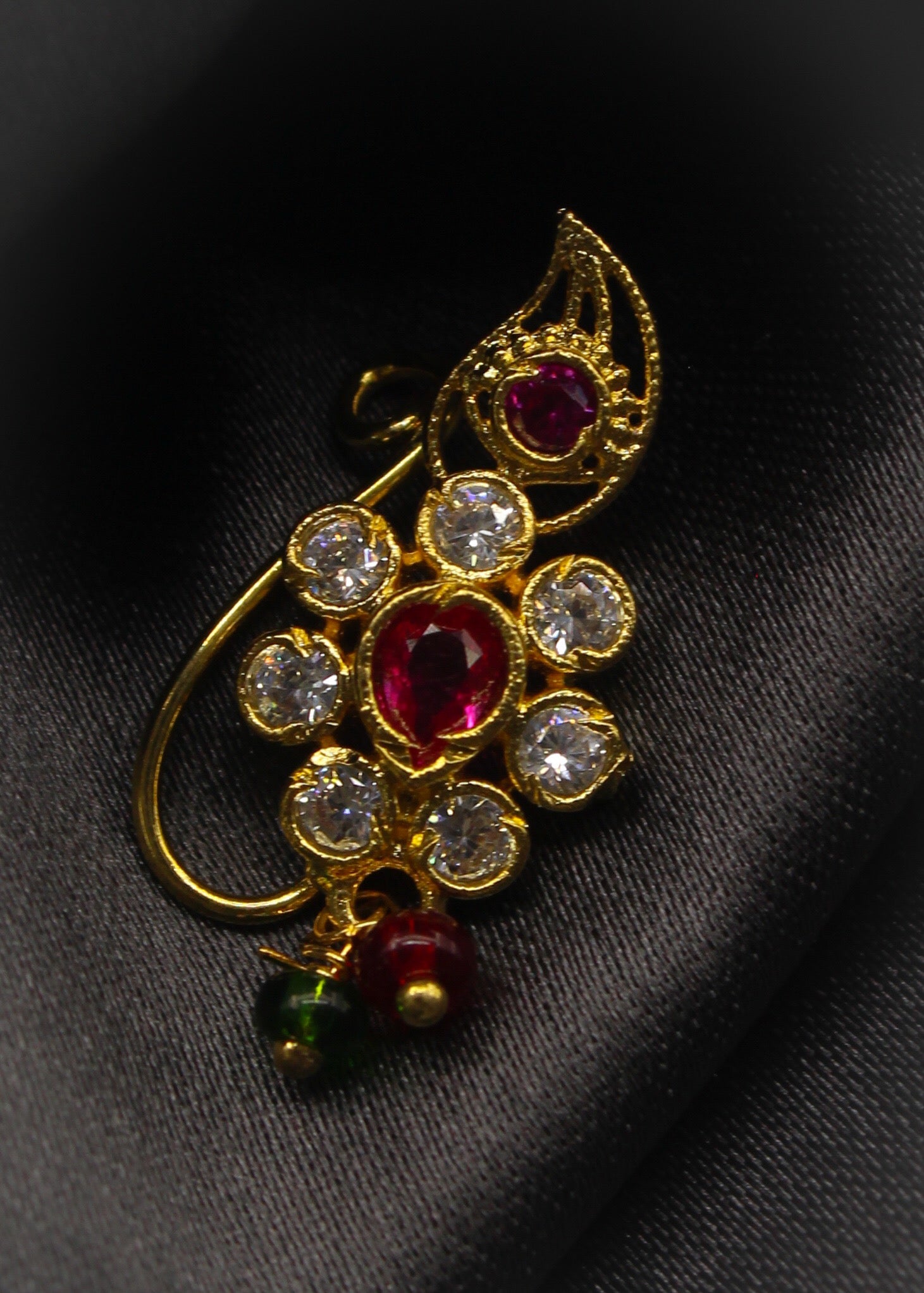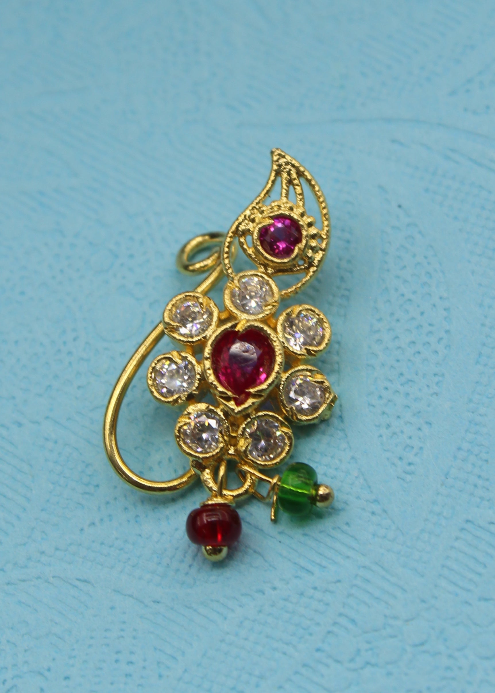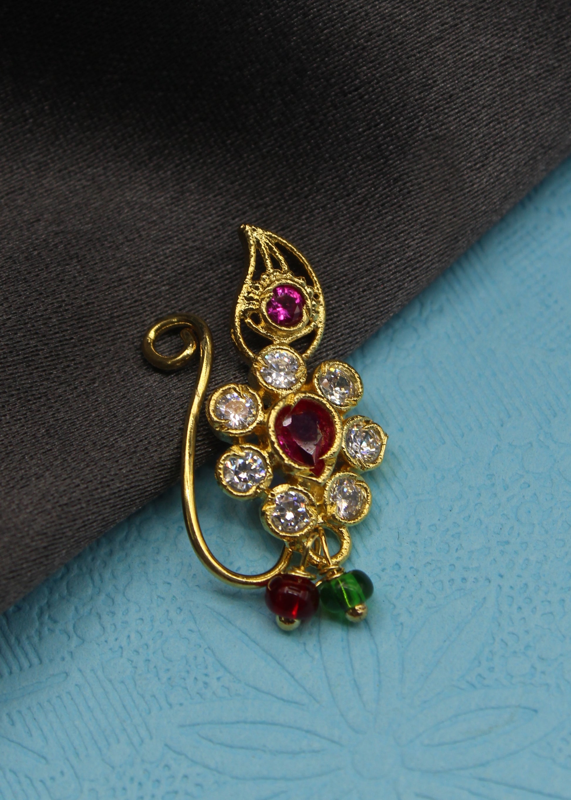 This Leaf with floral designer nath from Sonchafa Jewellery is best pick for women like you. It is styled with studded pink, white colour stone along with pink, green beads and made from metal. This nath is easy to wear and requires piercing.