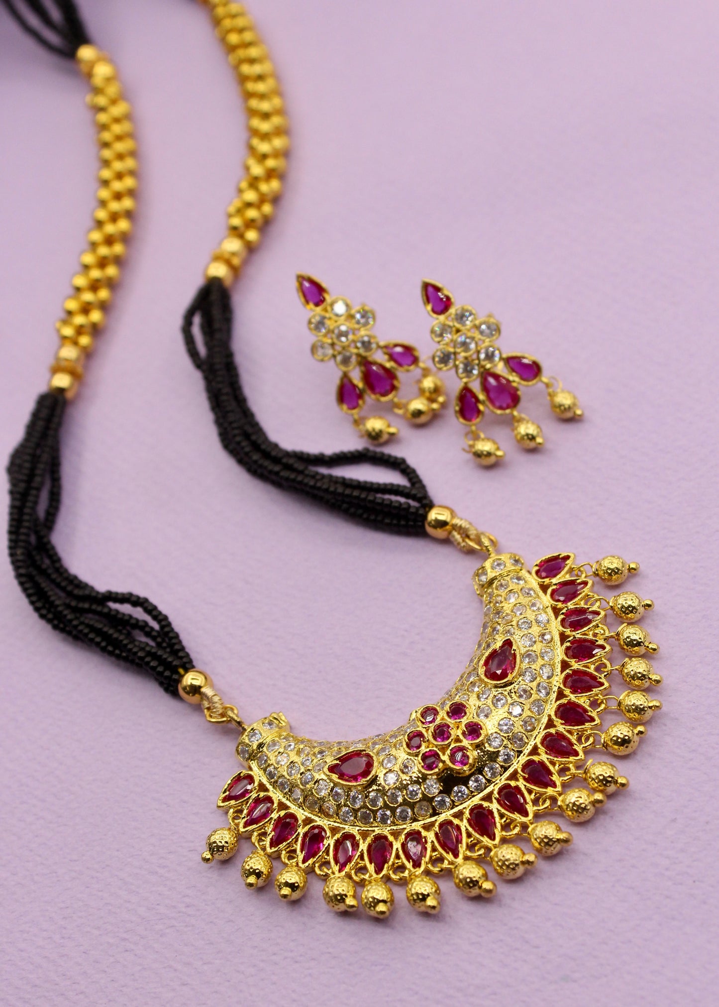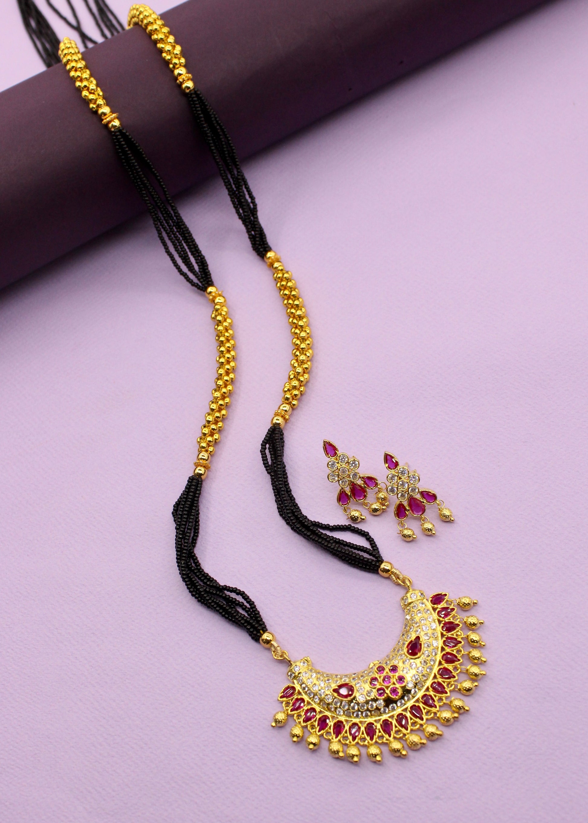 Sonchafa Jewellery offers this black beads styled half -moon designer mangalsutra in classic design. The half -moon design pendant is perfectly studded with pink colored stone & made from golden finish metal. Easy to wear & skin-friendly. Thushi .