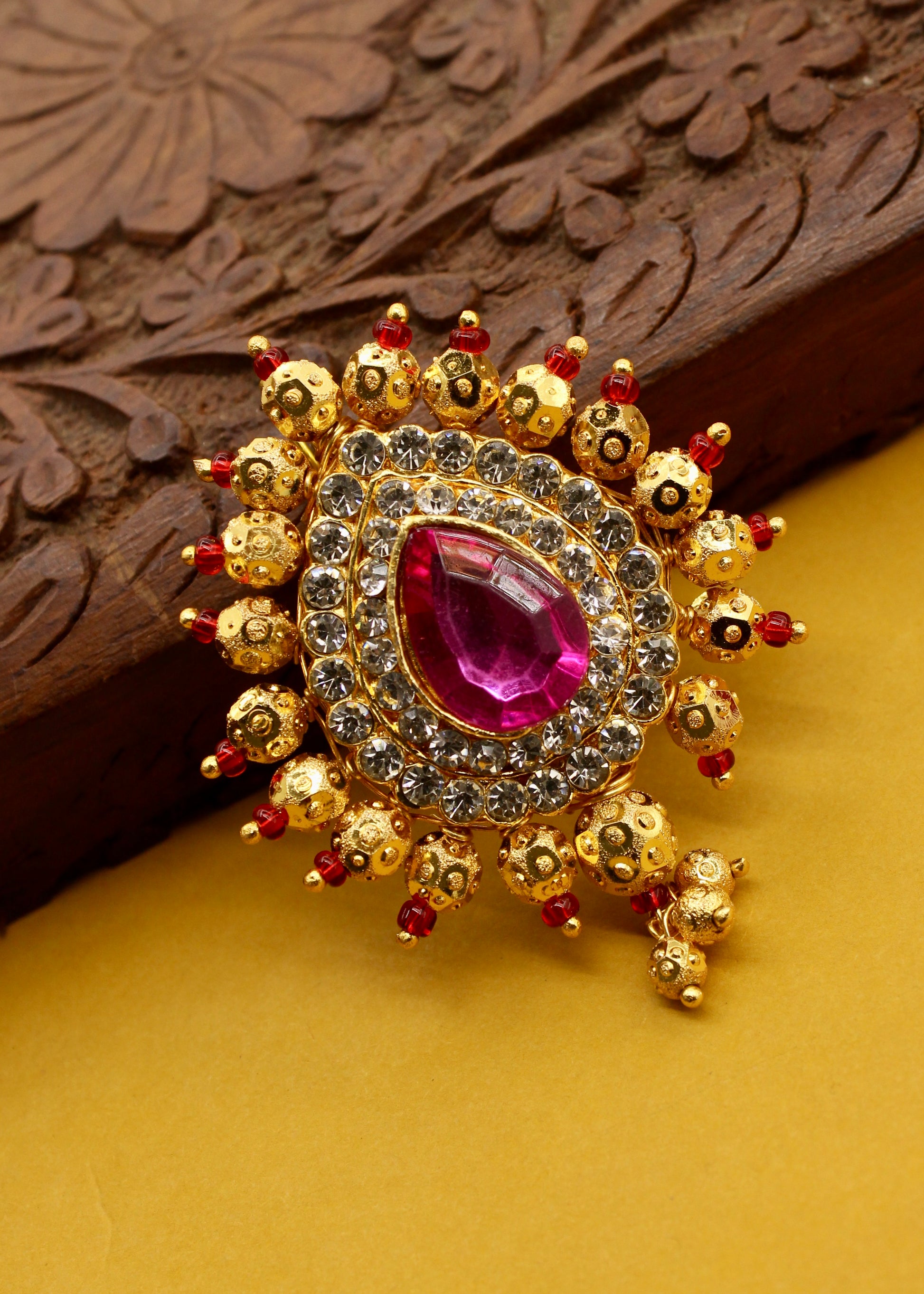 This attractive saree pin brooch for you from Sonchafa Jewellery will surely appeal you at the first glance. It is designed very precisely to give you that premium look. It is encrusted with pink, white stones and made from antique gold finish metal. So get this designer saree pin brooch and turn many heads towards you.