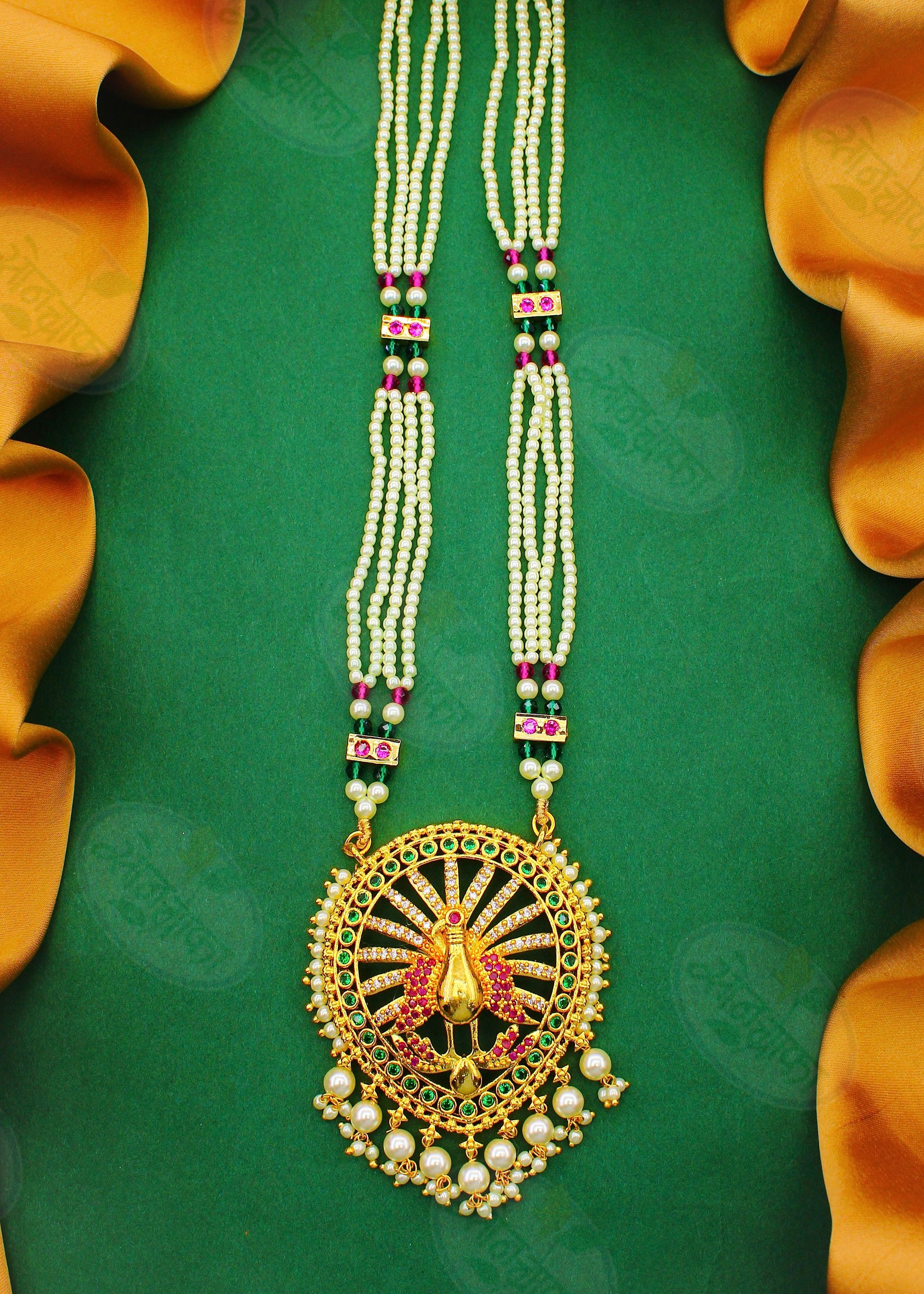 Presenting this royal look designer necklace set for fashion-conscious women like you. It is styled with sparkling pink-white, green stones along with pearls beads. This beautiful necklace set will surely make you look outstanding on festive occasion.