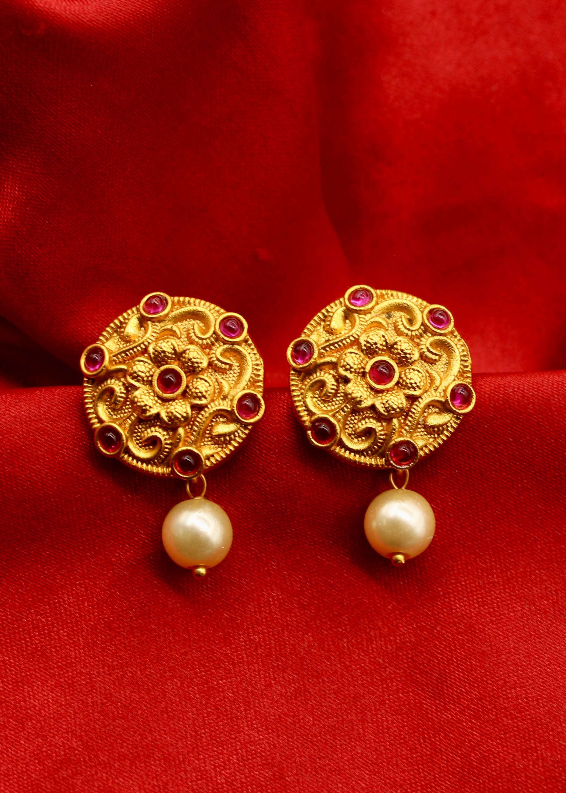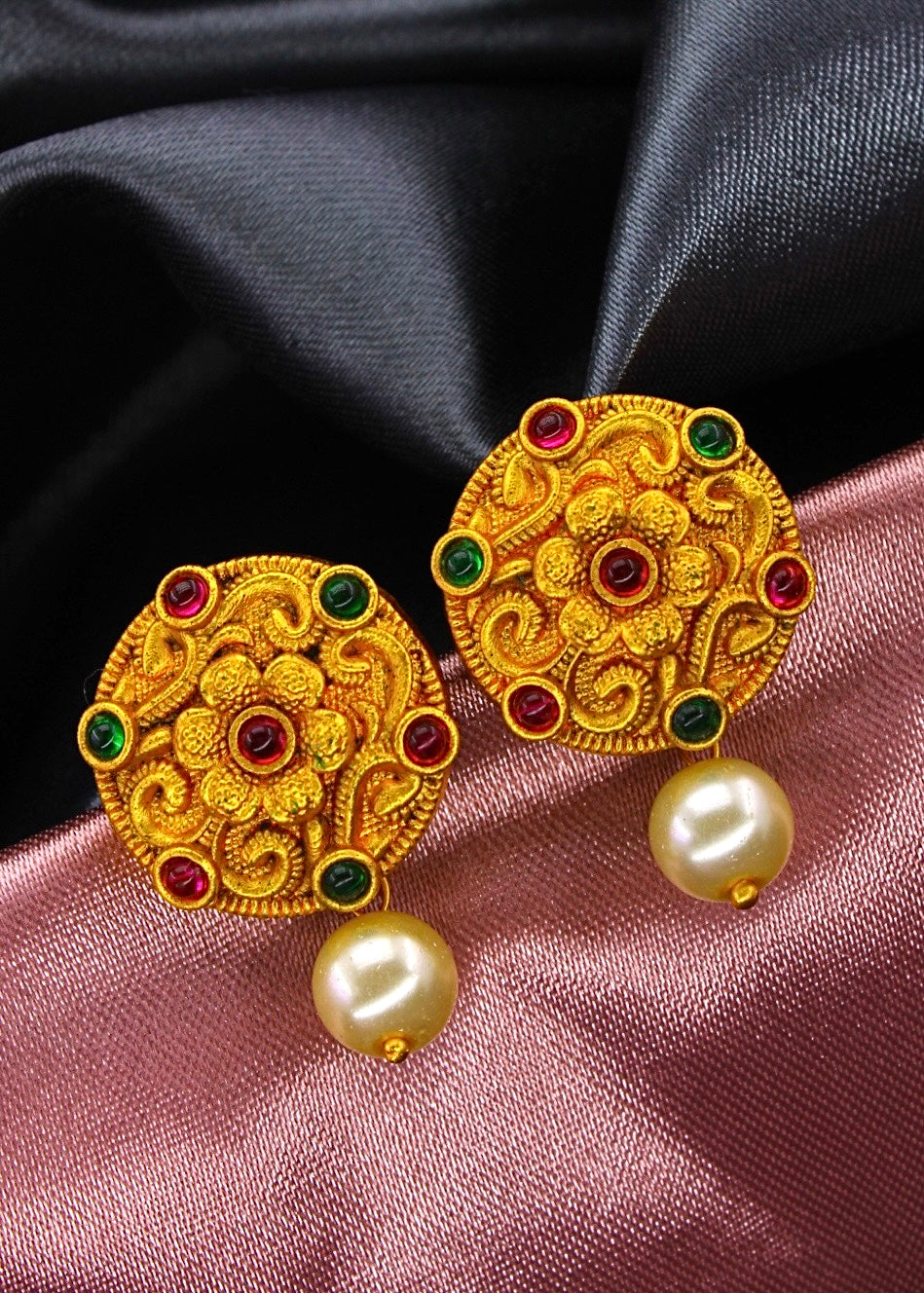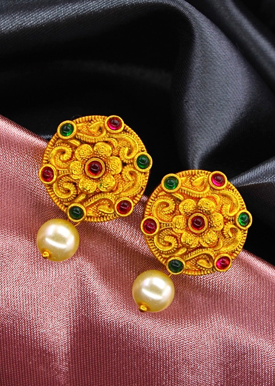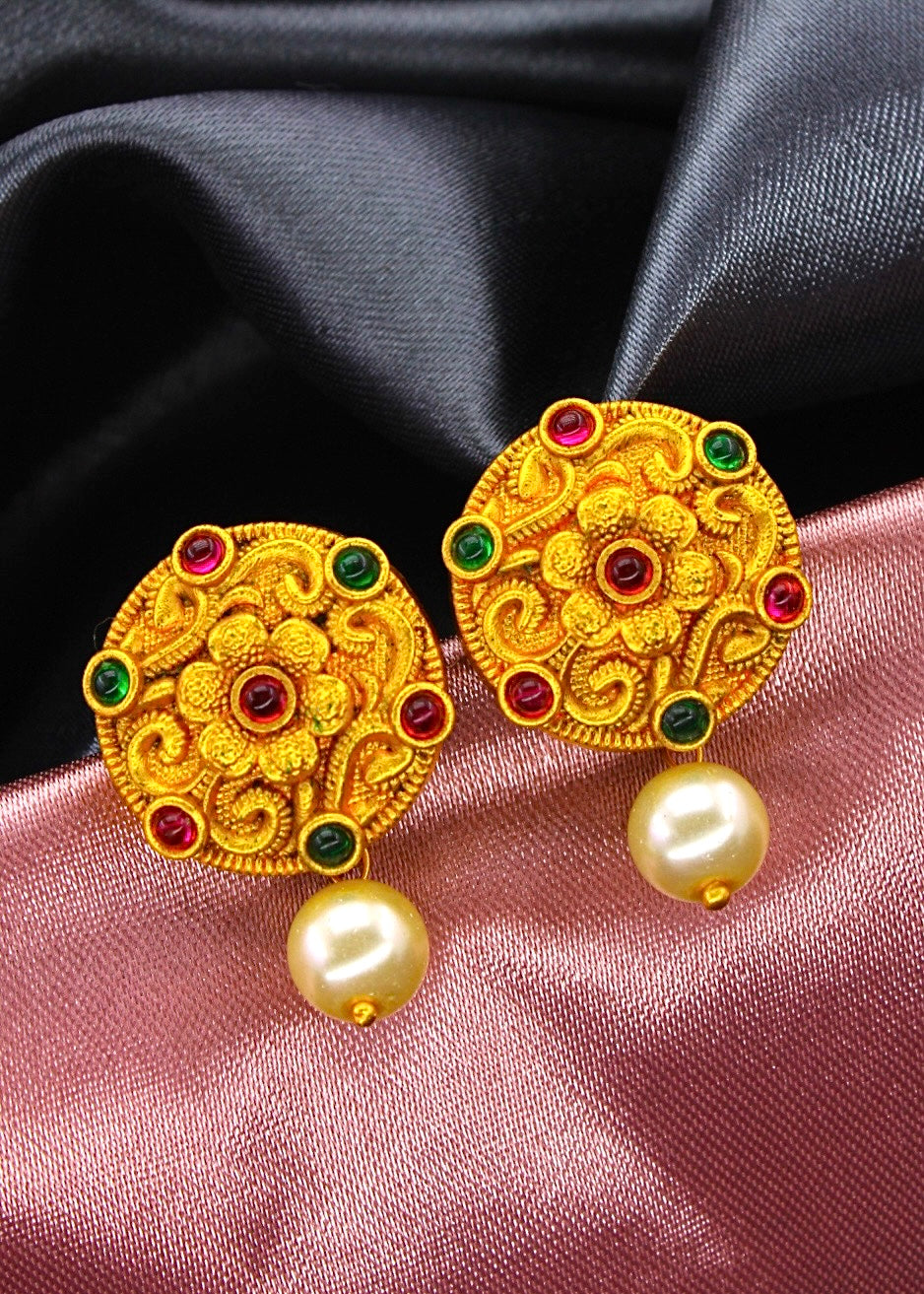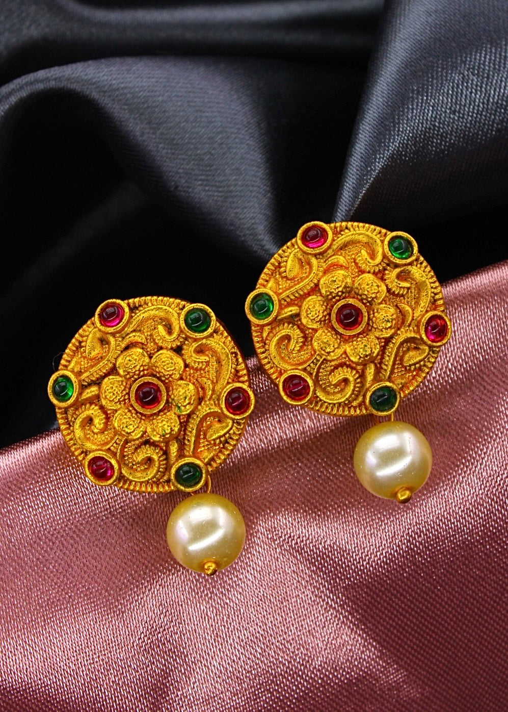 Creatively designed this floral earrings from Sonchafa Jewellery is best to team with festive costume. They are embedded with sparkling pink, green stone along with pearl beads and crafted from matte gold finish metal. It is superior in quality and will retain its shine for years to come.