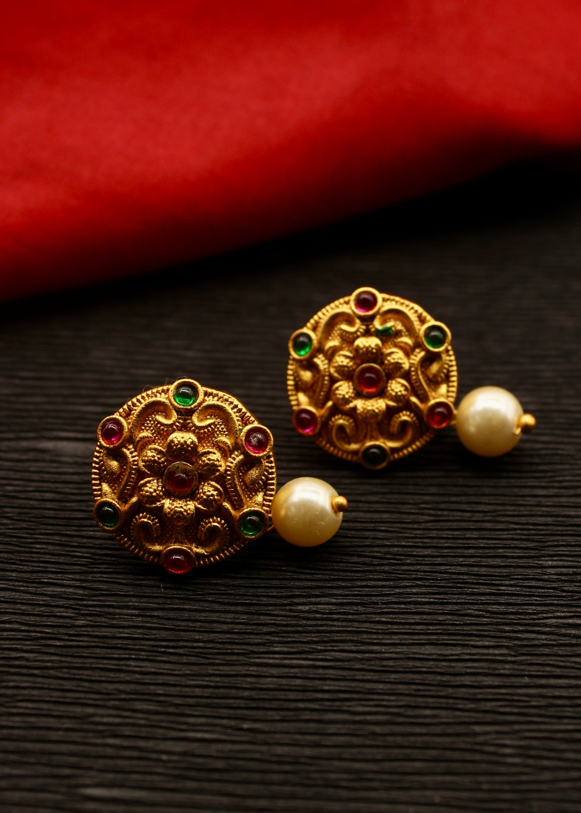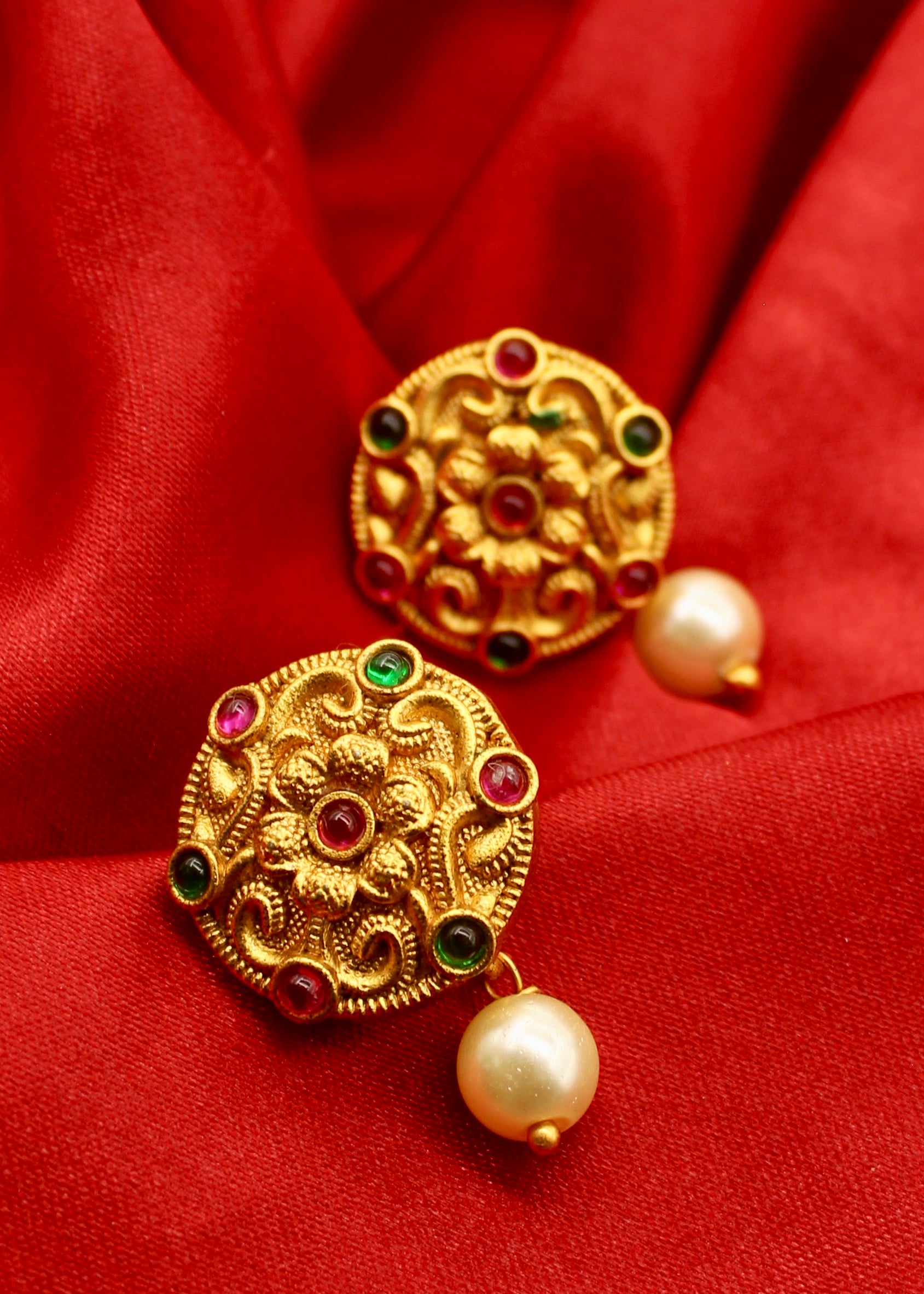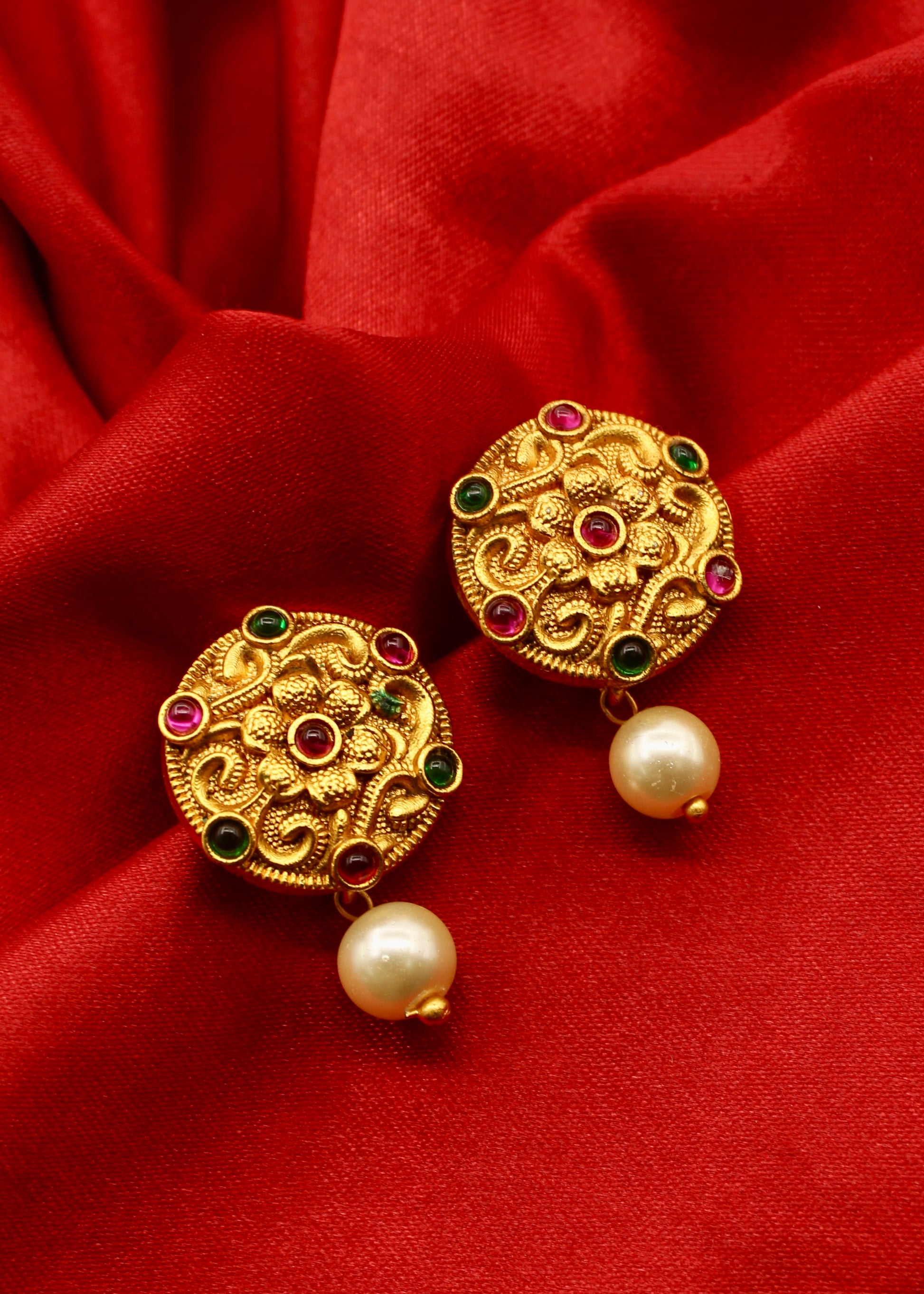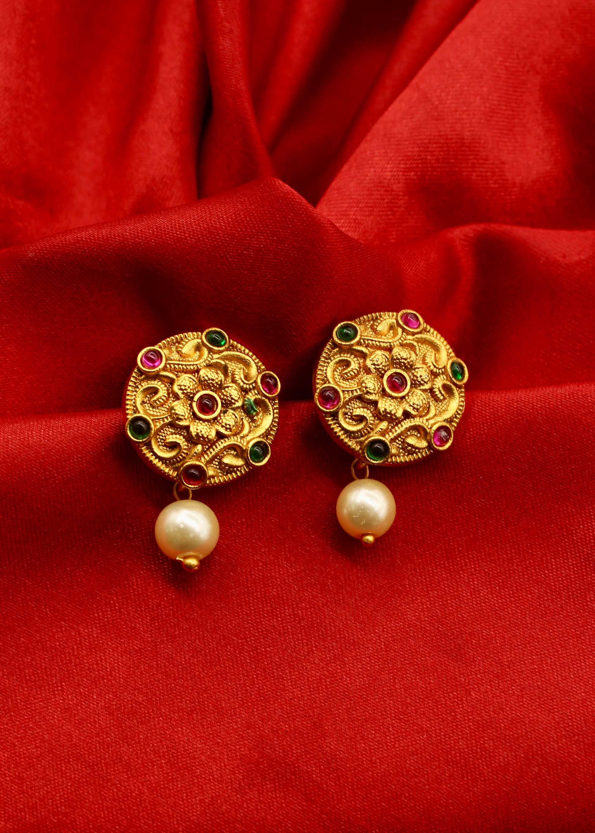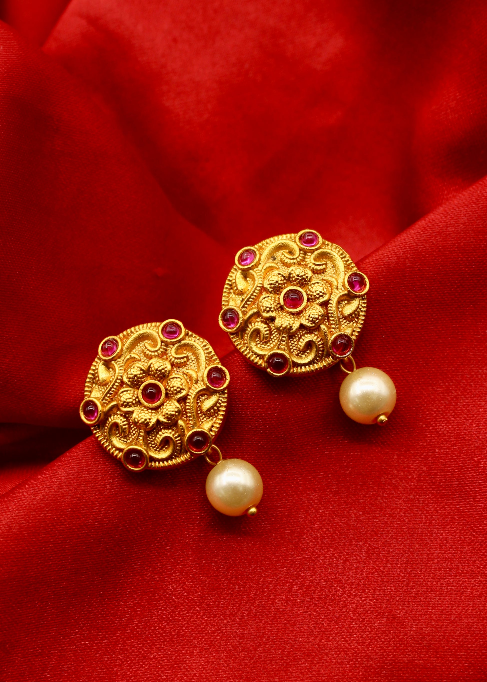 Creatively designed this floral earrings from Sonchafa Jewellery is best to team with festive costume. They are embedded with sparkling pink, green stone along with pearl beads and crafted from matte gold finish metal. It is superior in quality and will retain its shine for years to come.