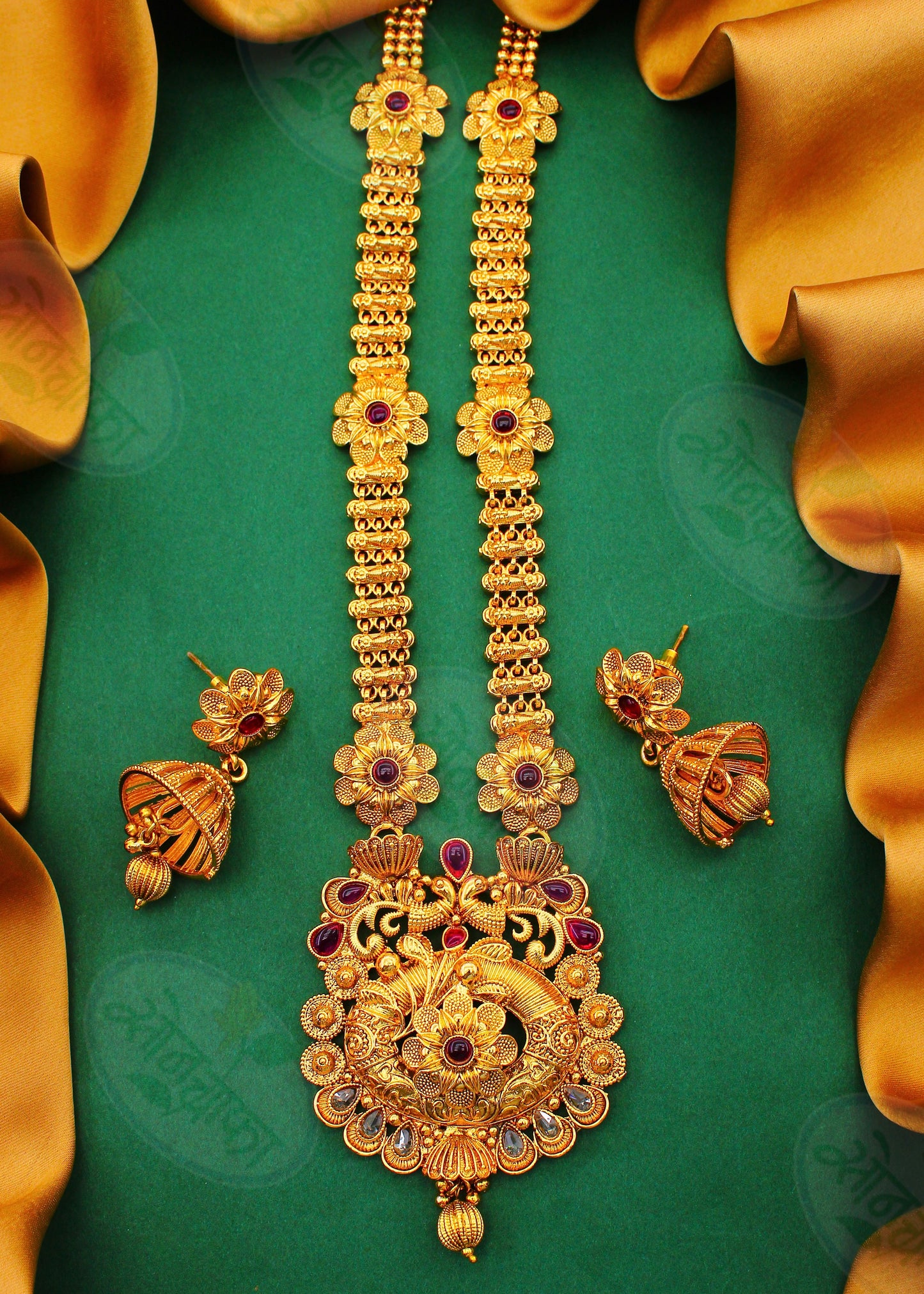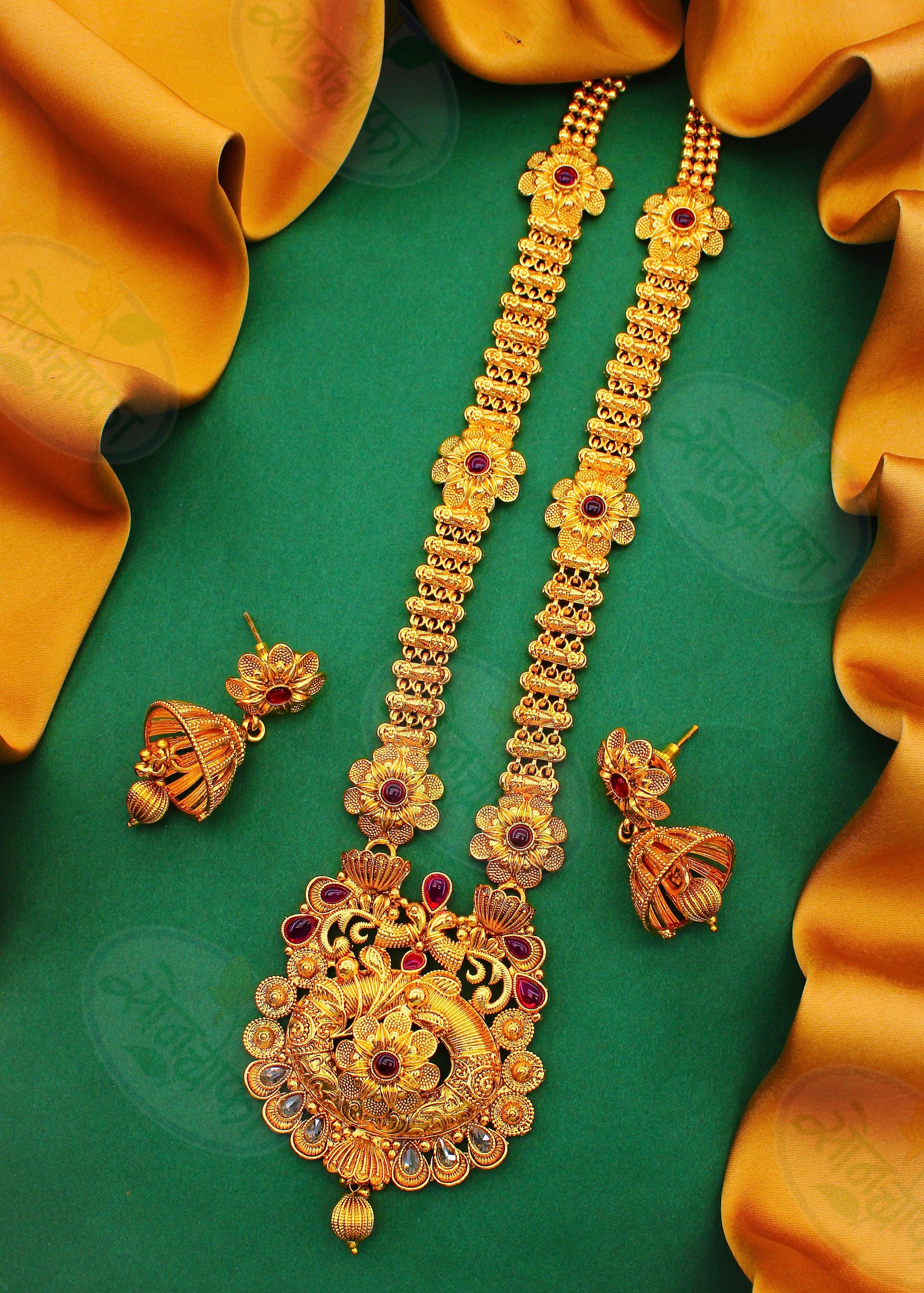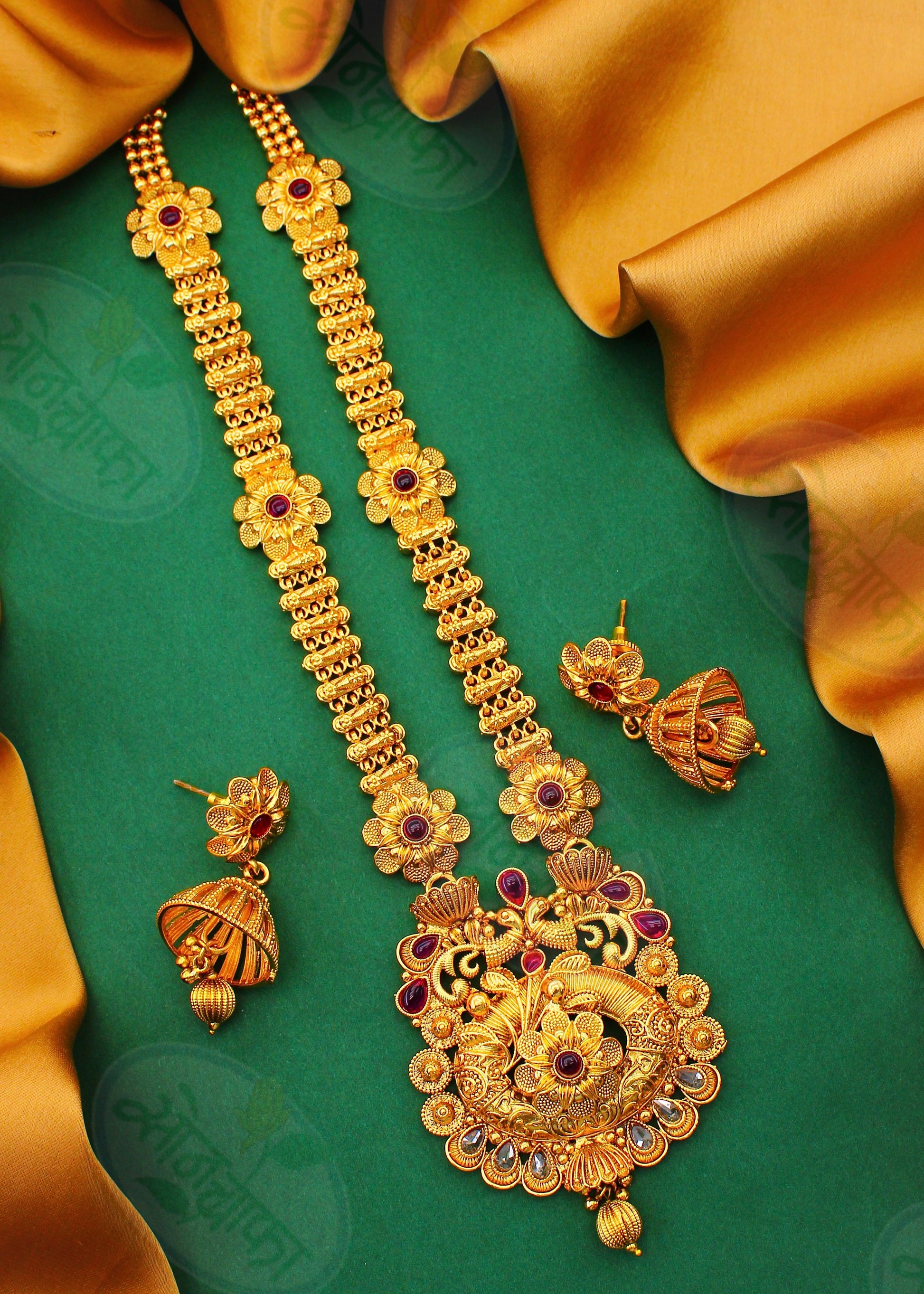 Beautifully designed this traditional antique necklace set from Sonchafa Jewellery is something which will make you look outstanding. This appealing necklace set is fashioned from golden finish metal. This designer necklace set has pearl bead droplet for added attraction.