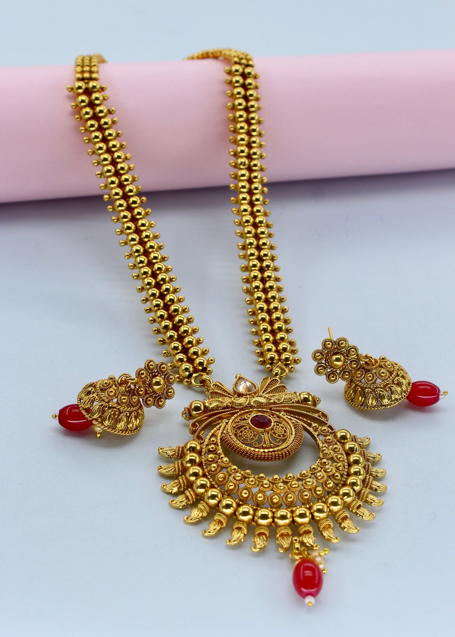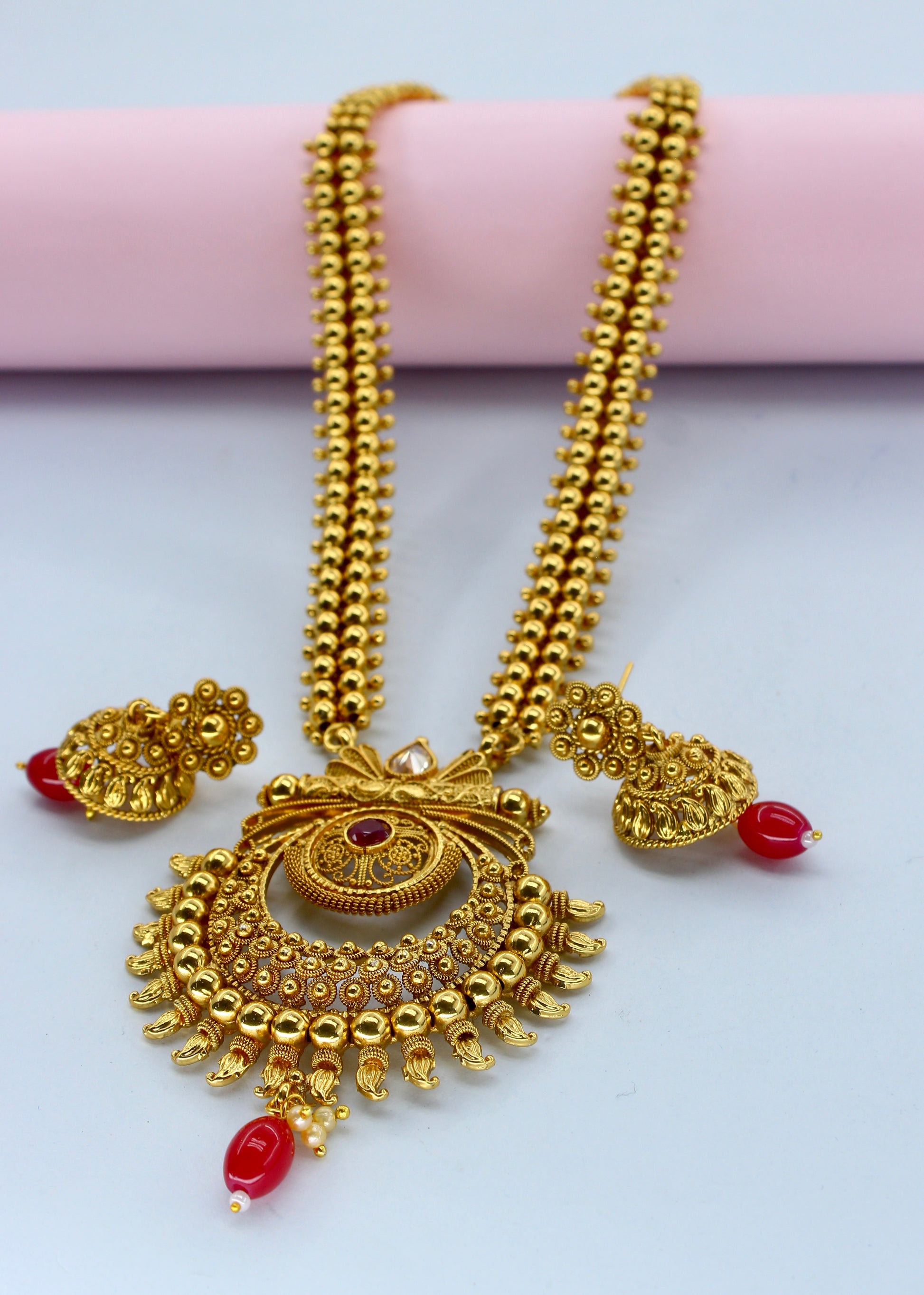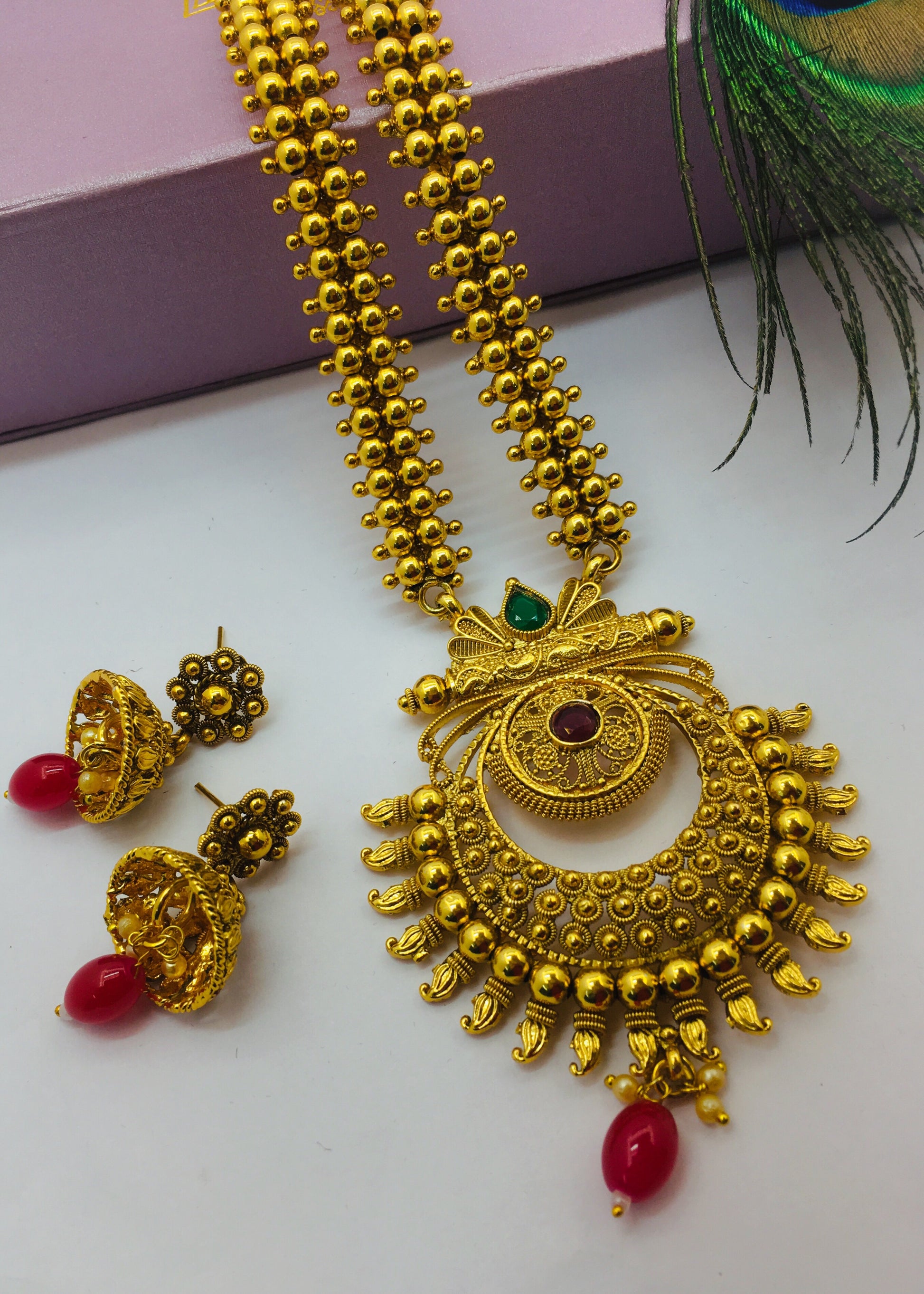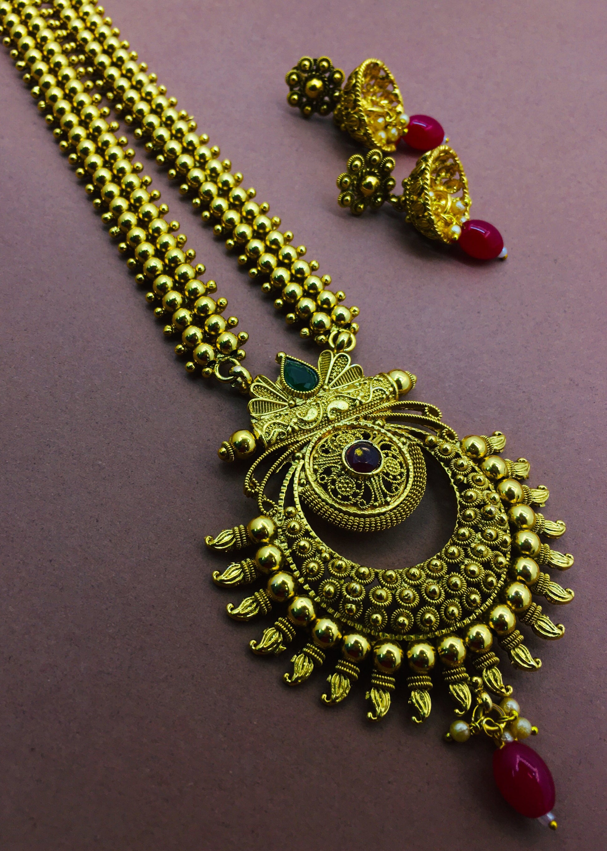 This wedding season Sonchafa brings to you this Antique gold tone wonderful long necklace set in classic look. The ornaments are embedded with sparkling pink, green stones along with golden beads and made from golden finish alloy metal. This set features wonderful intricate carving design. It includes long necklace, pair of matching jhumki earrings.