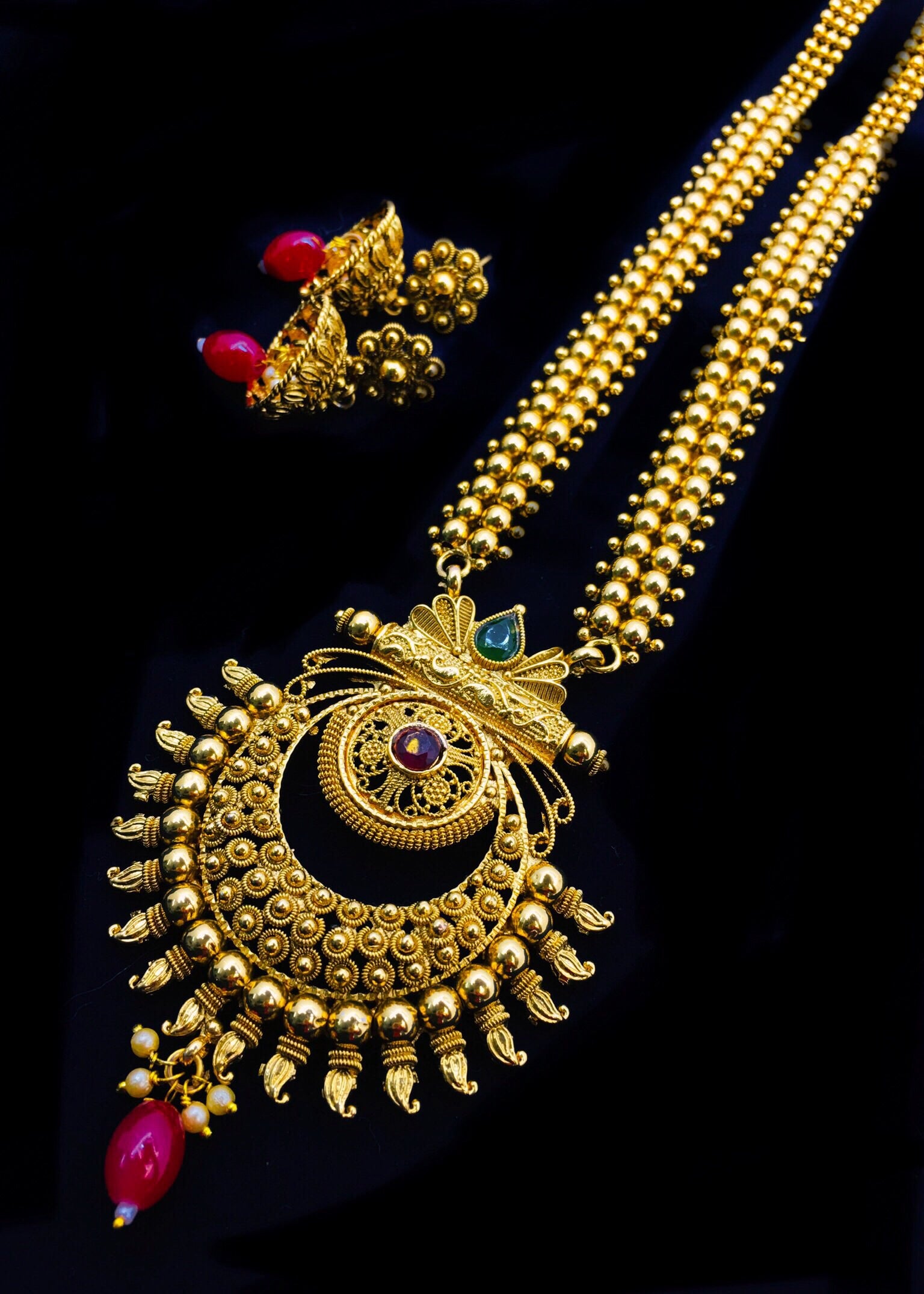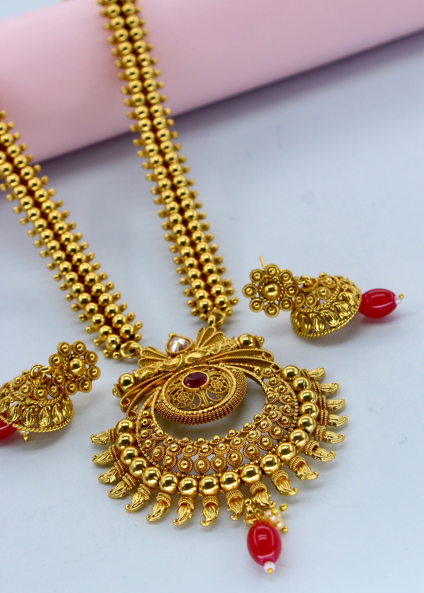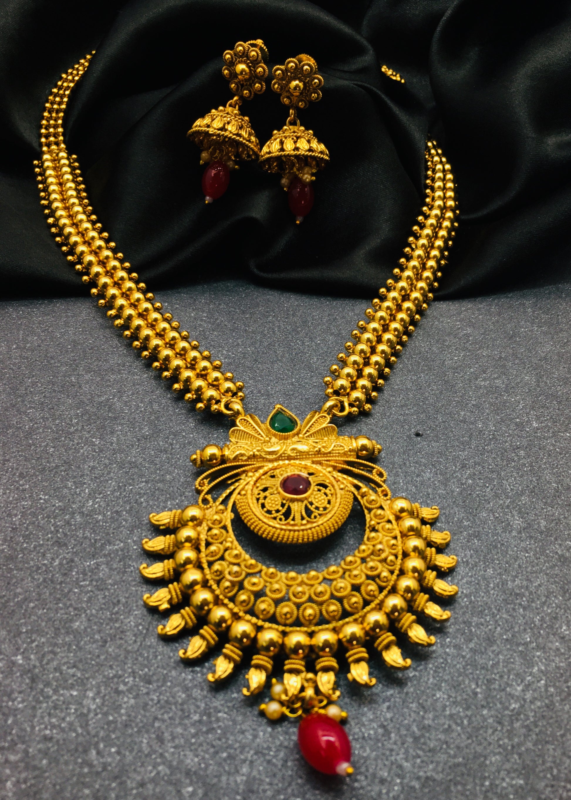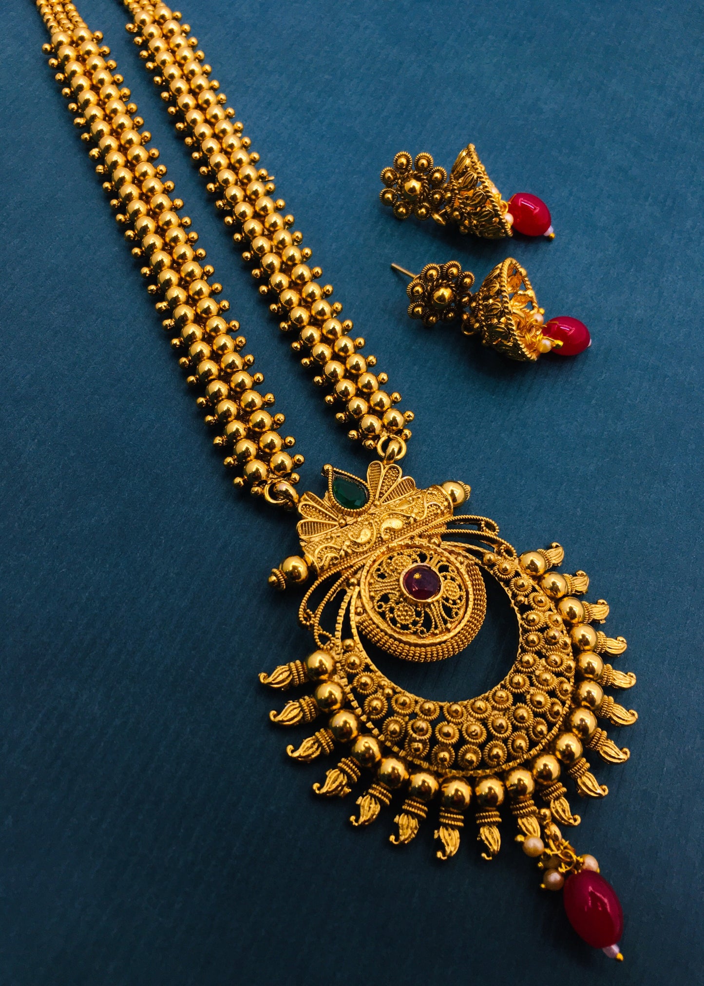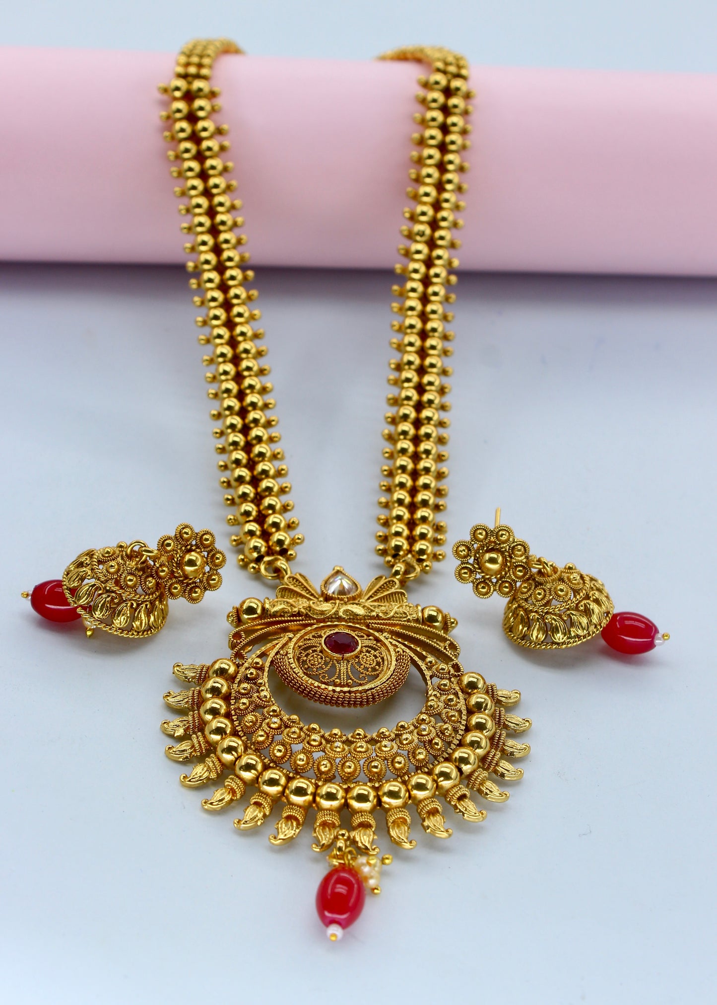 This wedding season Sonchafa brings to you this Antique gold tone wonderful long necklace set in classic look. The ornaments are embedded with sparkling pink, green stones along with golden beads and made from golden finish alloy metal. This set features wonderful intricate carving design. It includes long necklace, pair of matching jhumki earrings.