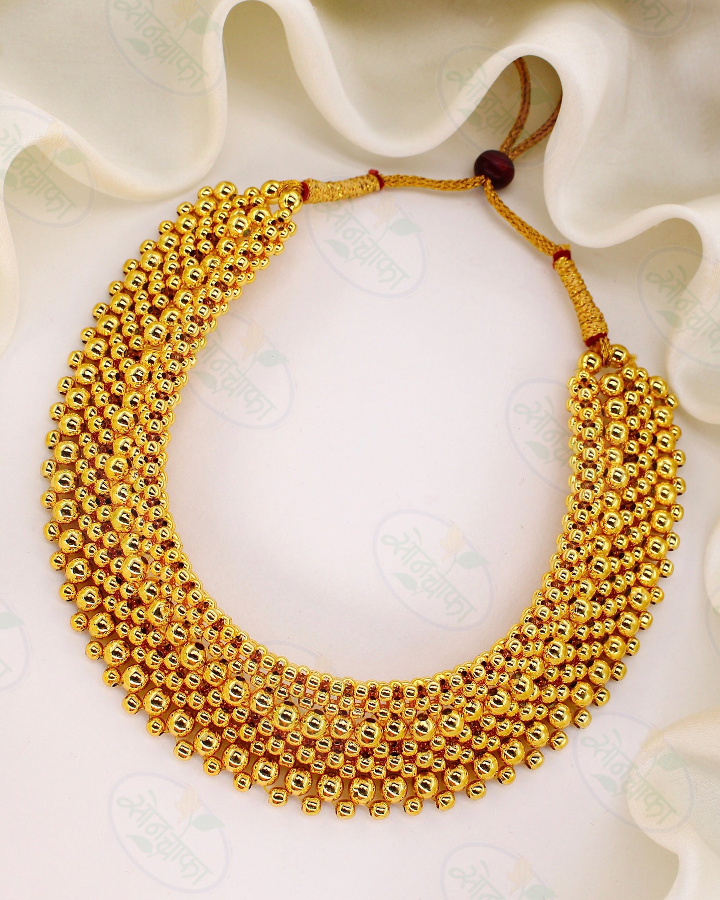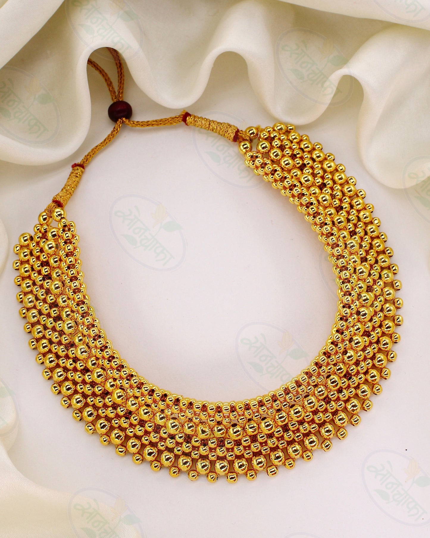 Amazingly attractive and beautiful this Maharashtrian thushi necklace from Sonchafa Jewellery will blow your heart at very first look. The pendant is studded with Golden Beads and crafted from golden finished metal. This thushi necklace is easy to wear as it comes with adjustable dori.