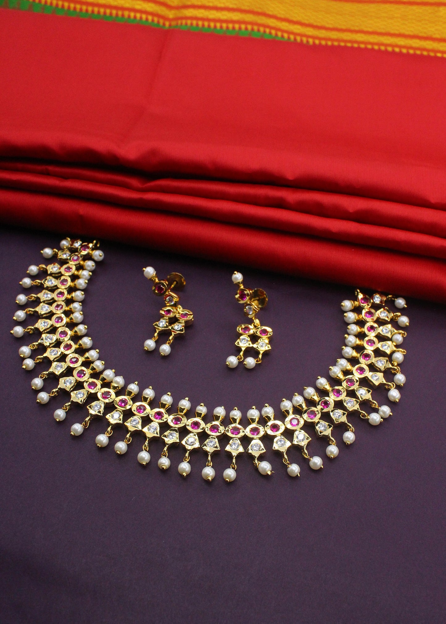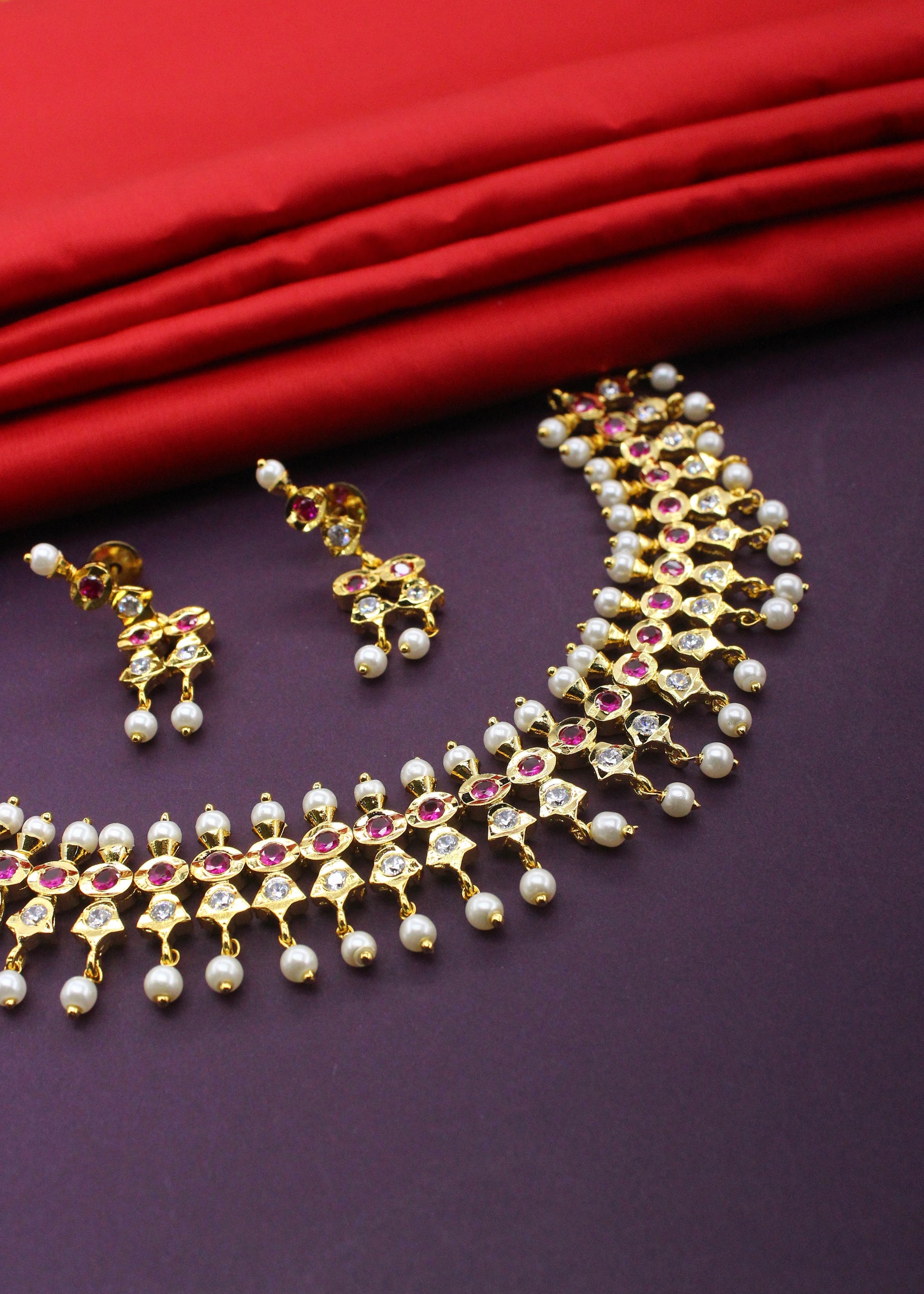 Complete your festive look by clubbing this adorable bridal choker set with your occasional costume. It is studded with sparkling pink-white stones along with pearl beads and made from golden finish metal. The design of this necklace is unique and worth-noticing.