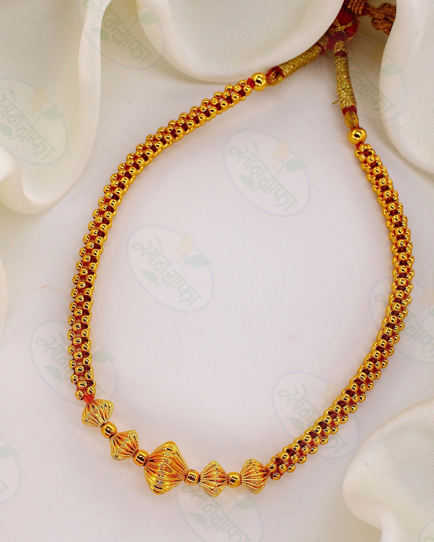 If you wish to get that perfect Maharashtrian look then you must go with this appealing golden finished Kolhapuri designer thushi from Sonchafa Jewellery. It is woven with golden beads and crafted from superior quality metal.