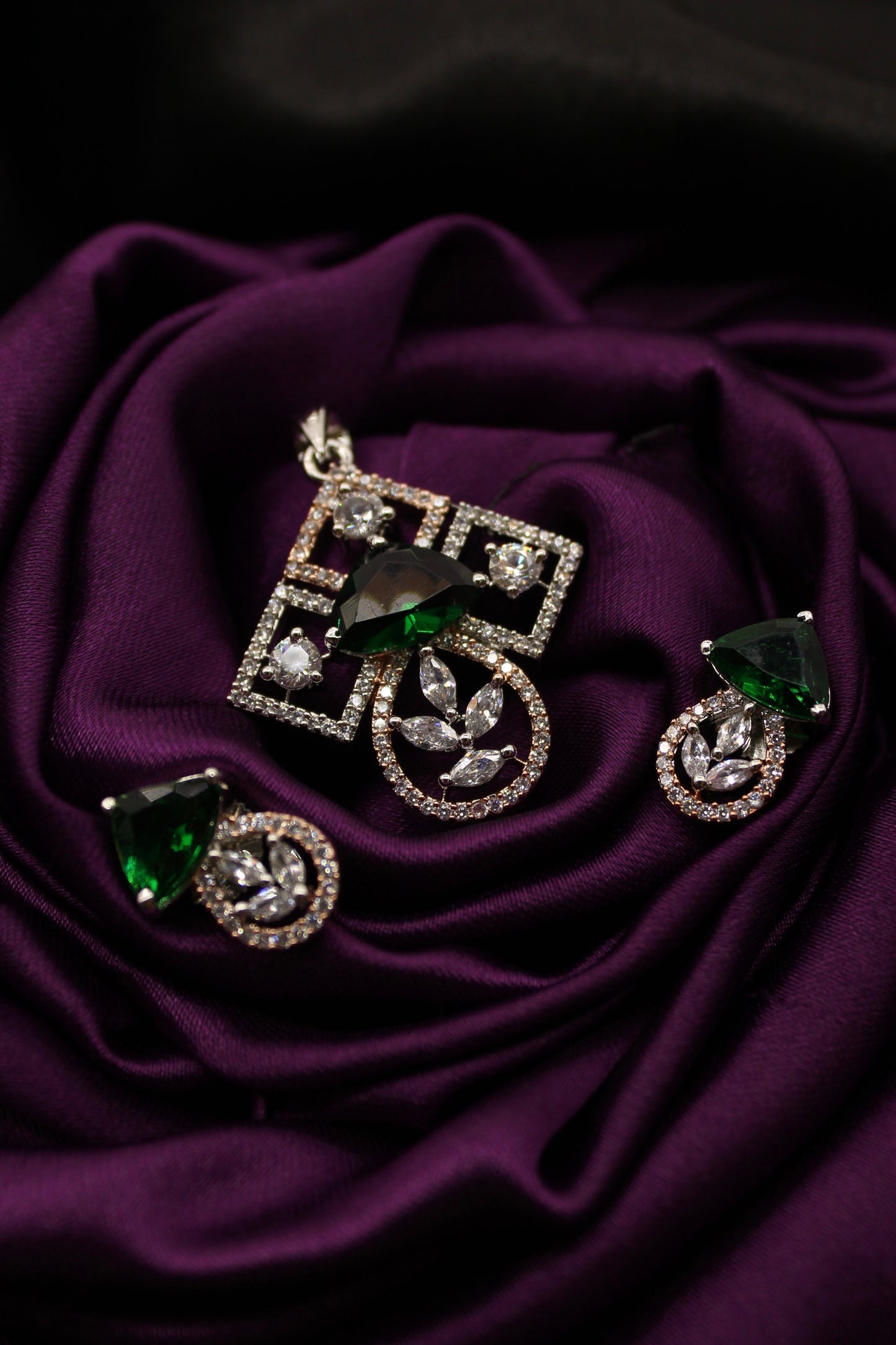 Sonchafa Jewellery present beautifully designed pendant set studded with white, green, pink stone and made with good quality of rose gold-silver finish metal and highly durable. Turn many heads towards you by wearing this pendant set on perfectly matched attire.