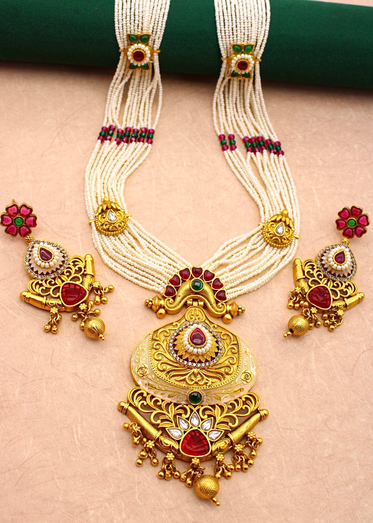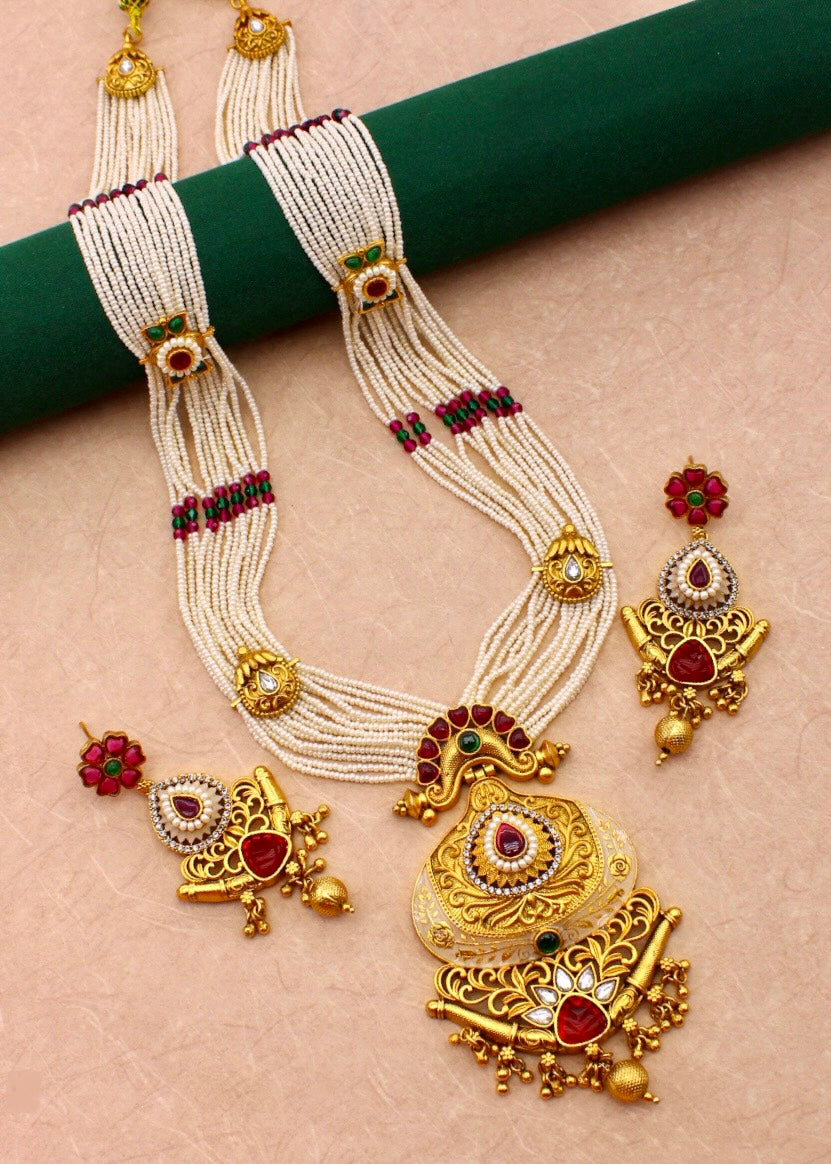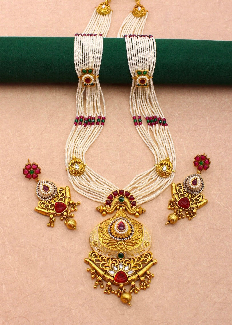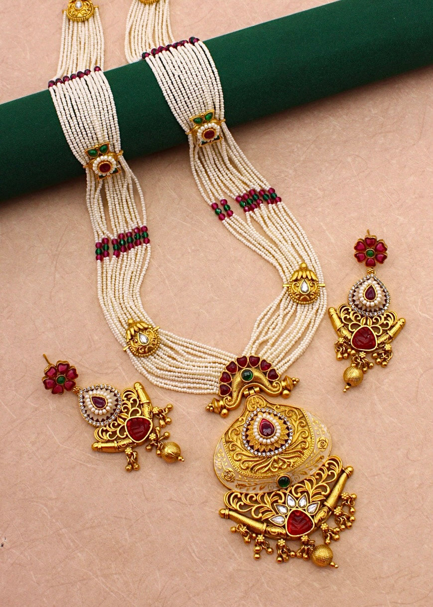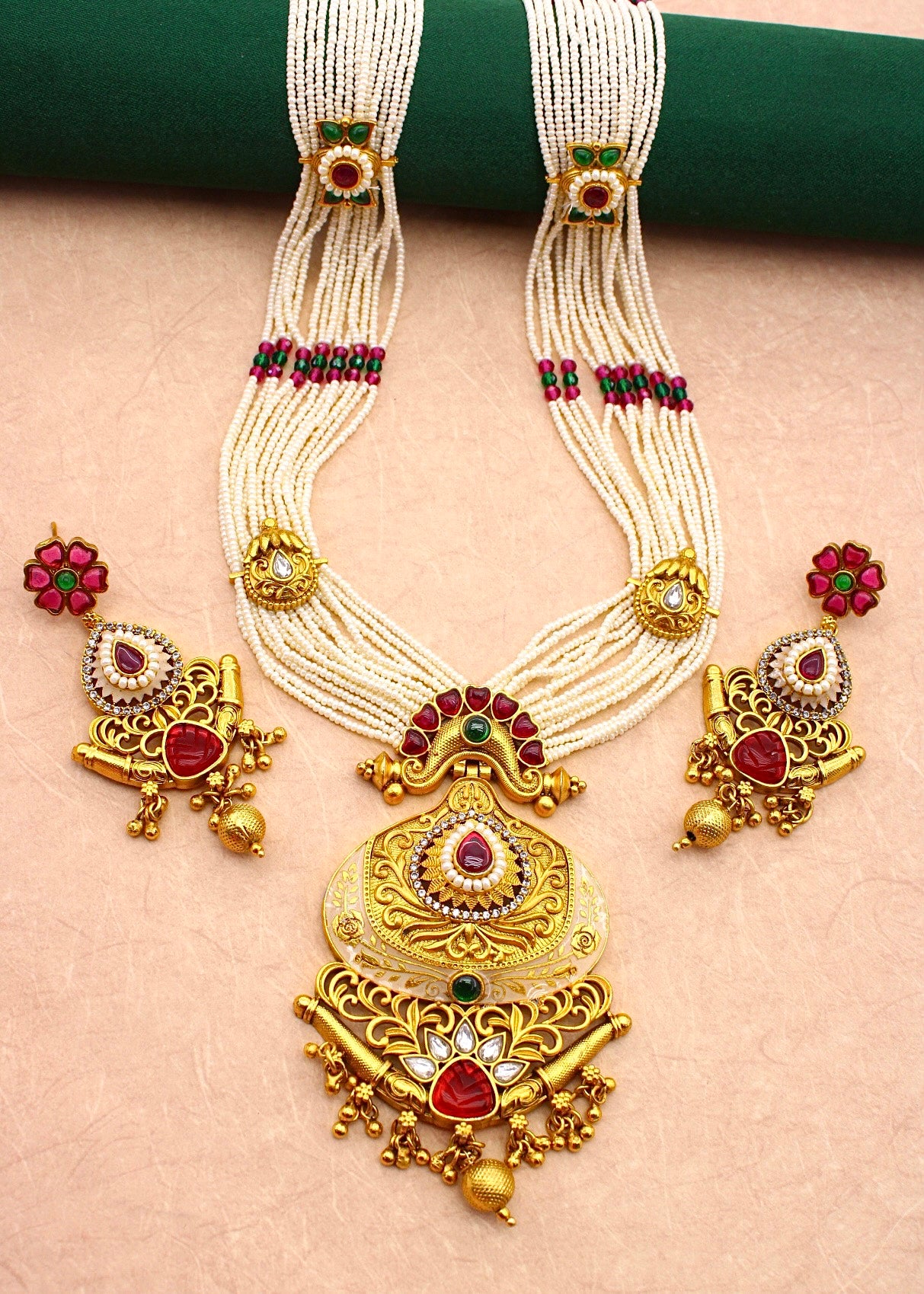 This adorable Moti Necklace set from Sonchafa Jewellery will strike you at very first look. It is encrusted with pink, green, white stones & wonderfully woven in pearl, pink-green beads and made from matte gold finish metal. In addition the neck-piece of this set comes with adjustable dori so you can fit it properly. It is highly durable and skin-friendly as well. Pendant is decorated with dangling golden beads droplet along with leaf design.