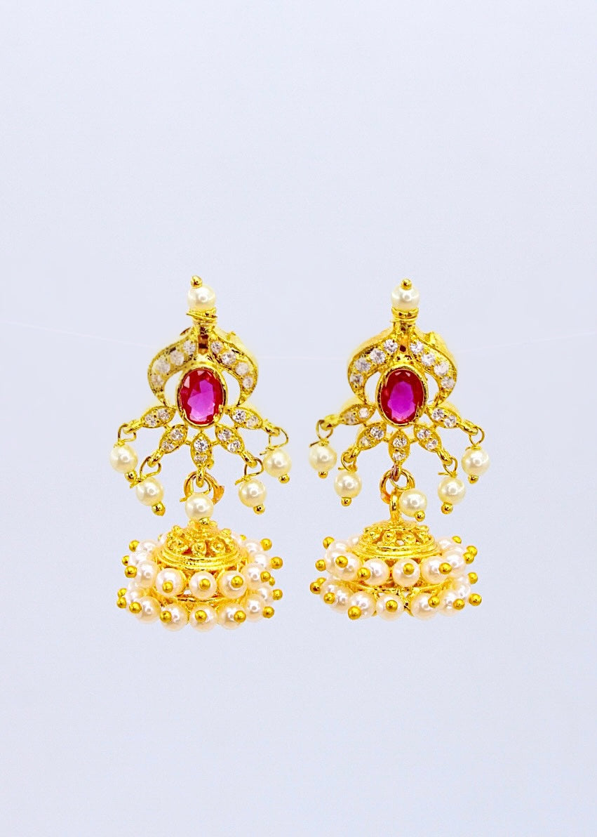 Beautifully designed, this pink colour jhumki earrings from Sonchafa Jewellery is perfect to enhance your maharashtrian appearance. Crafted from golden finish metal.