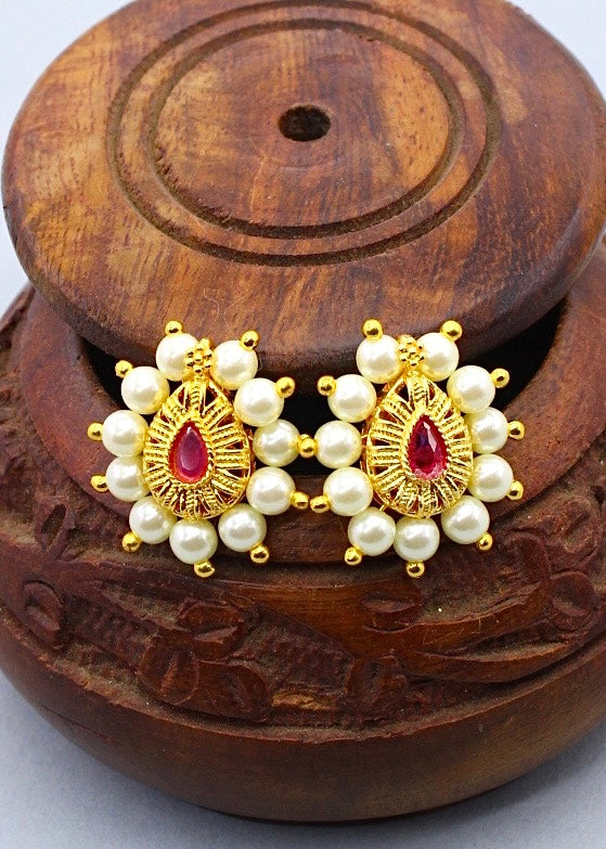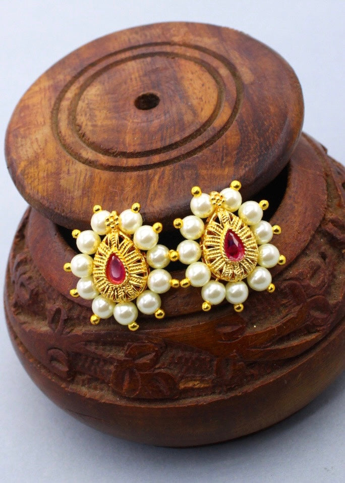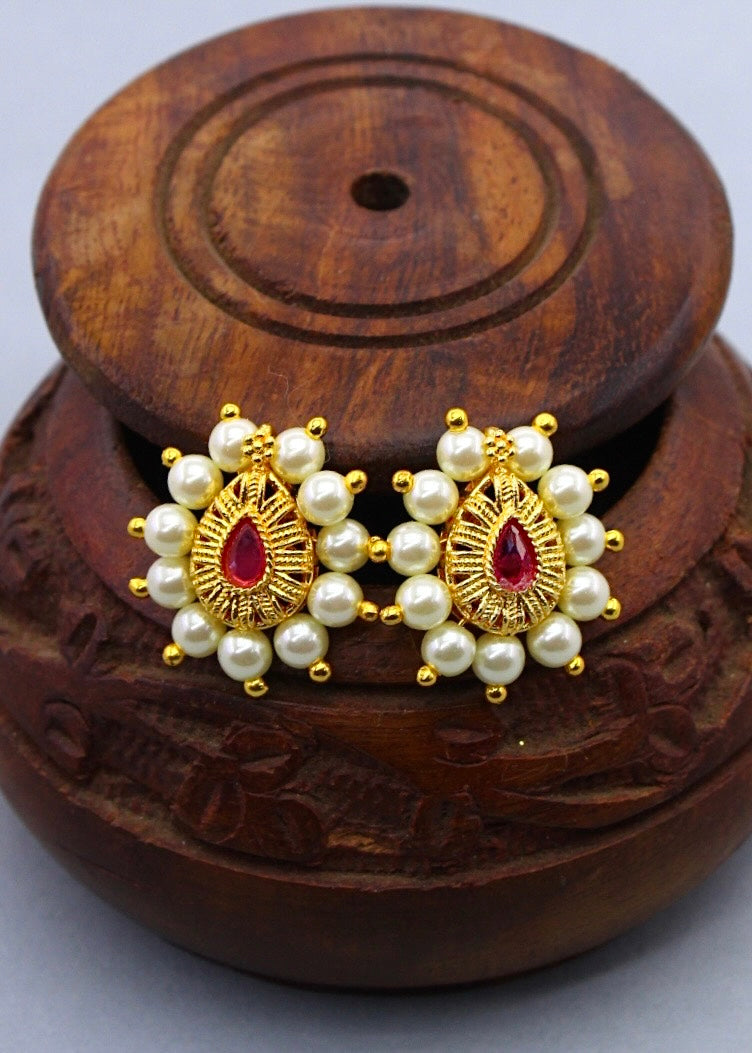 Complete your Maharashtrian look wearing this golden colored bugadi from Sonchafa. studded with pink stone & pearls beads. Crafted from golden polished copper.